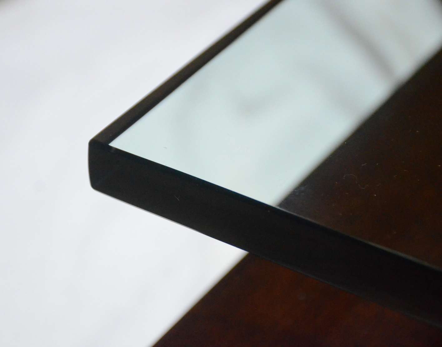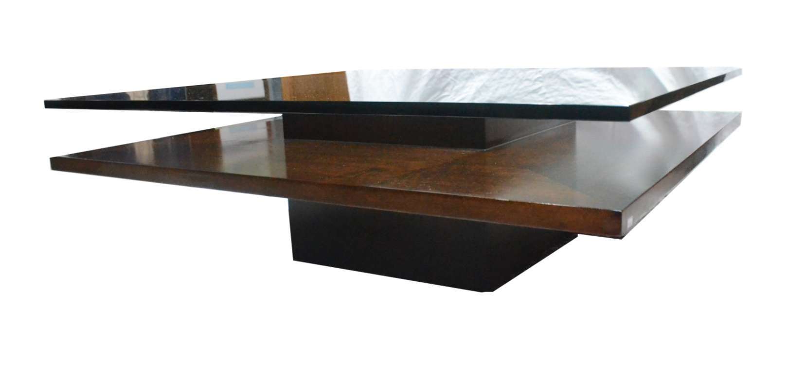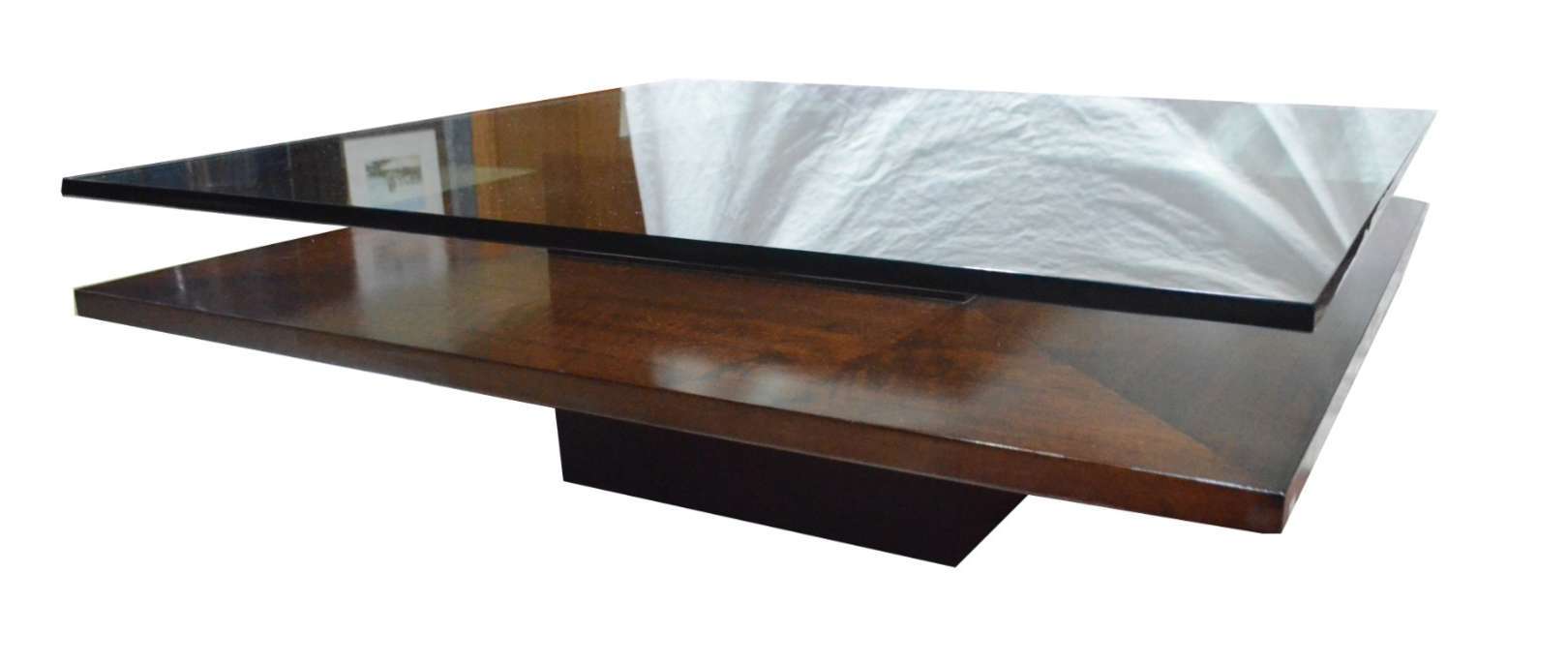 Mesa auxiliar de madeira clara, tampo de vidro e duas gavetas que abrem para ambos os lados, puxadores na forma de co...