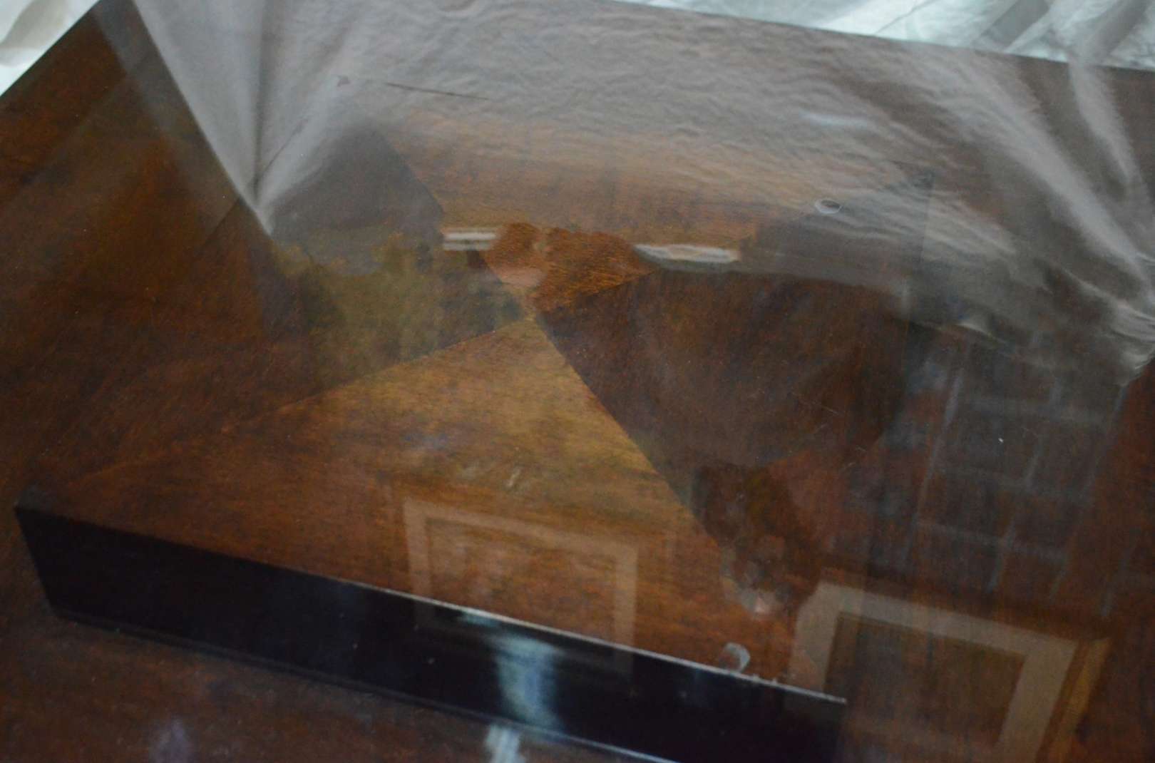 Mesa de madeira clara com tampo retangular trabalhado em parqueterie e uma gaveta, pernas torneadas ligadas por trave...