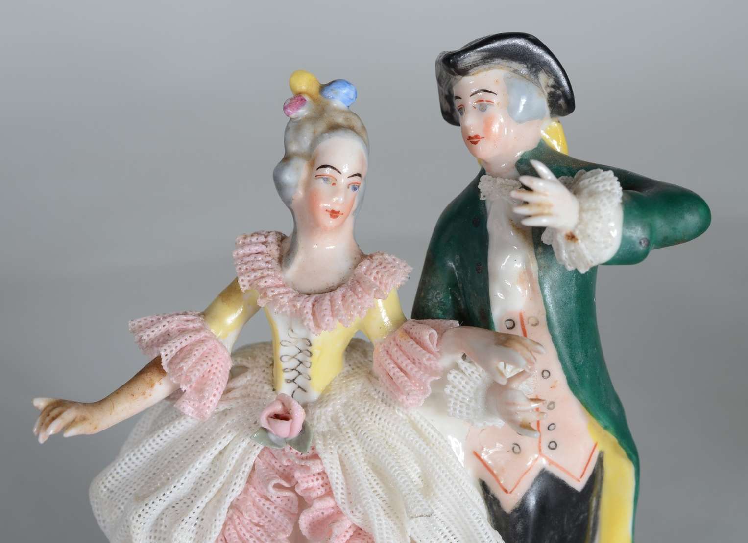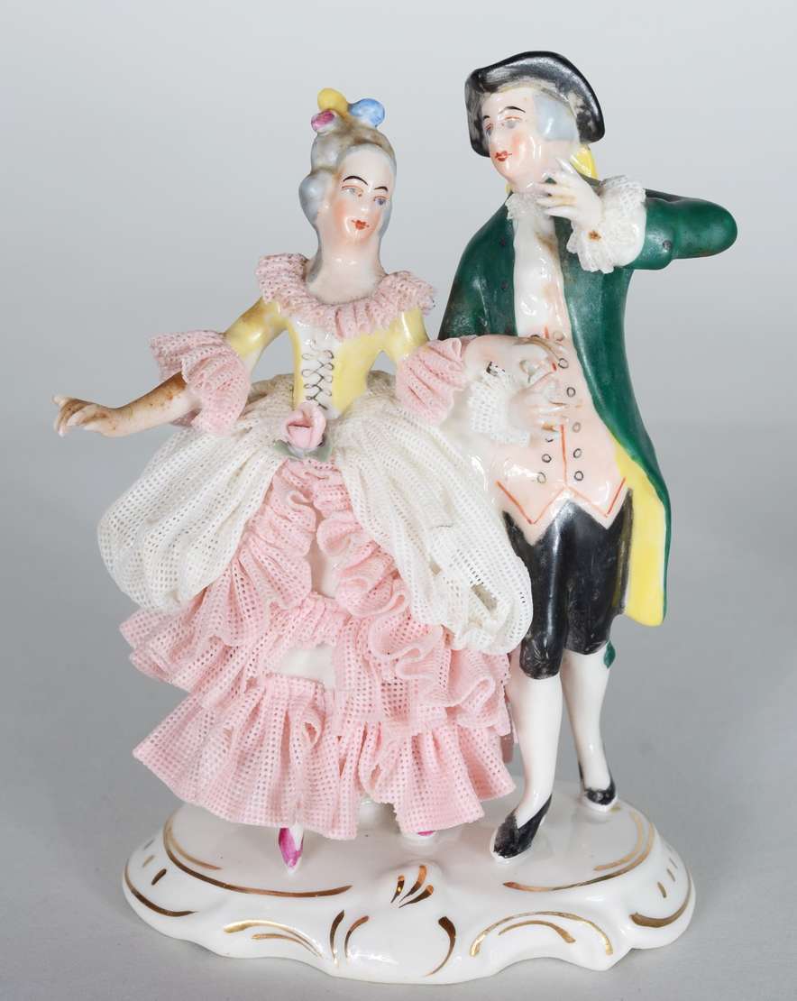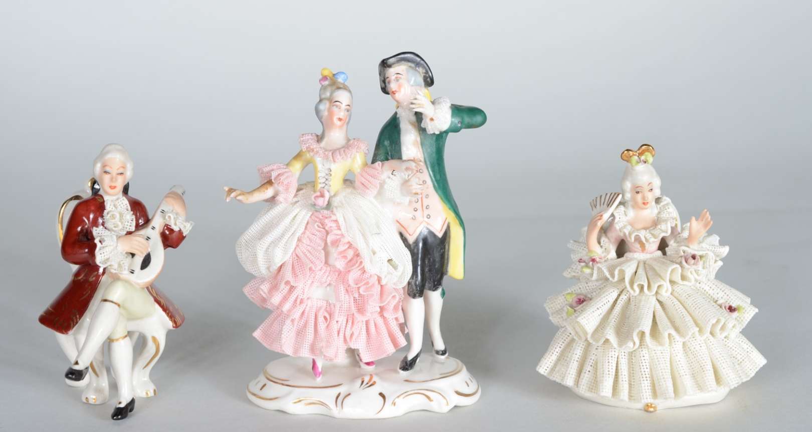 Três esculturas de porcelana policromada representando figuras de nobres. Alguns dedinhos e partes dos babados dos vestidos, quebrados.