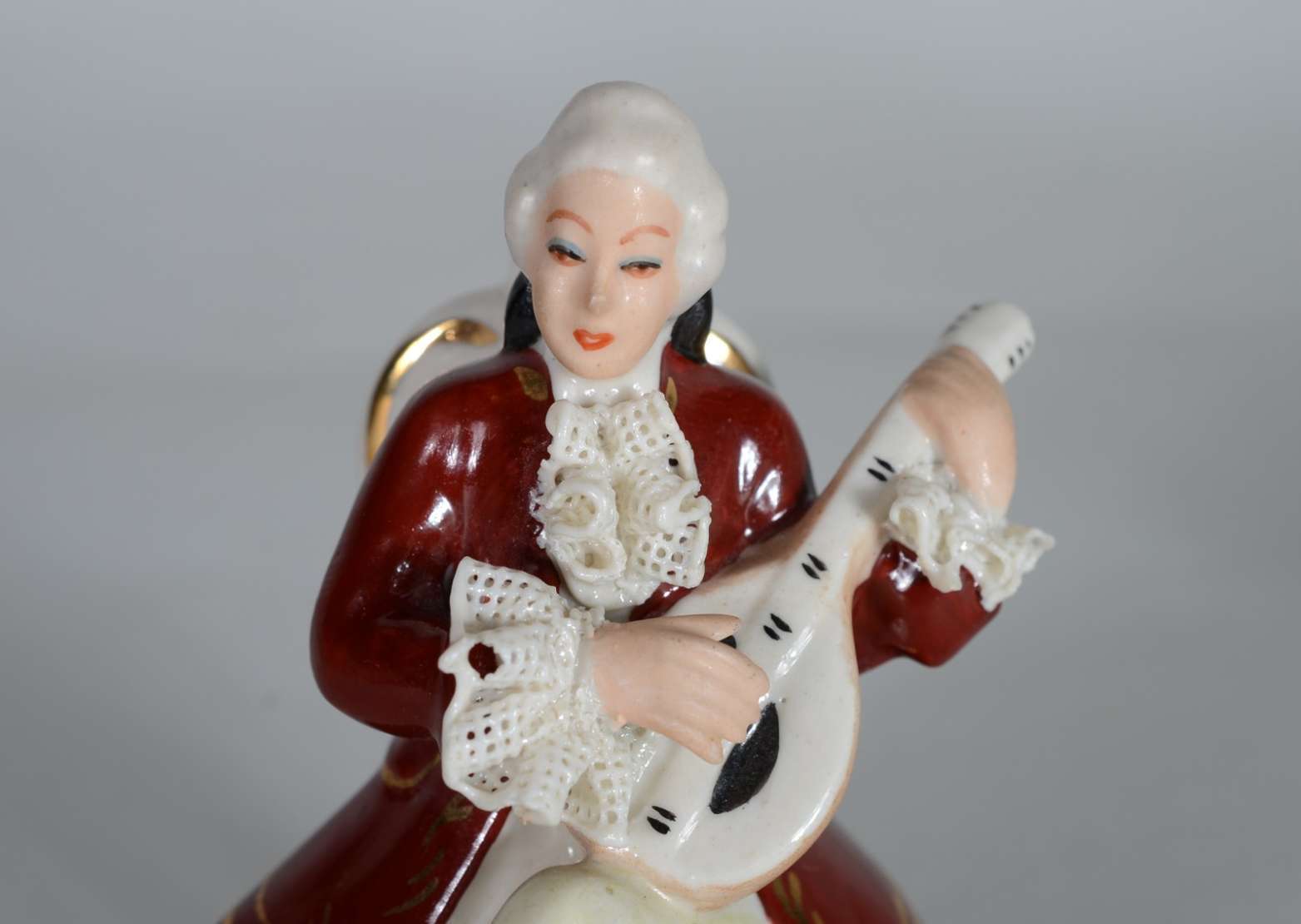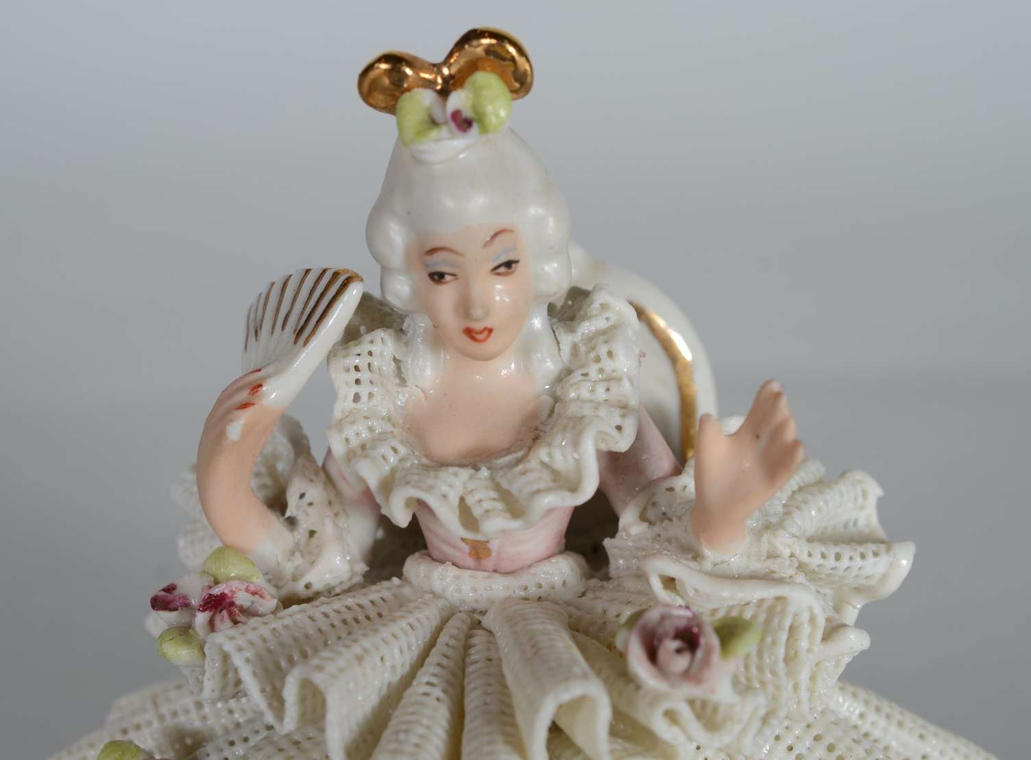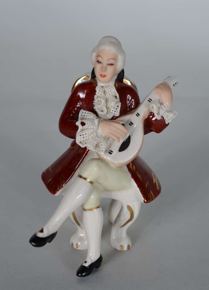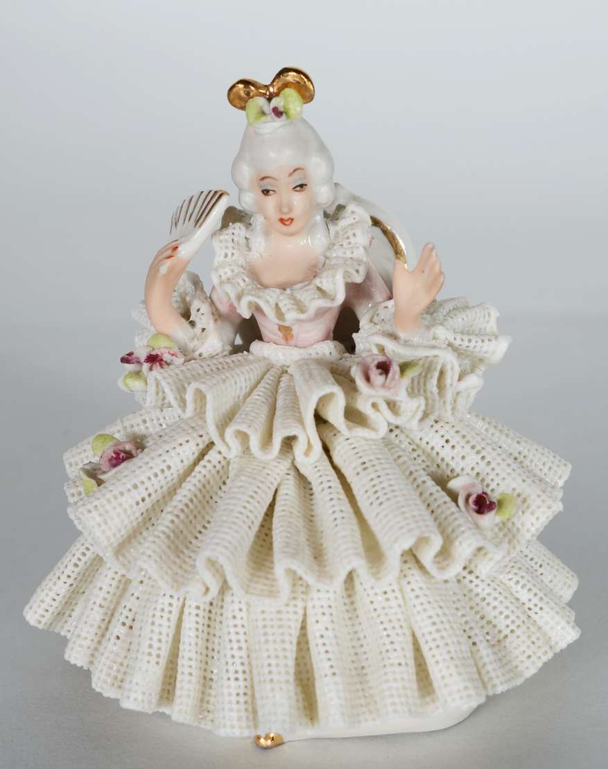 Três esculturas de porcelana policromada representando figuras de nobres. Alguns dedinhos e partes dos babados dos vestidos, quebrados.