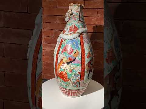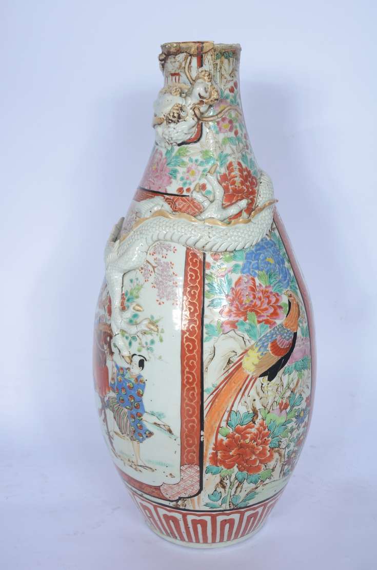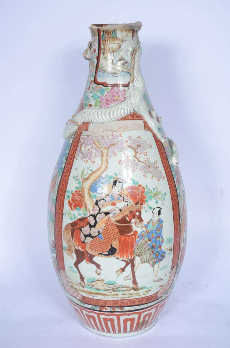 Par de antigos vasos de porcelana oriental, decorados com figuras de guerreiros, gueixas e sábios em policromia sobre...