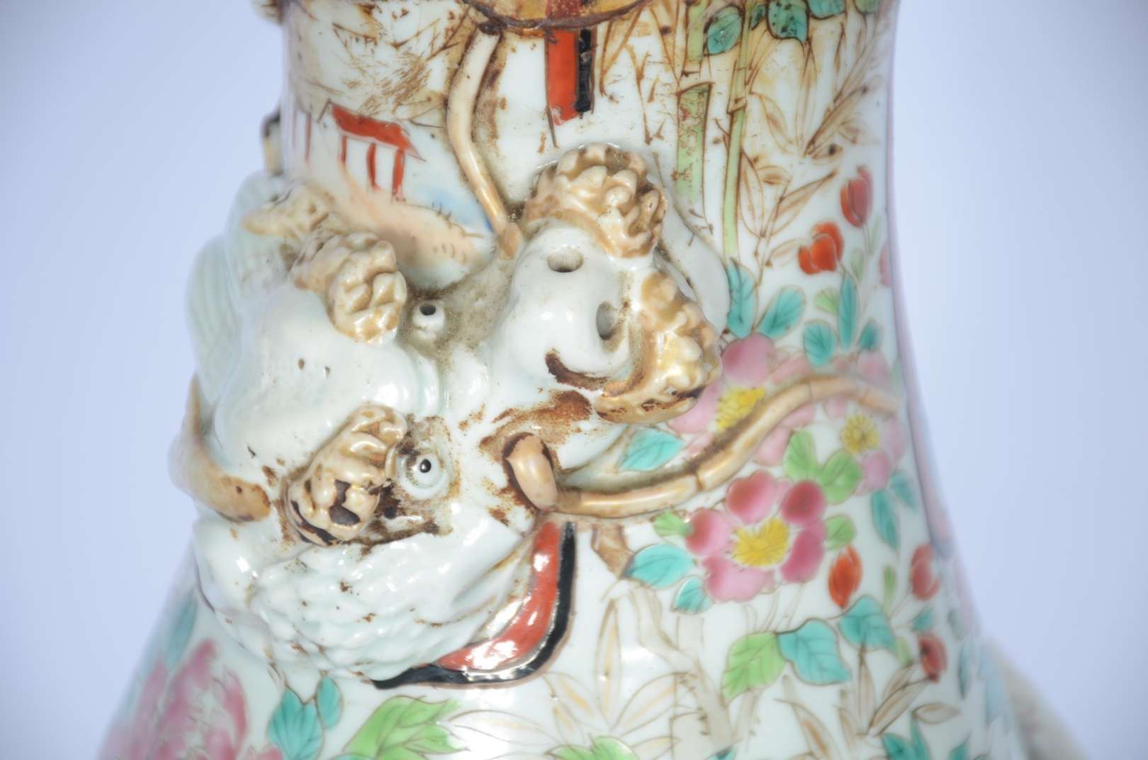 Par de antigos vasos de porcelana chinesa Celadon com pássaros e flores esmaltadas em relevo policromado. Bases na fo...