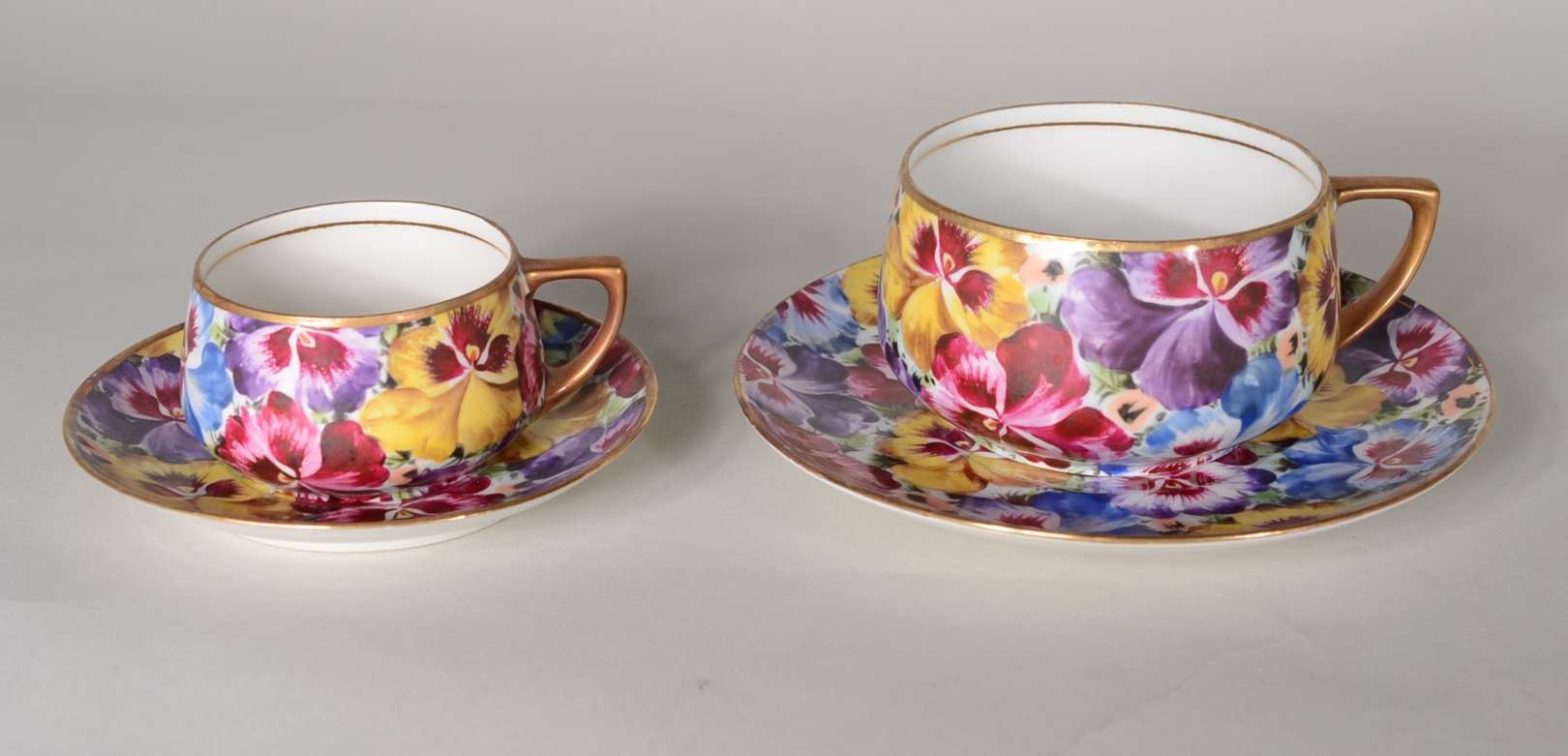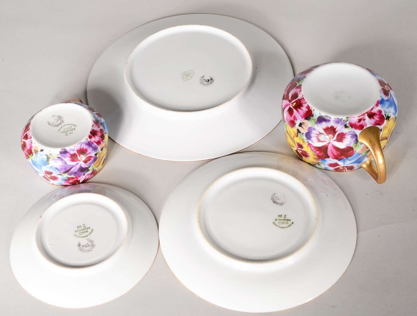 Serviço de chá e café de porcelana tcheca, decoração floral em policromia, composto de: 6 xícaras de chá com pires, 6 xícaras de café com pires e 6 pratos de sobremesa. Total: 18 peças.