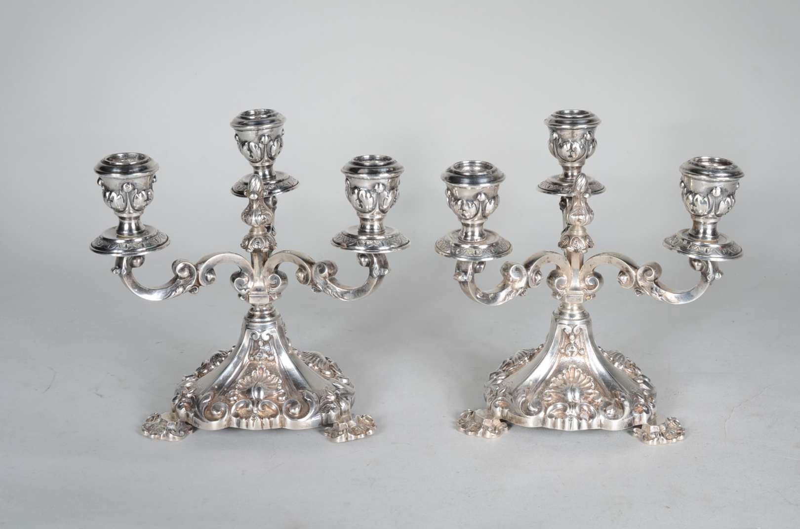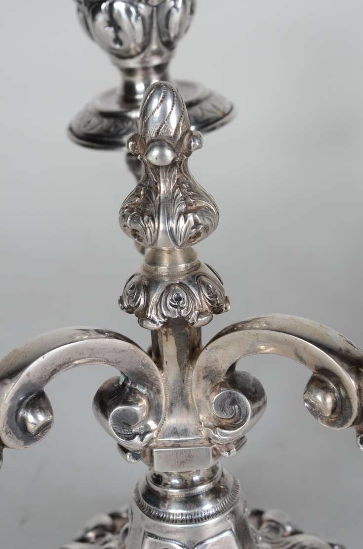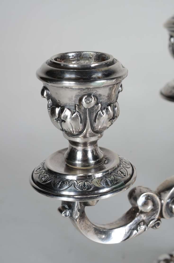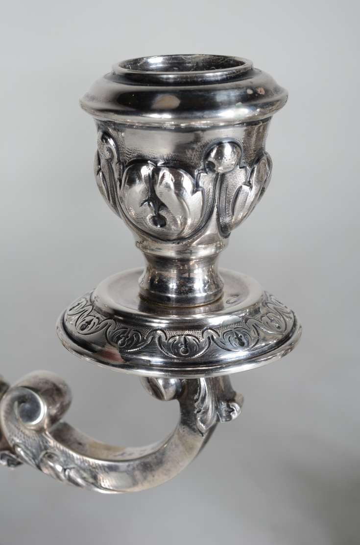 Par de candelabros de prata contraste 800 mls. para 5 velas cada, base oitavada. Peso da prata: 1350 g. Uma das haste...