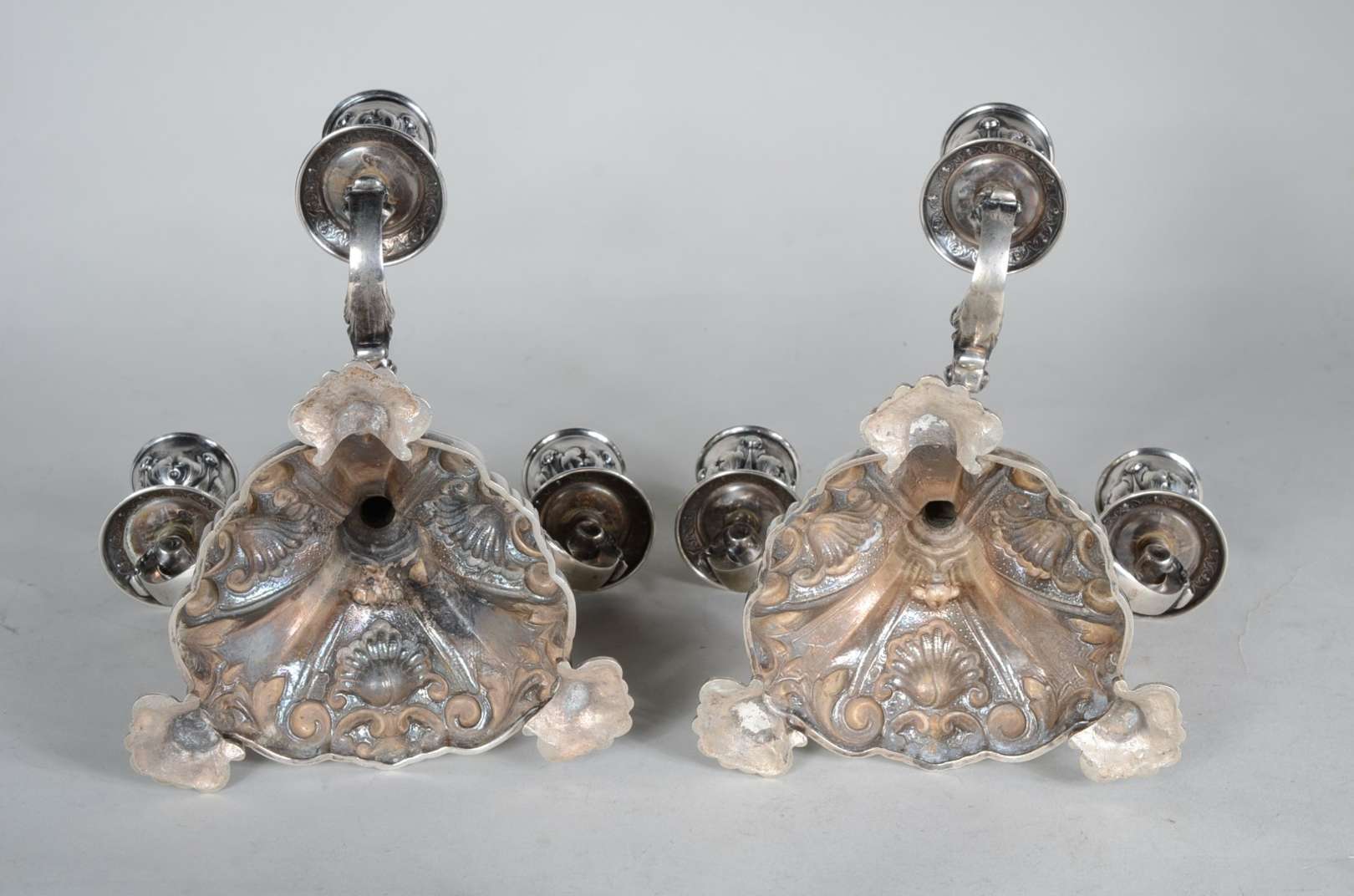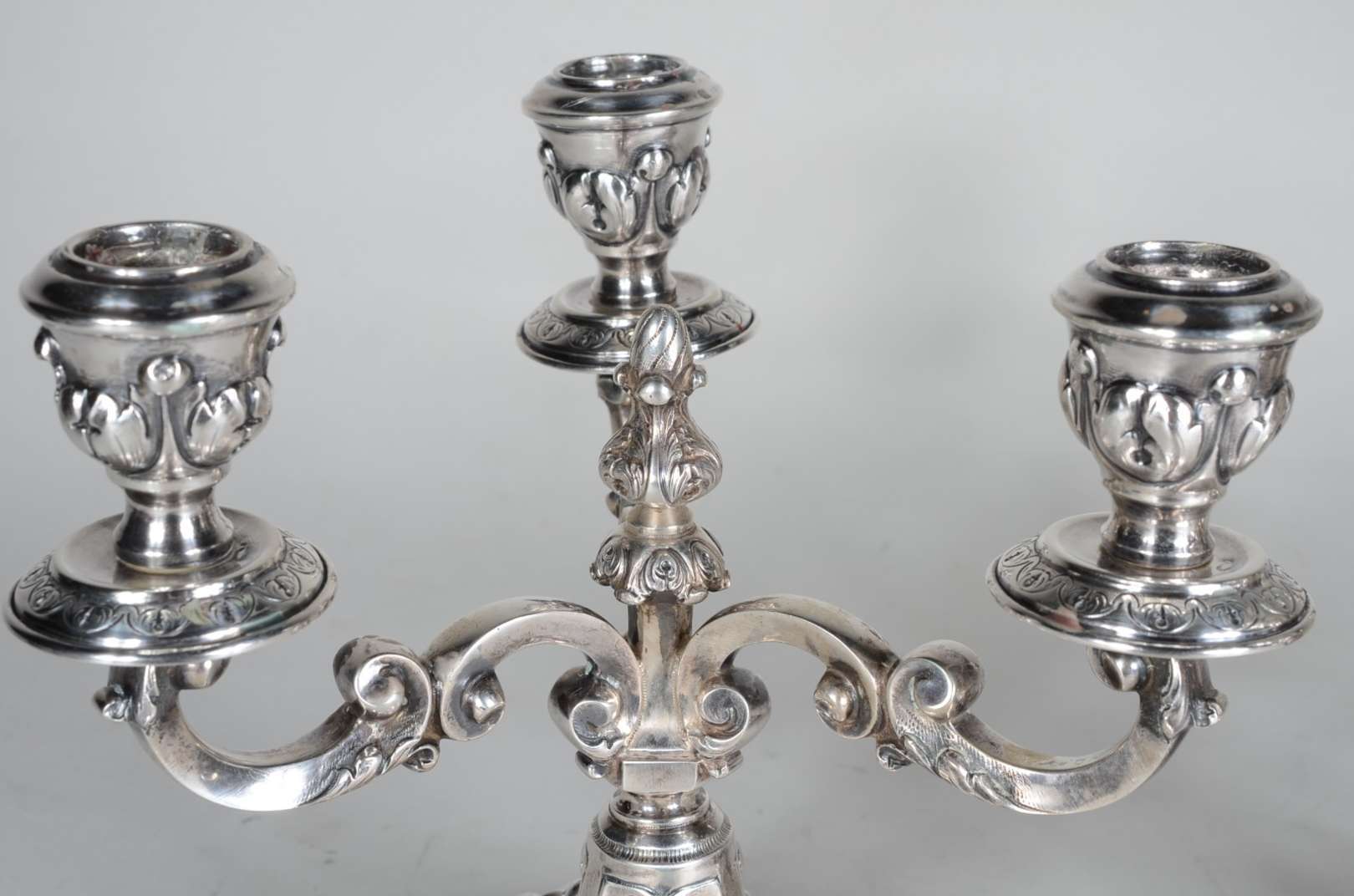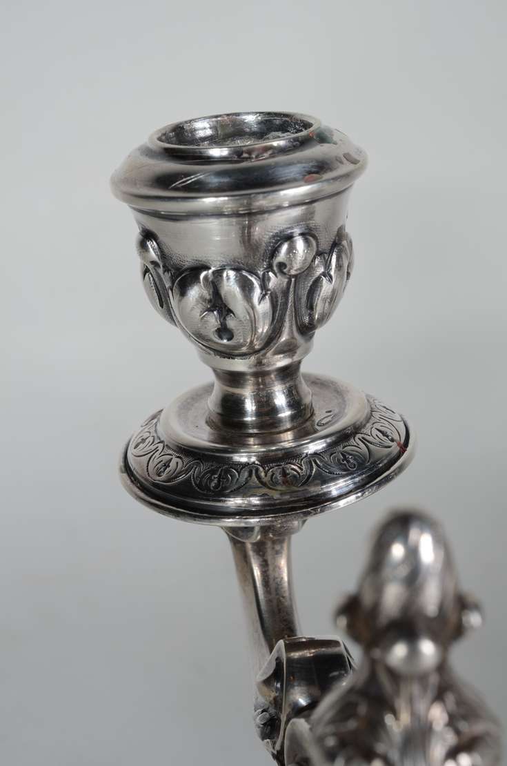 Par de candelabros de prata contraste 800 mls. para 5 velas cada, base oitavada. Peso da prata: 1350 g. Uma das haste...