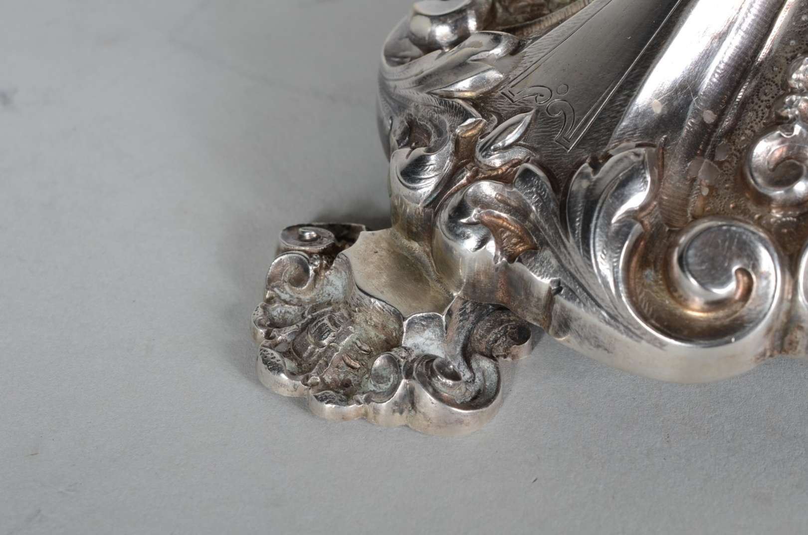 Abatjour de prata portuguesa contraste Javali, base em forma de coluna com borda perolada, cúpula cinzelada com guirl...