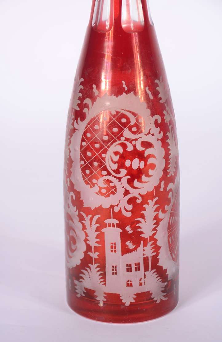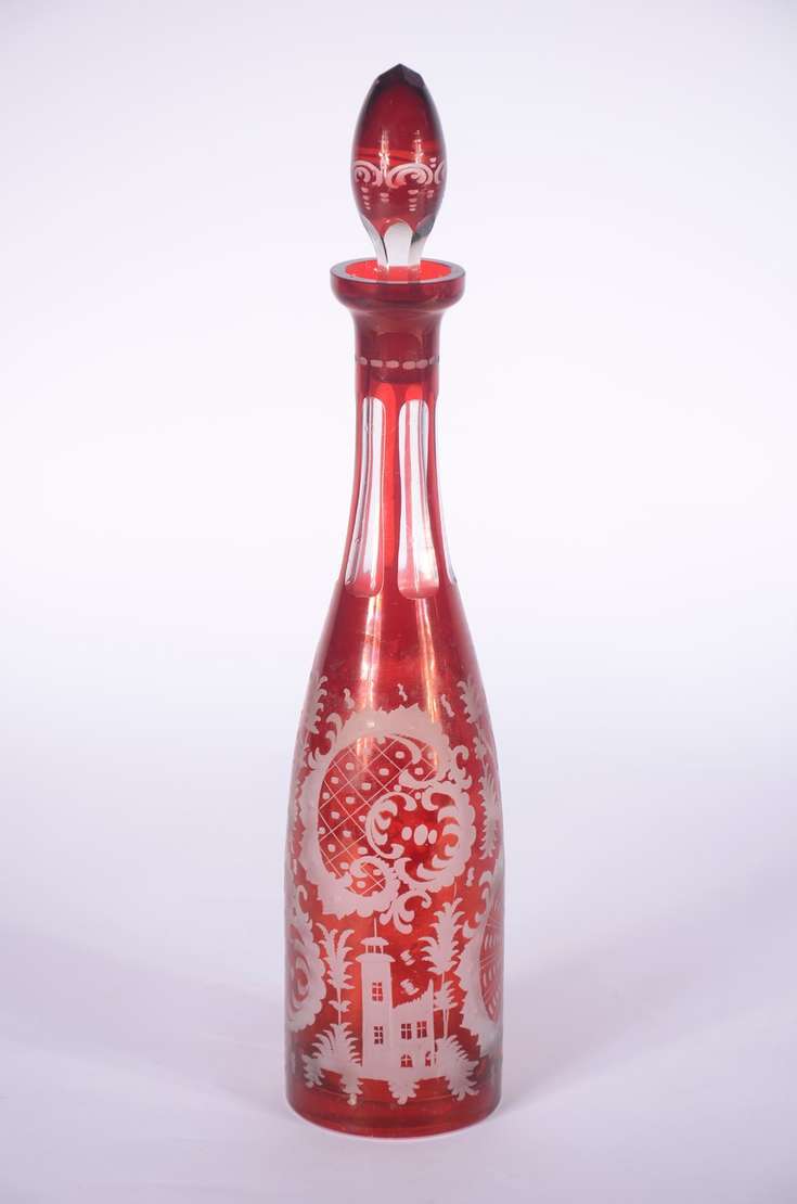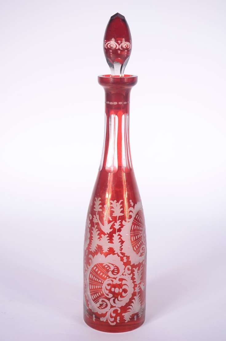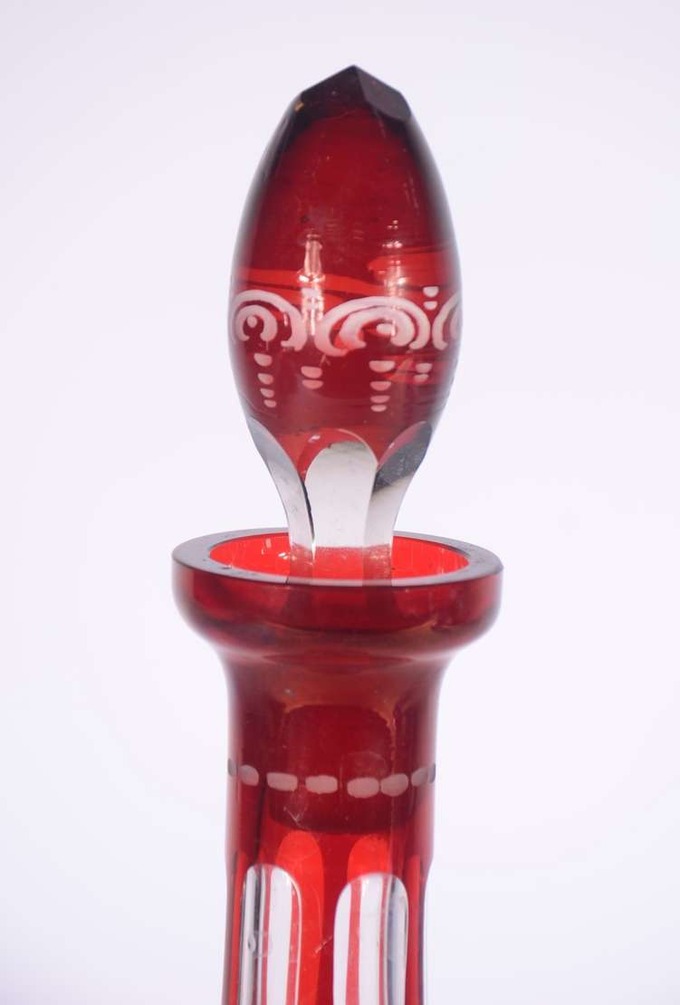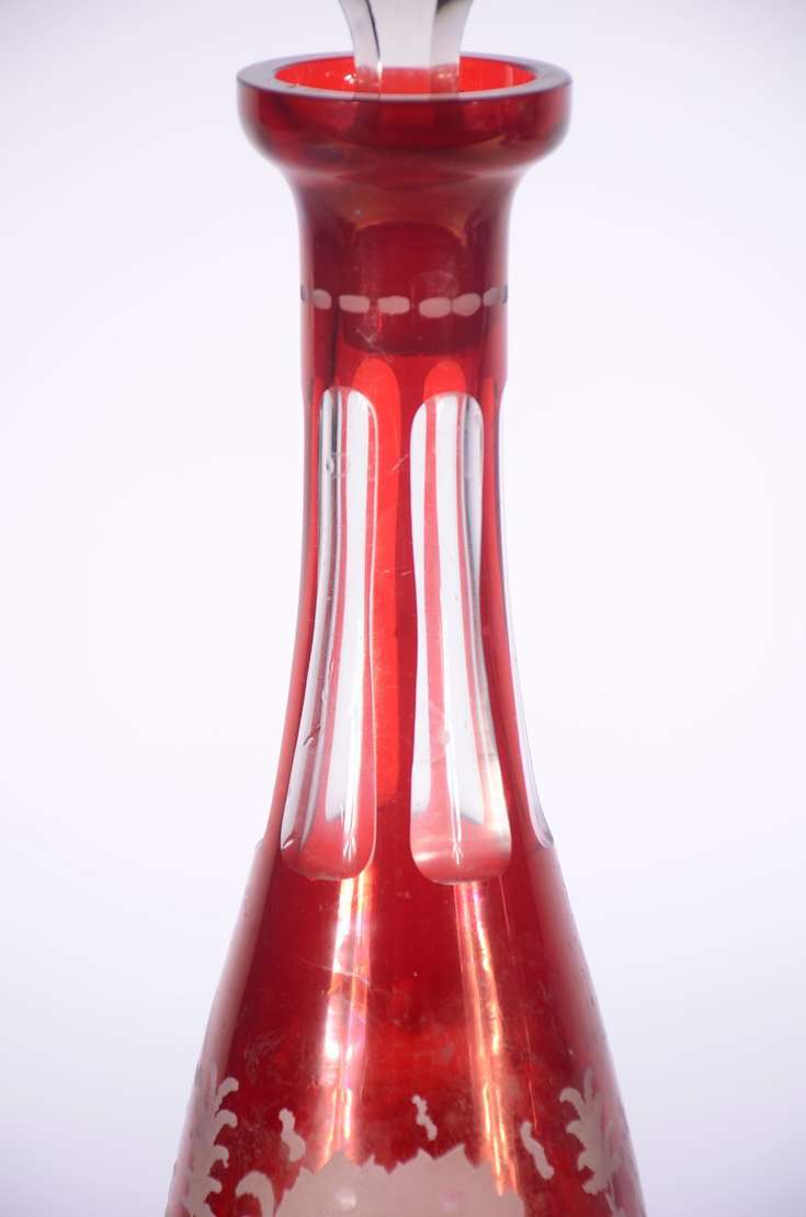 Conjunto com jarra de cristal facetada e 5 cálices para vinho de cristal, assinados Moser. (A jarra não tem marca).