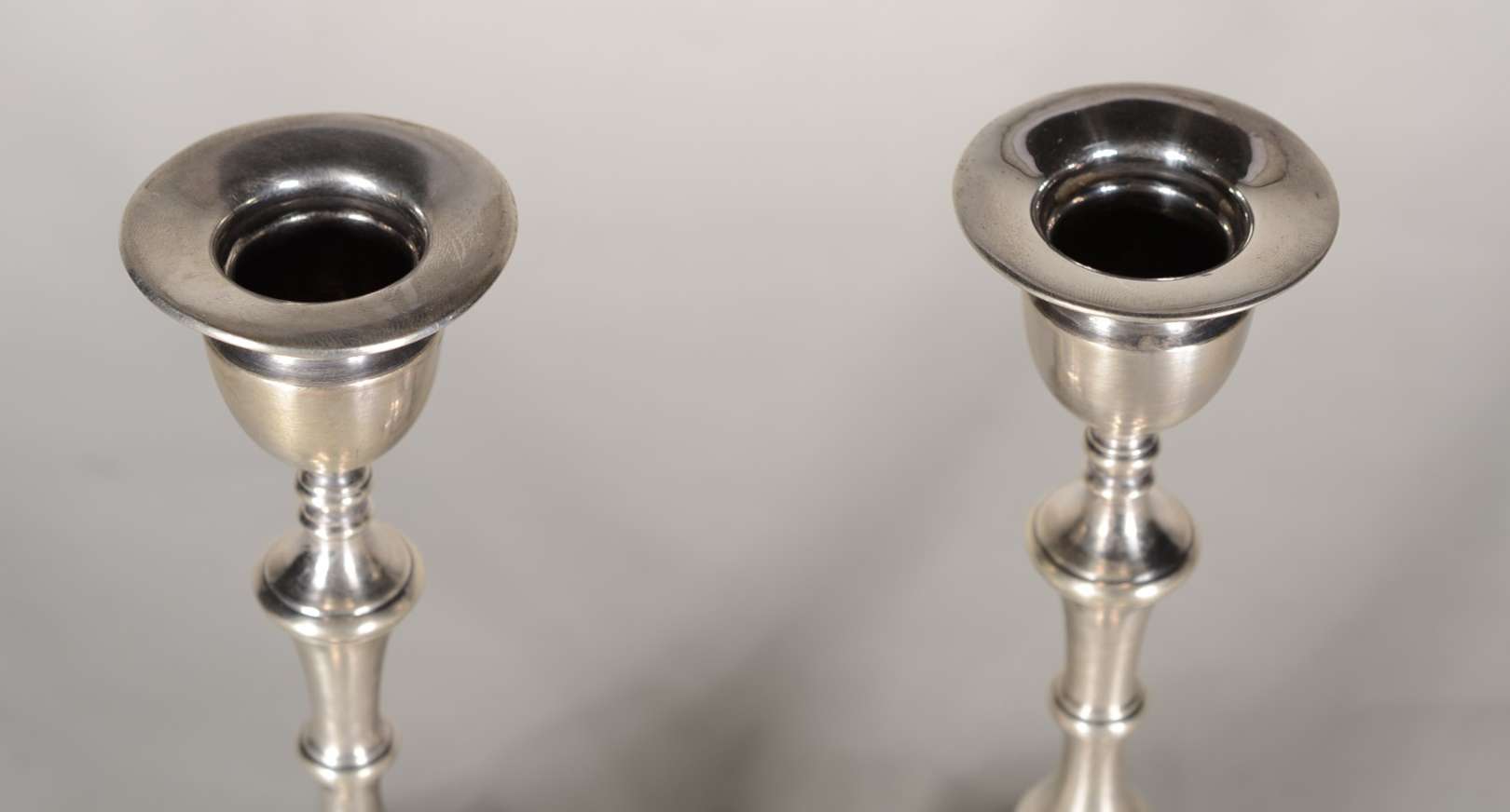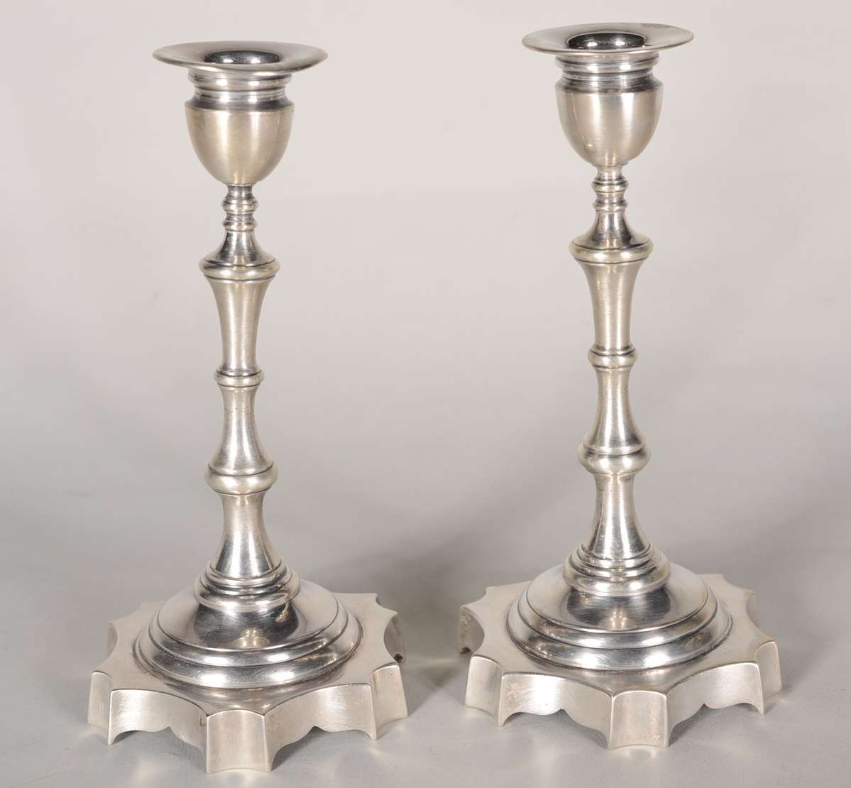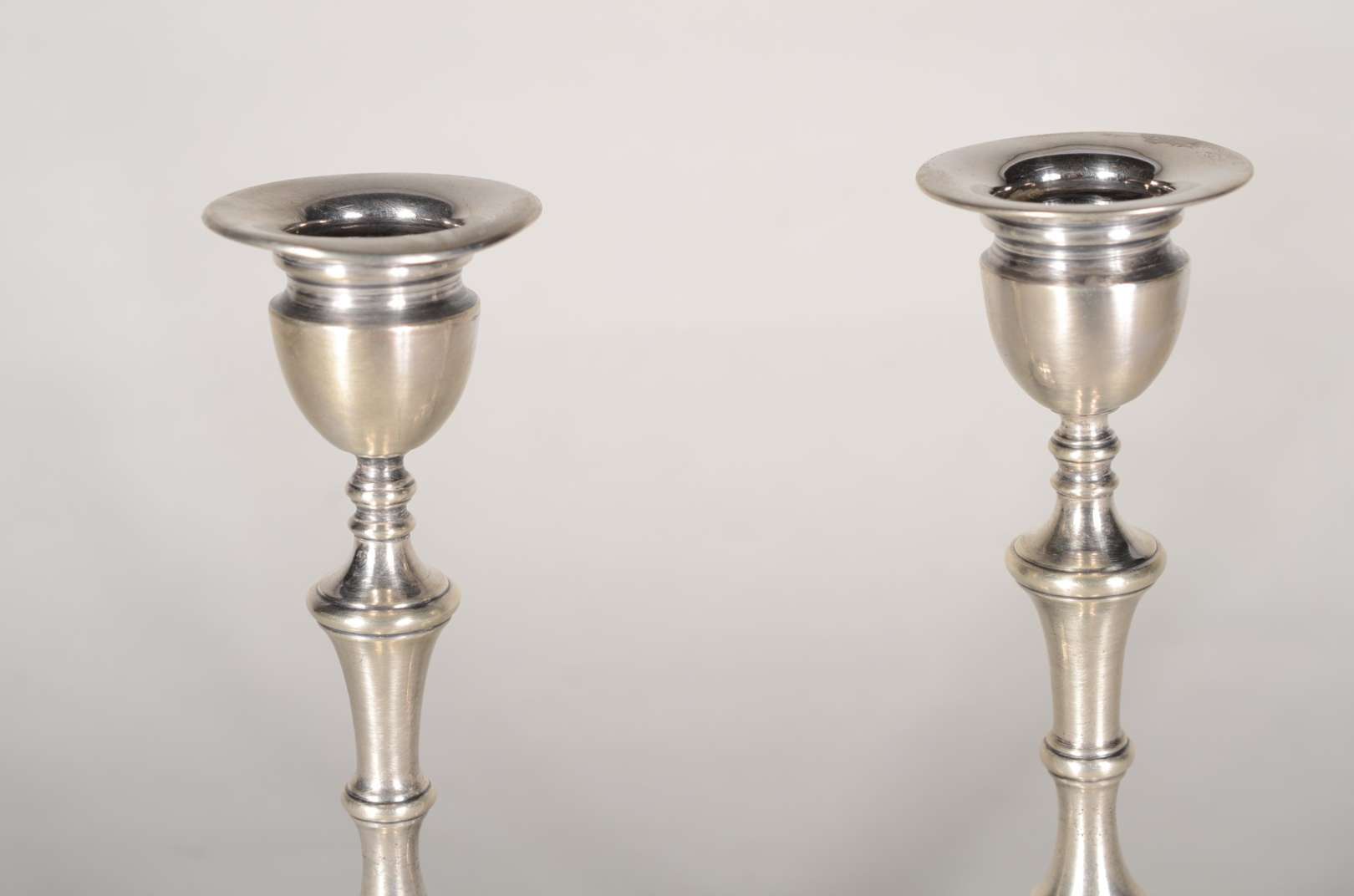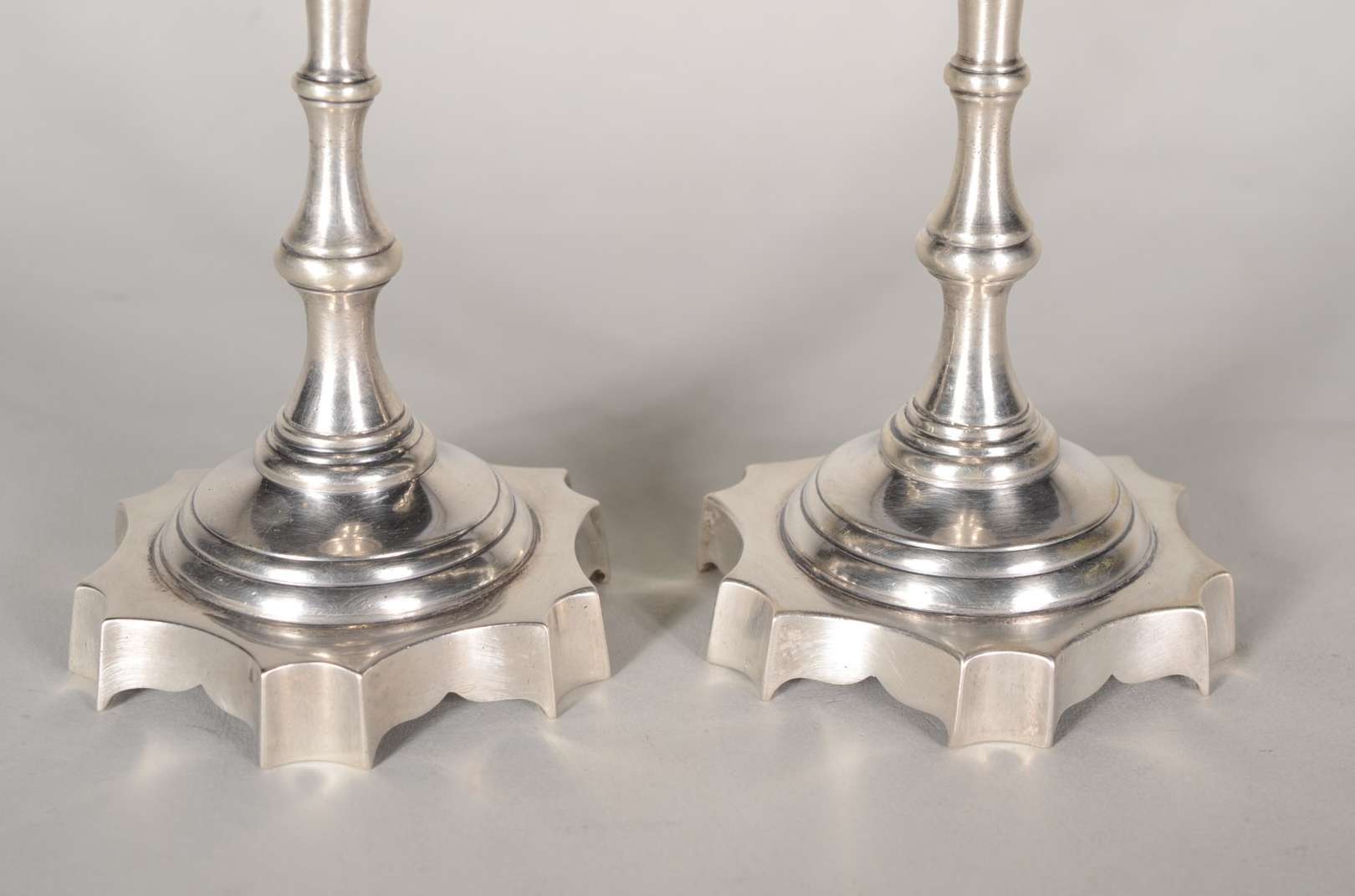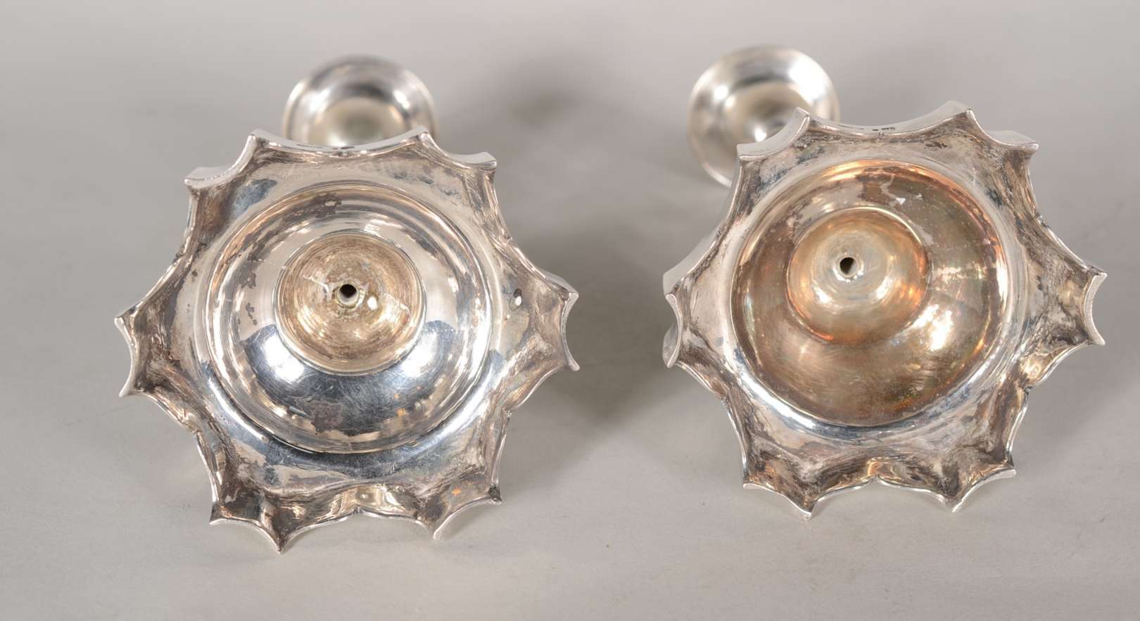 Par de candelabros de prata contrastada para 3 velas cada, pés em forma de concheados. Peso da prata: 1280 g. (Por mo...
