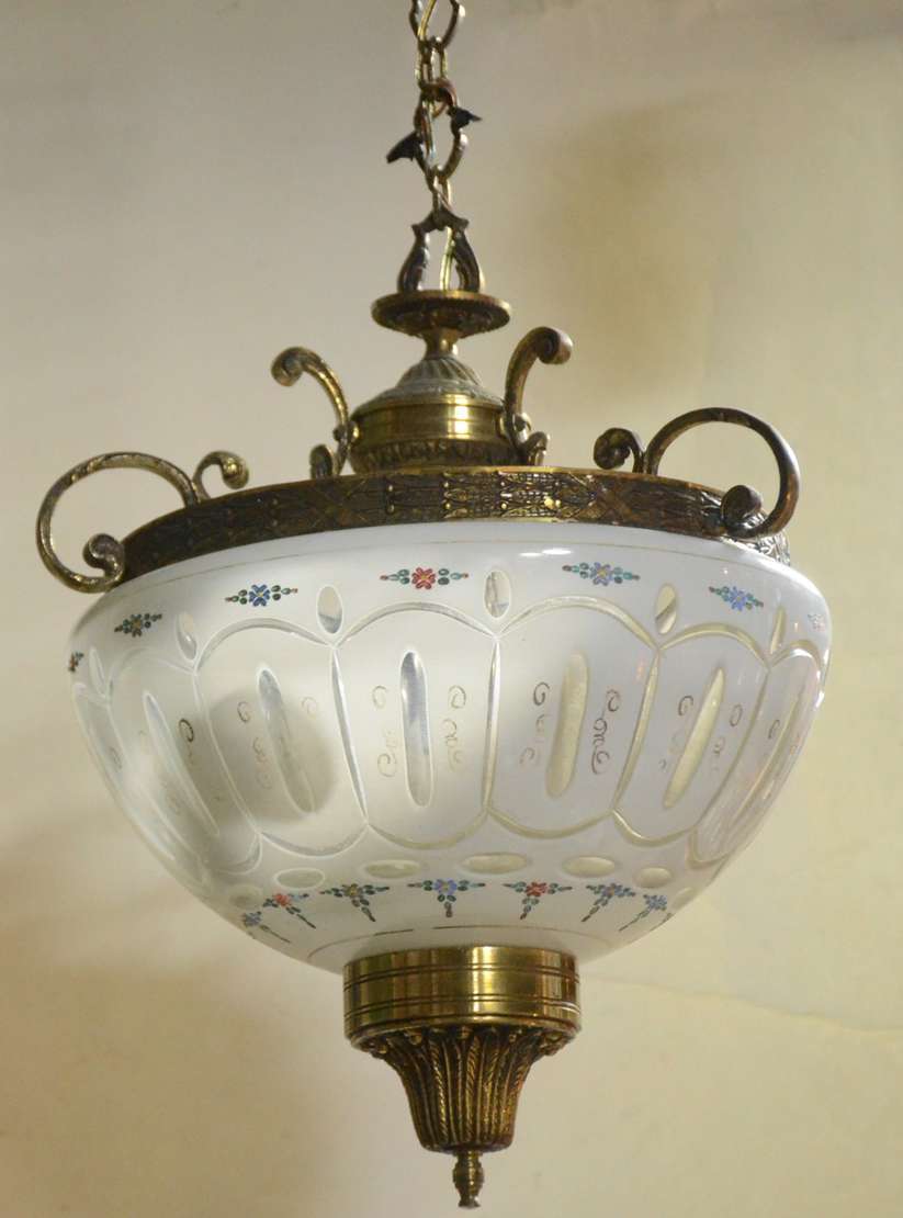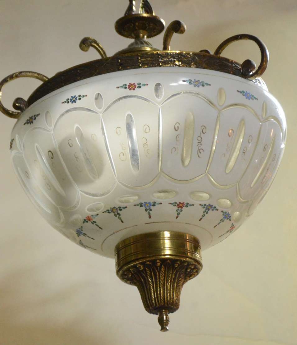 Luminária de metal para 5 luzes com tulipas de vidro.