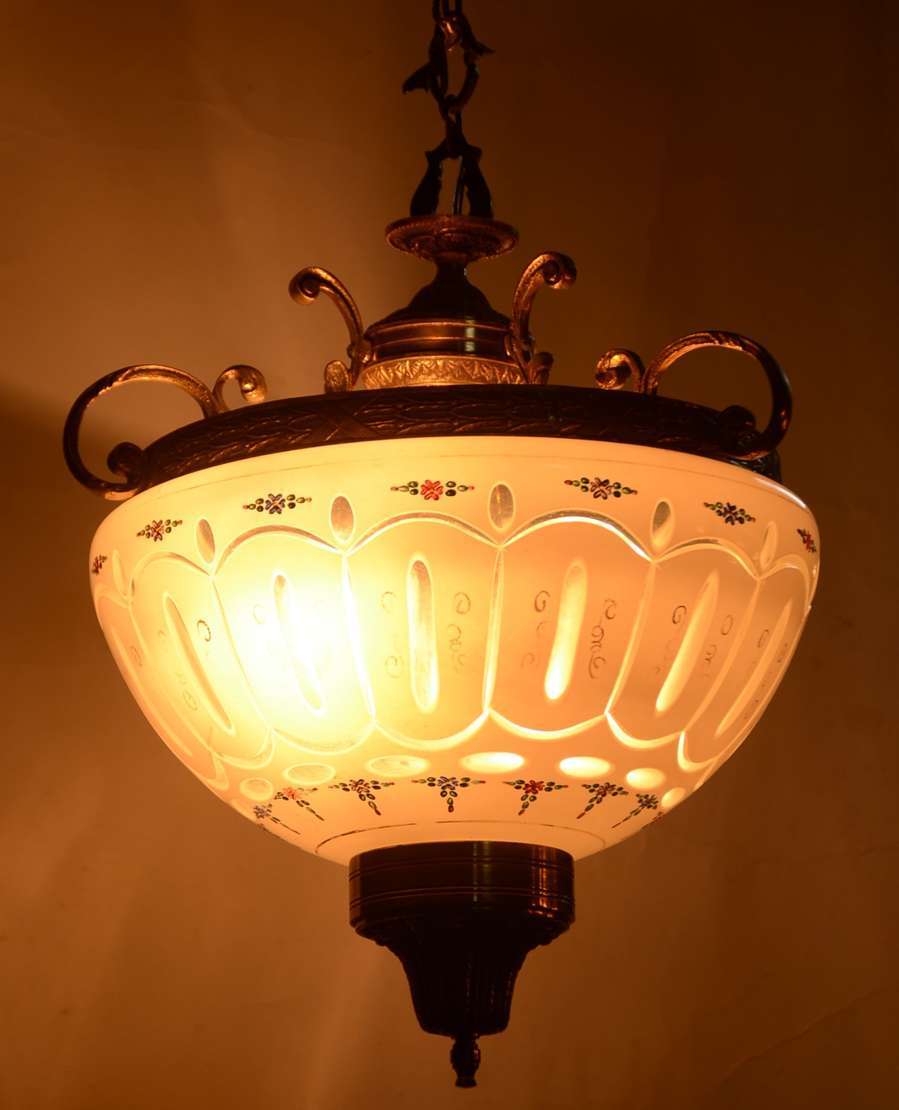 Luminária marroquina de metal dourado, globo com placas de vidro.
