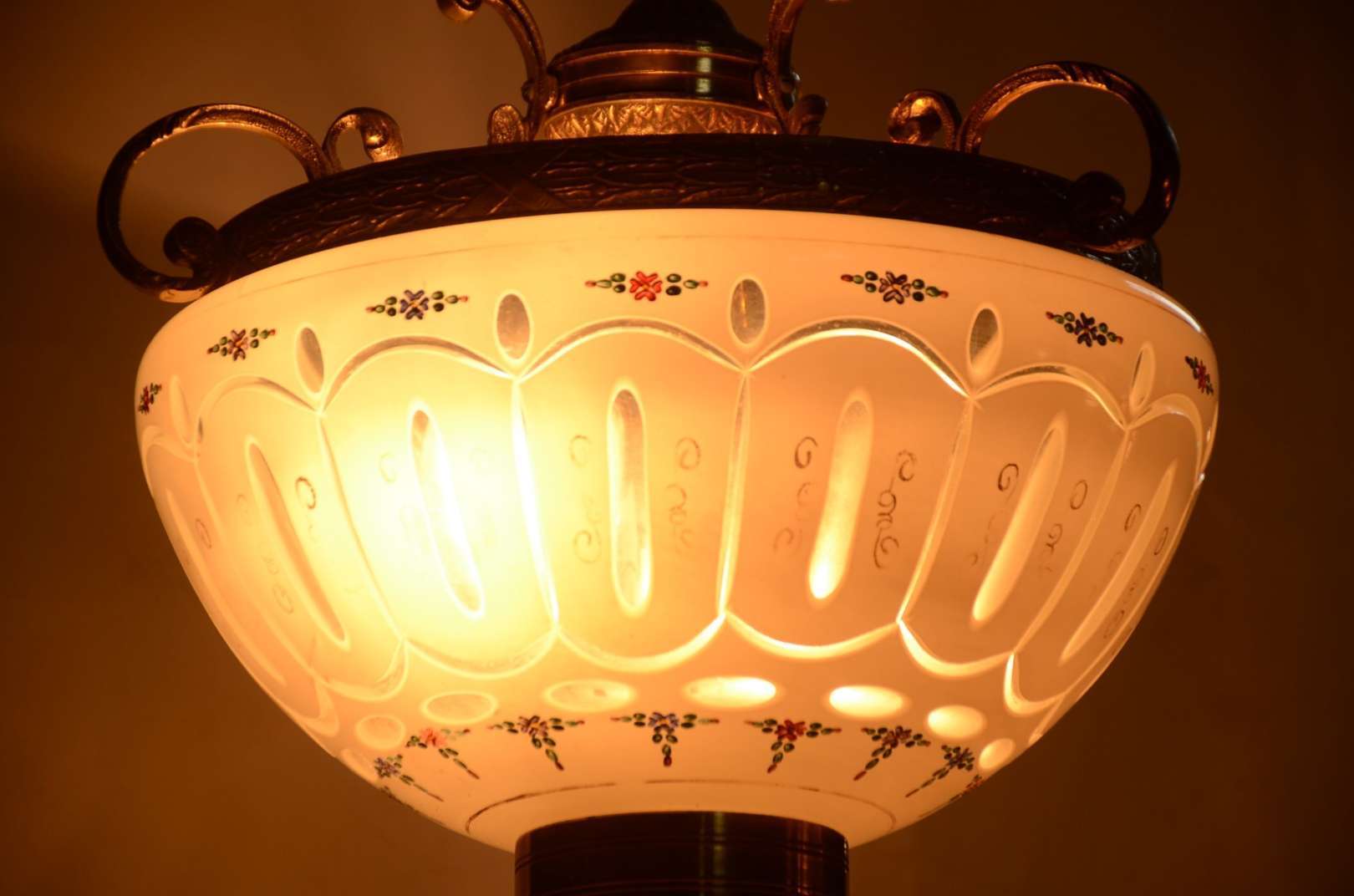 Abatjour na forma de ânfora de bronze e porcelana, decorado com figuras angelicais em policromia sobre fundo azul.
