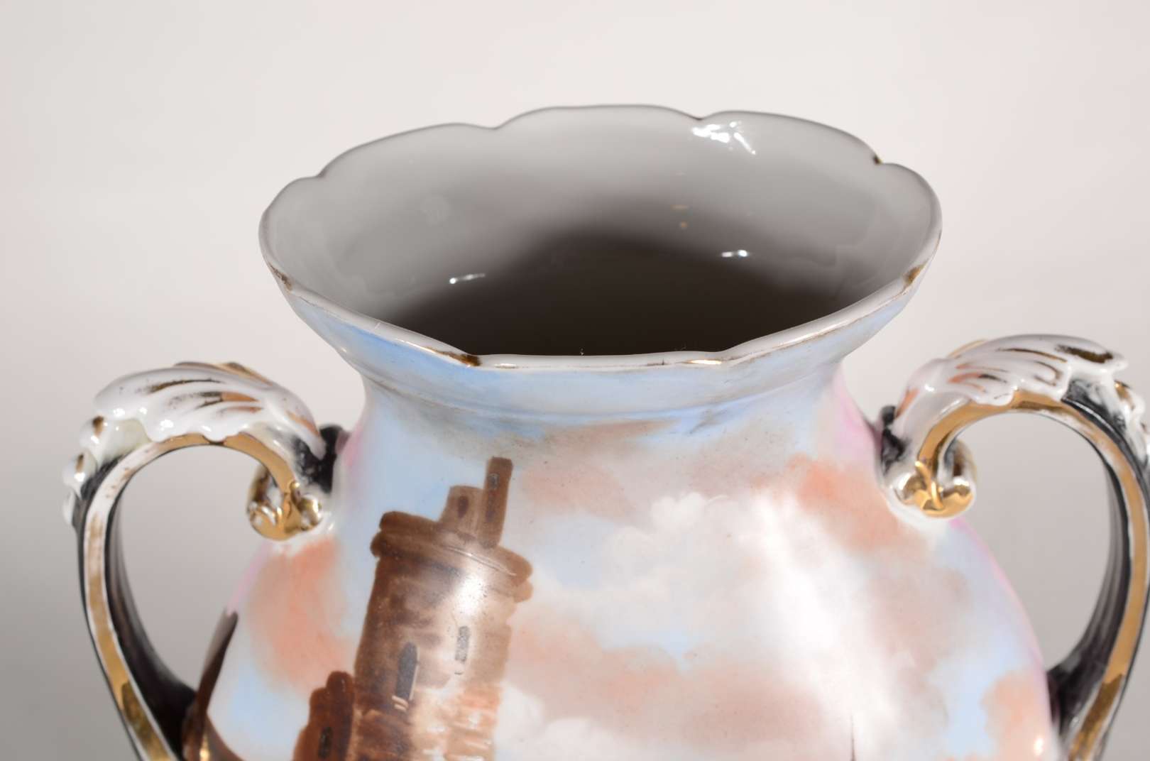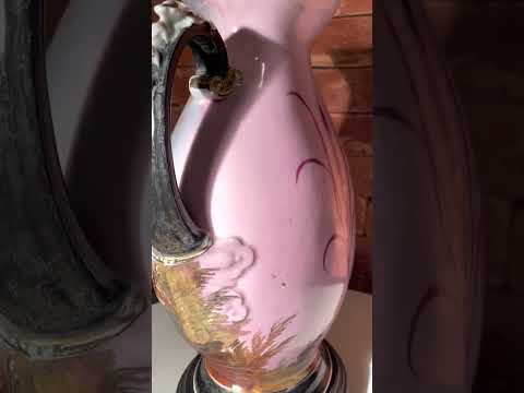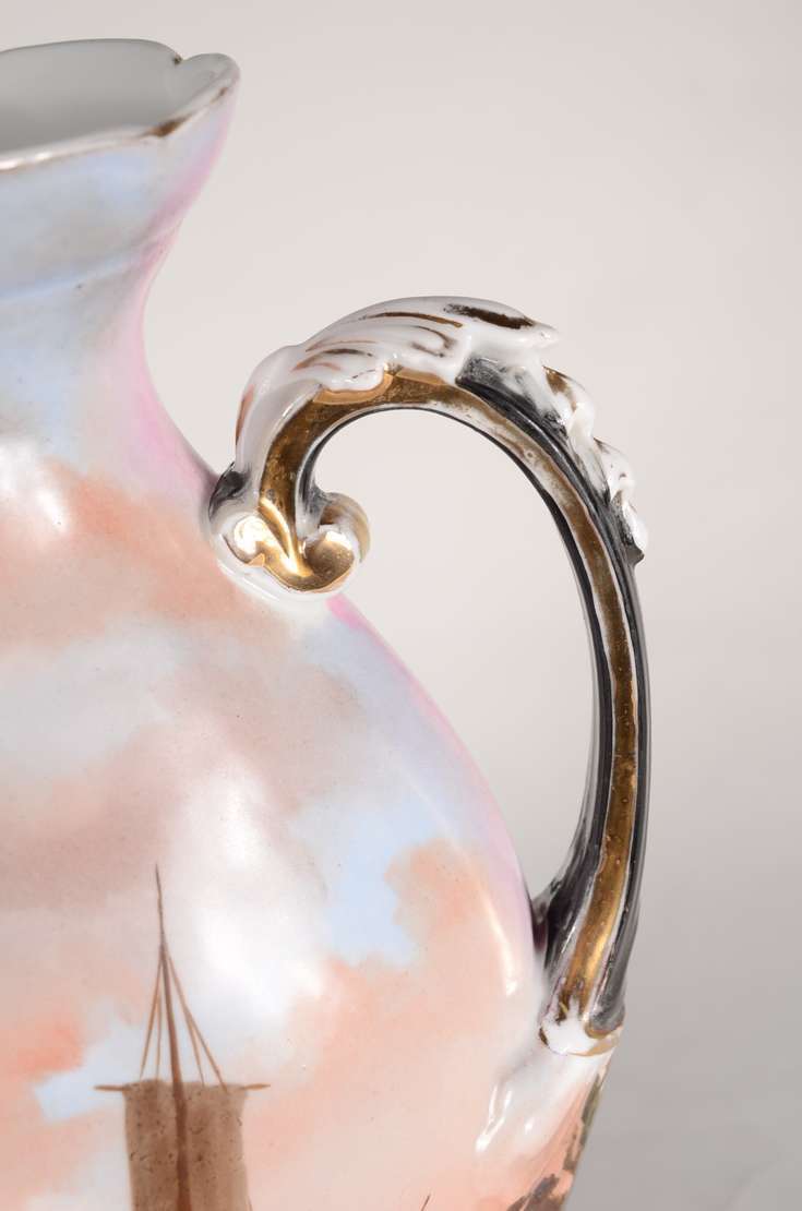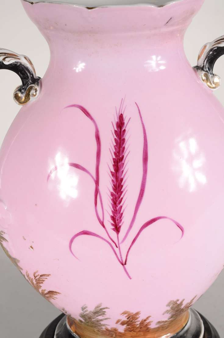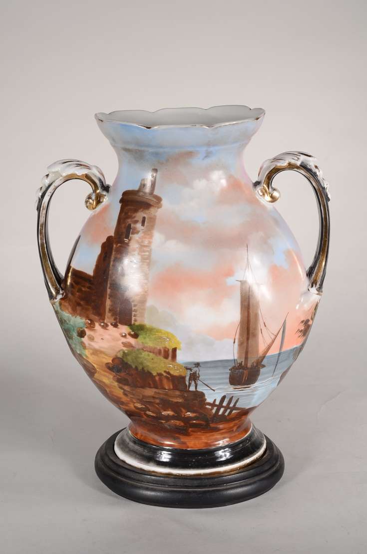 Par de vasos de porcelana oriental decorados com flores, folhas e gueixas em policromia. Um deles com o bocal quebrad...