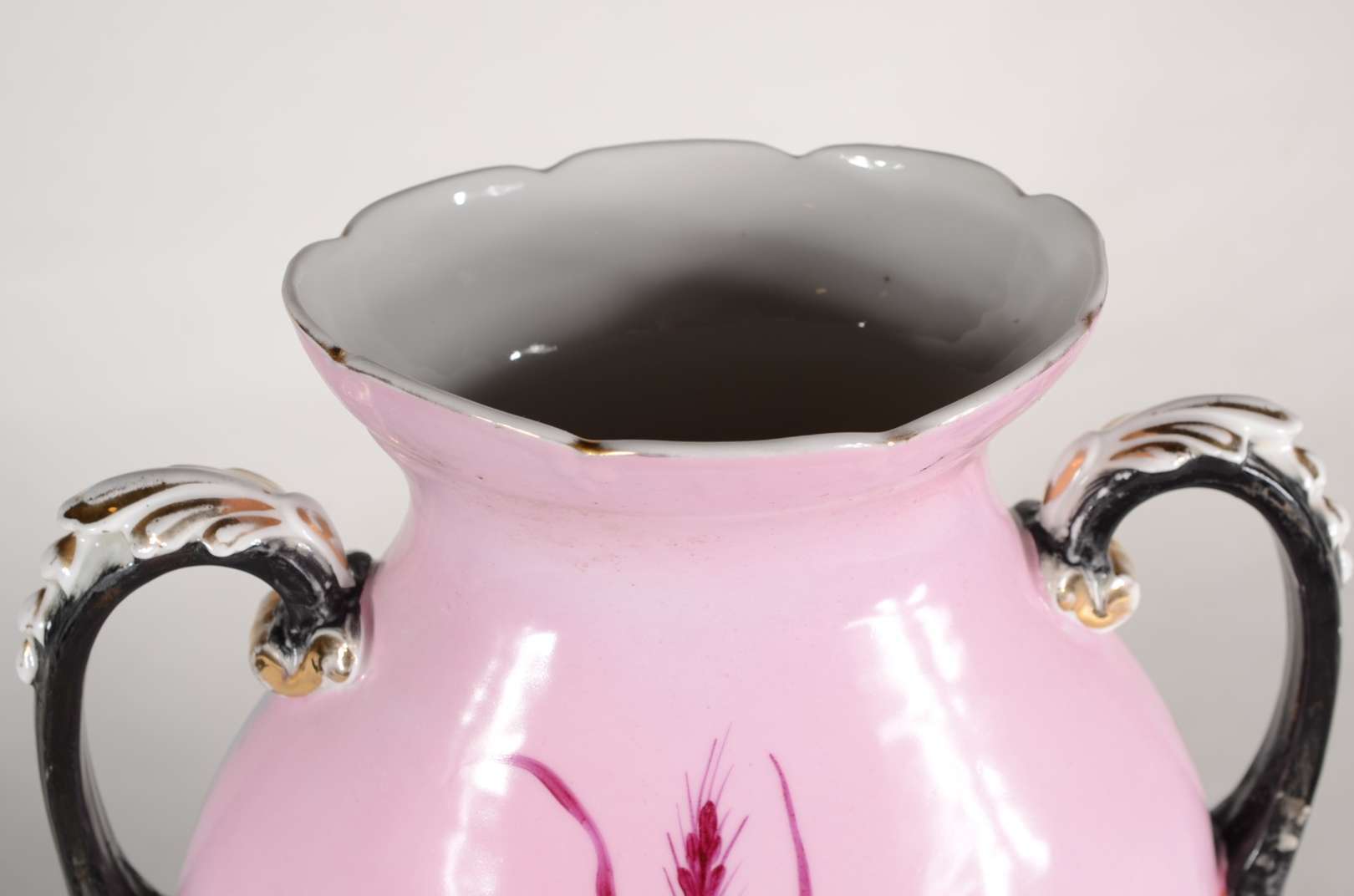 Vaso decorativo de cerâmica na cor esverdeada com pegas laterais na forma de palmeiras.