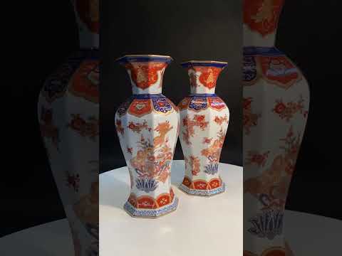 Par de vasos de porcelana oriental decorados com flores, folhas e gueixas em policromia. Um deles com o bocal quebrad...