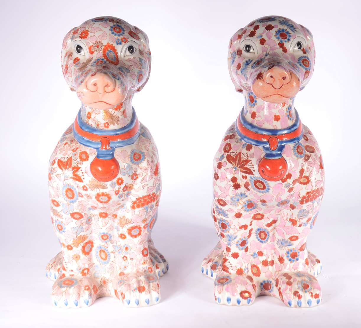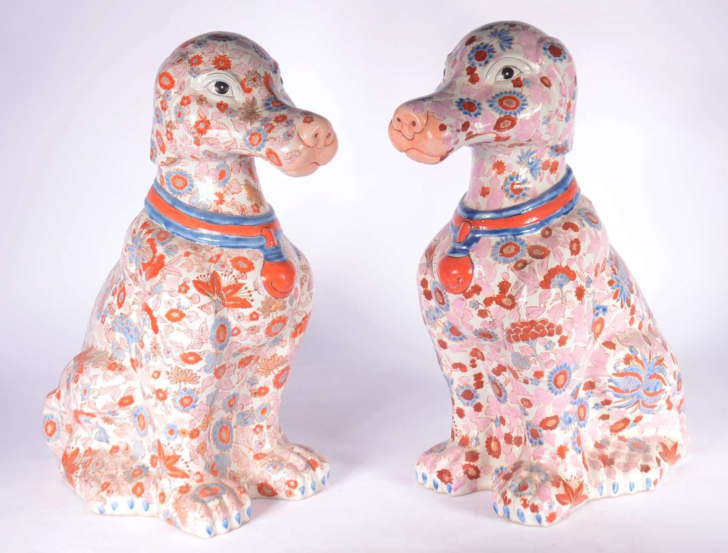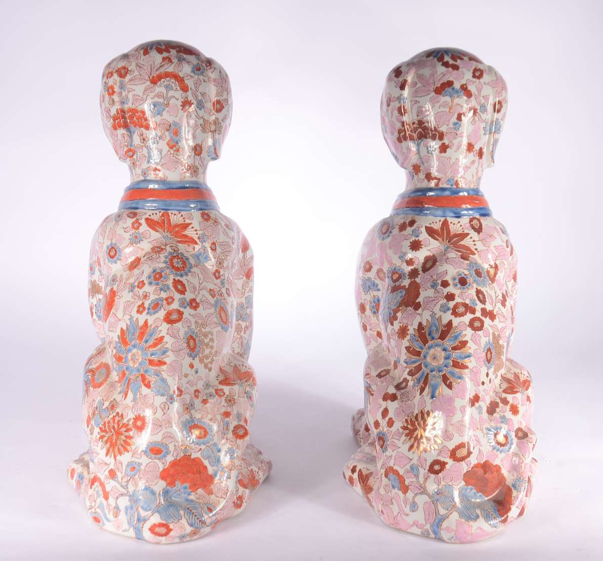 Duas esculturas de porcelana policromada representando casal de coelhos.