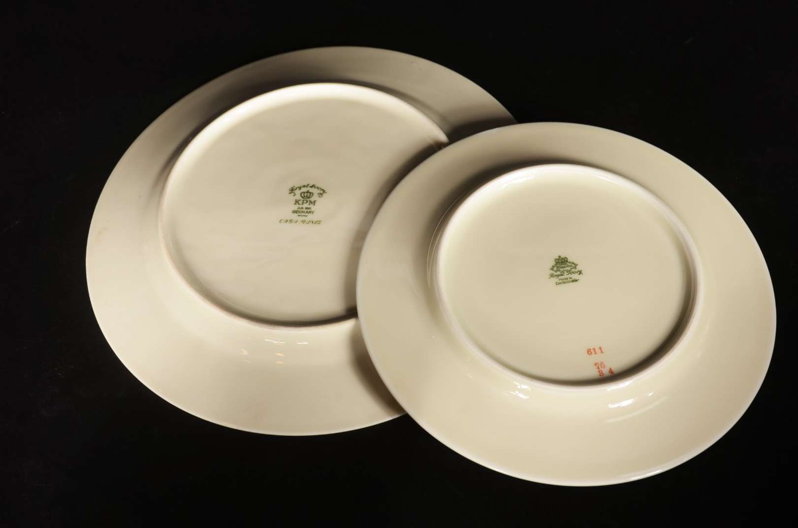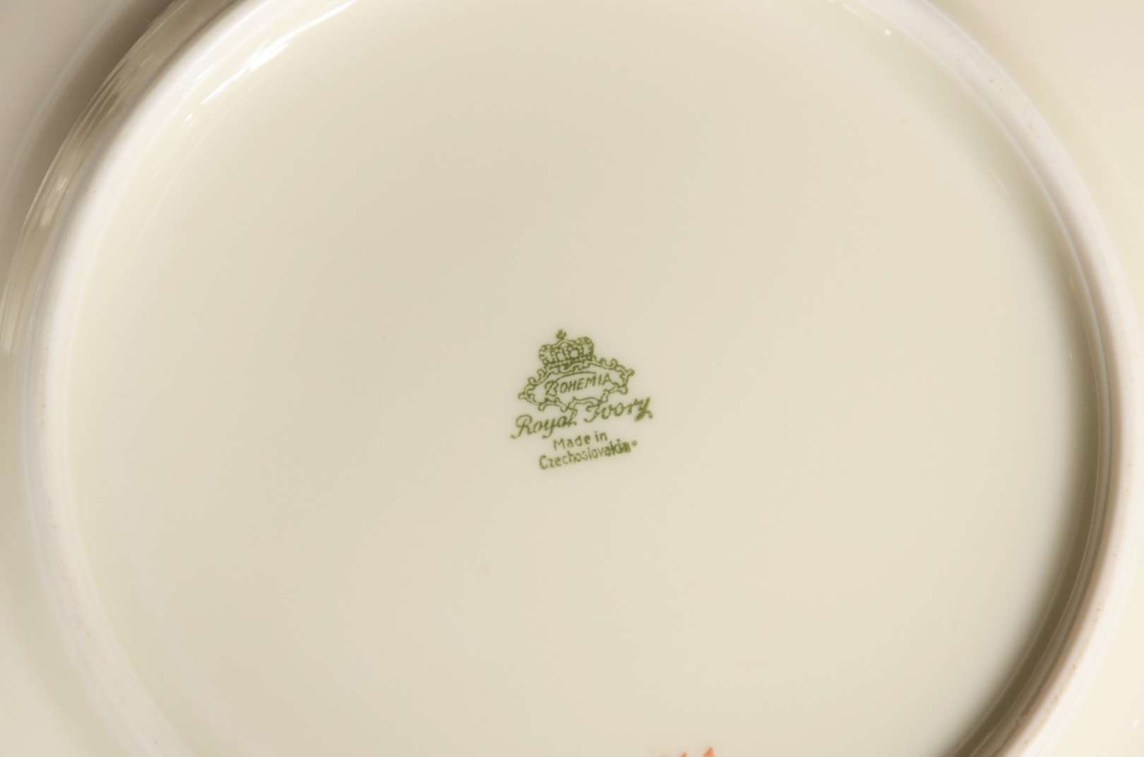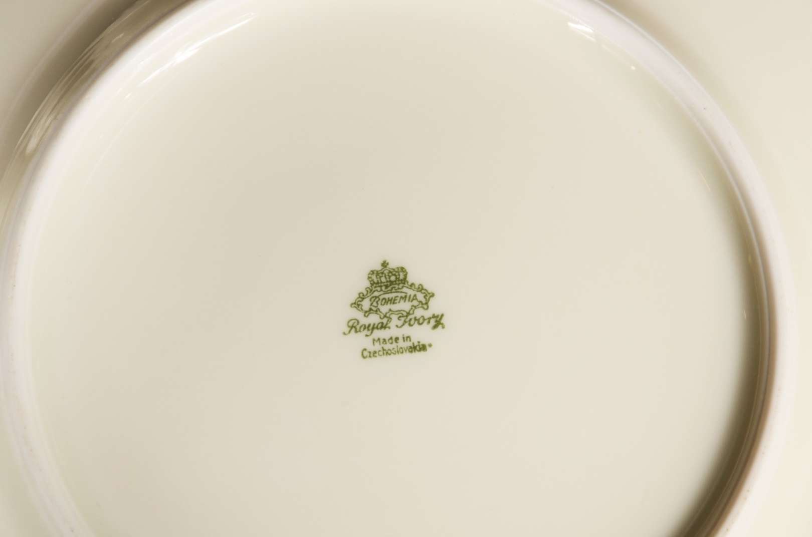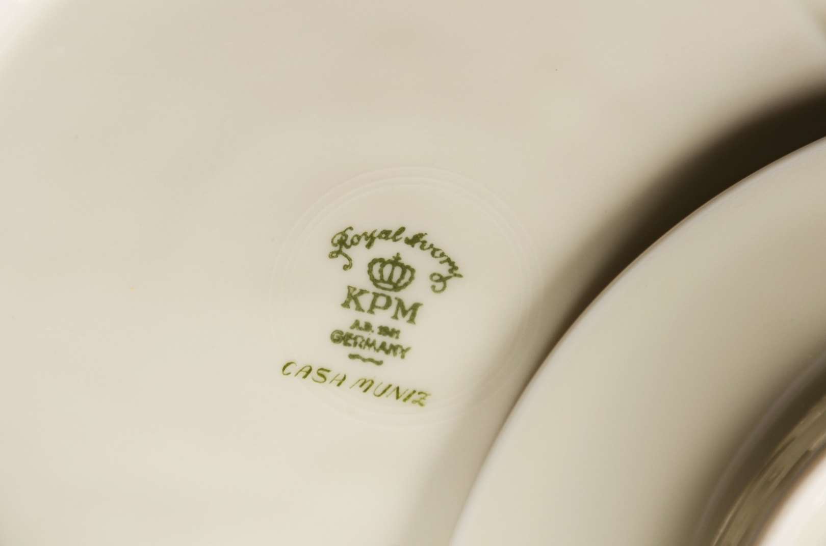 Serviço de chá de porcelana tcheca "Royal Ivory", composto de: 6 xícaras com pires, 6 pratos de sobremesa, bule, leiteira, açucareiro e manteigueira. Acompanham 11 pratos de sobremesa de porcelana KPM (outra decoração) Total: 27 peças.