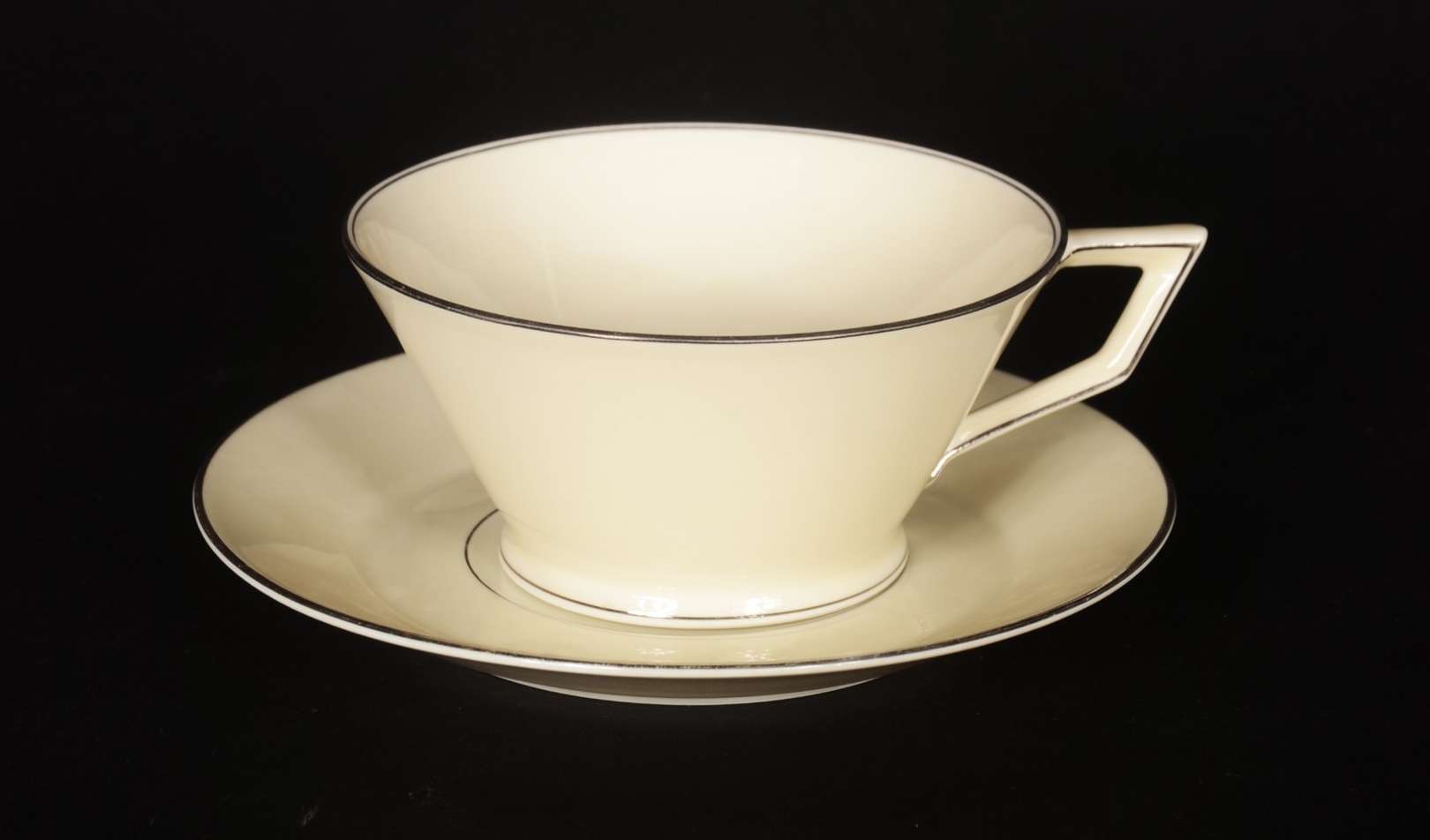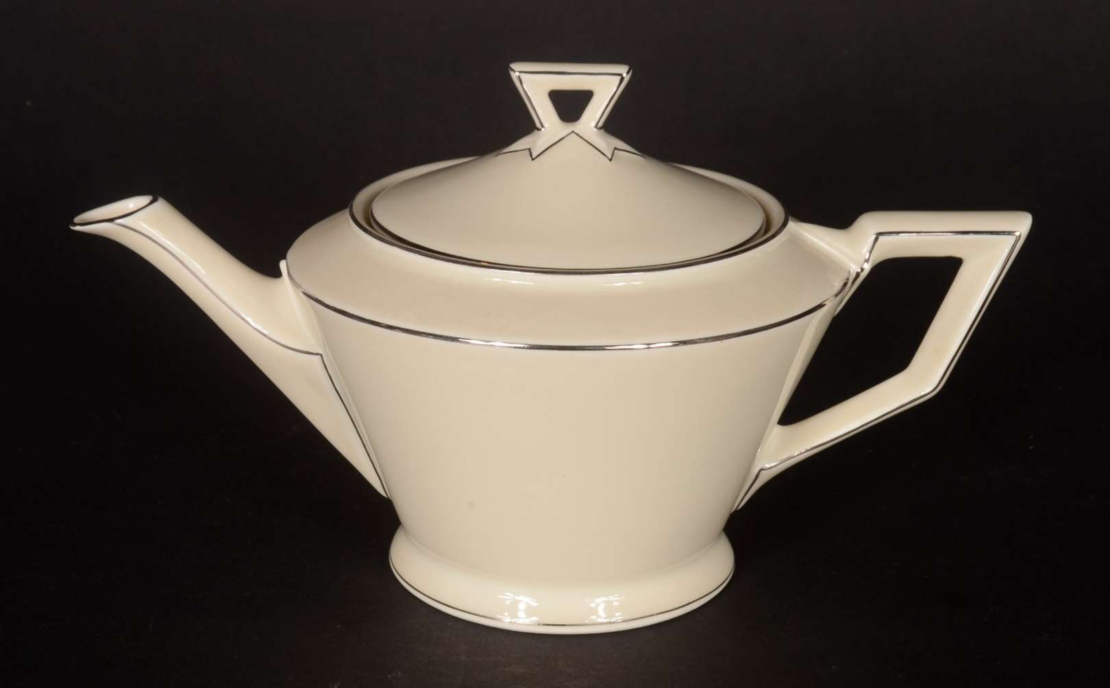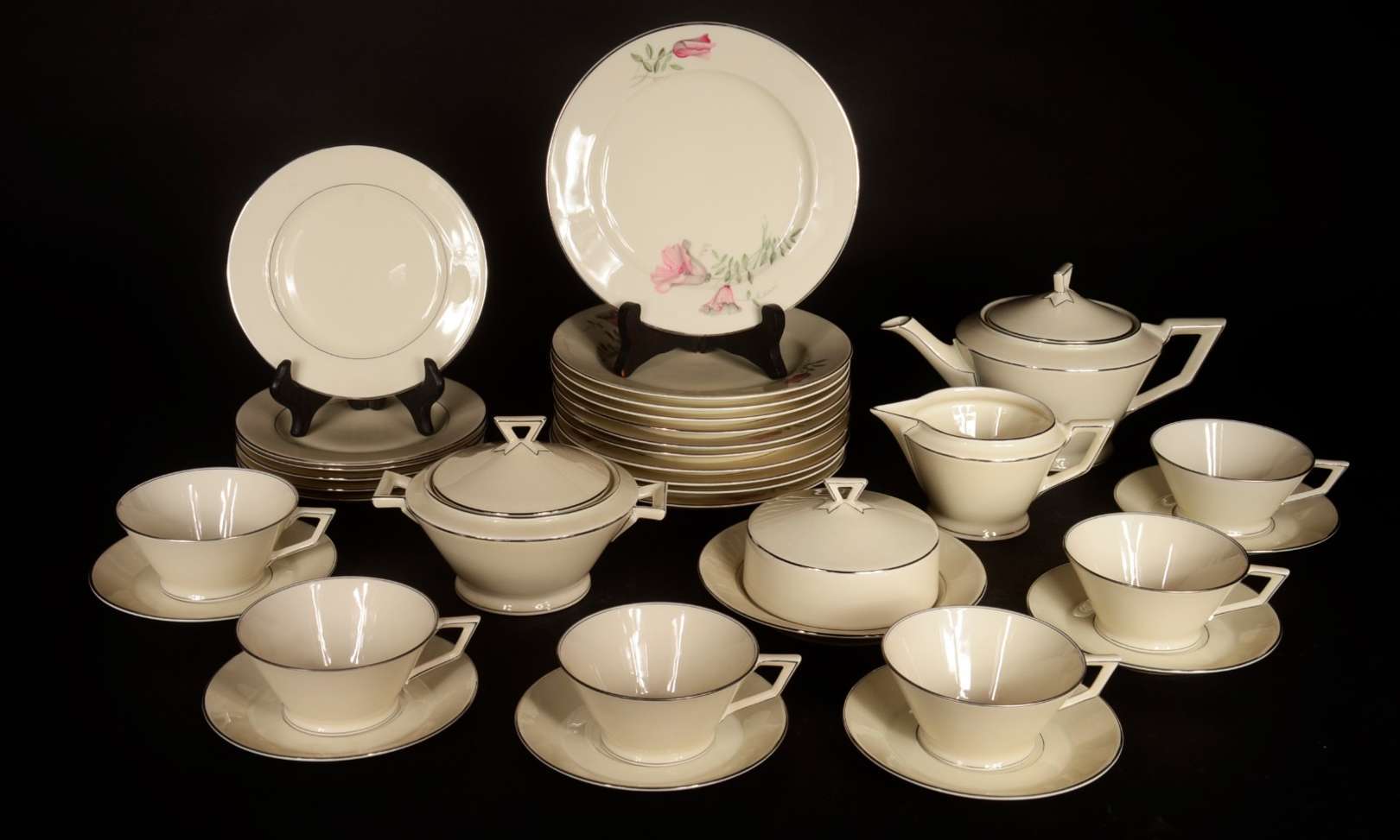 Serviço de chá de porcelana tcheca "Royal Ivory", composto de: 6 xícaras com pires, 6 pratos de sobremesa, bule, leiteira, açucareiro e manteigueira. Acompanham 11 pratos de sobremesa de porcelana KPM (outra decoração) Total: 27 peças.