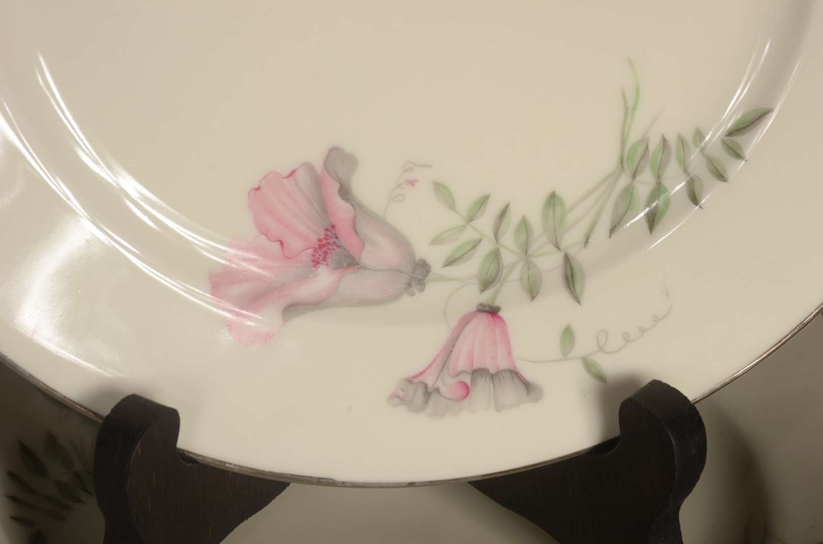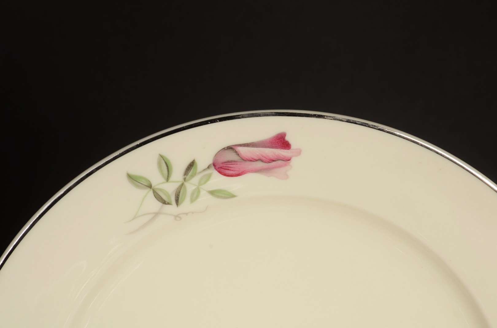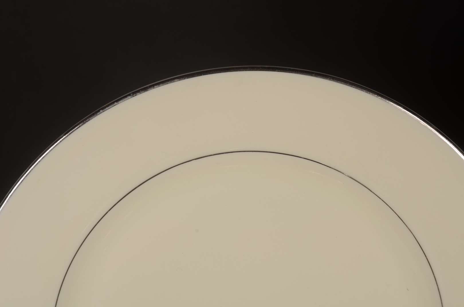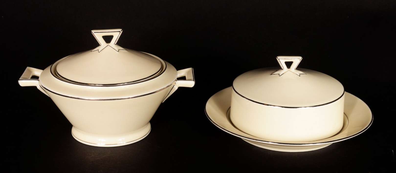 Serviço de chá de porcelana tcheca "Royal Ivory", composto de: 6 xícaras com pires, 6 pratos de sobremesa, bule, leiteira, açucareiro e manteigueira. Acompanham 11 pratos de sobremesa de porcelana KPM (outra decoração) Total: 27 peças.