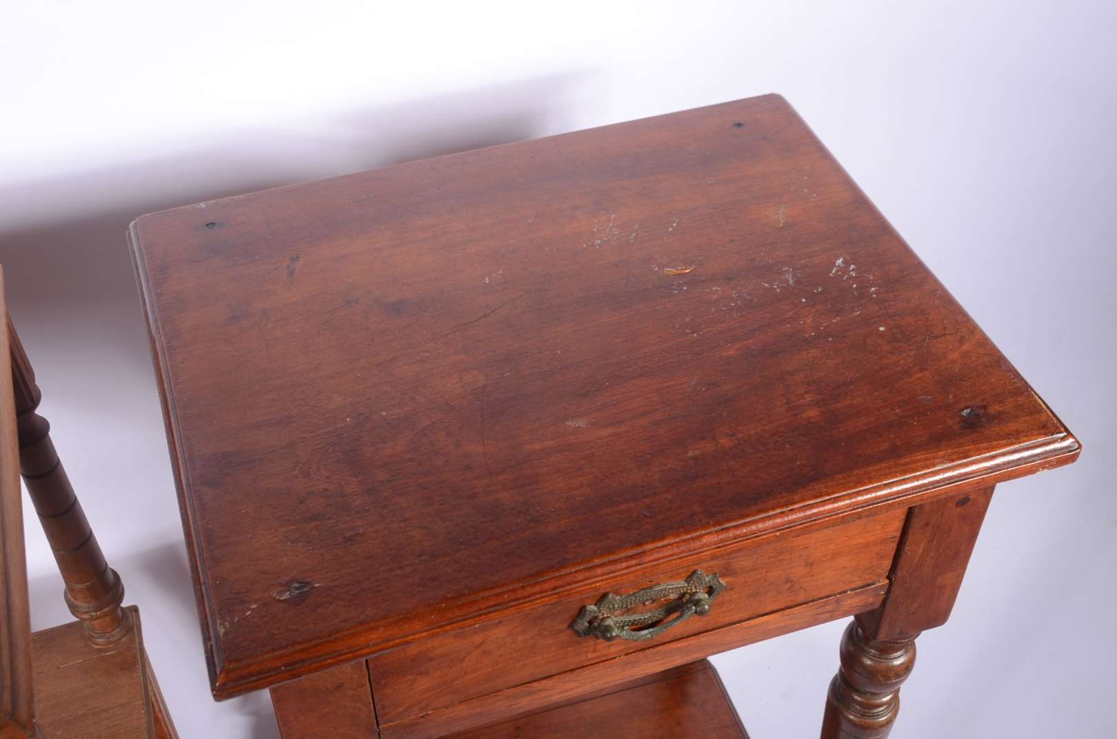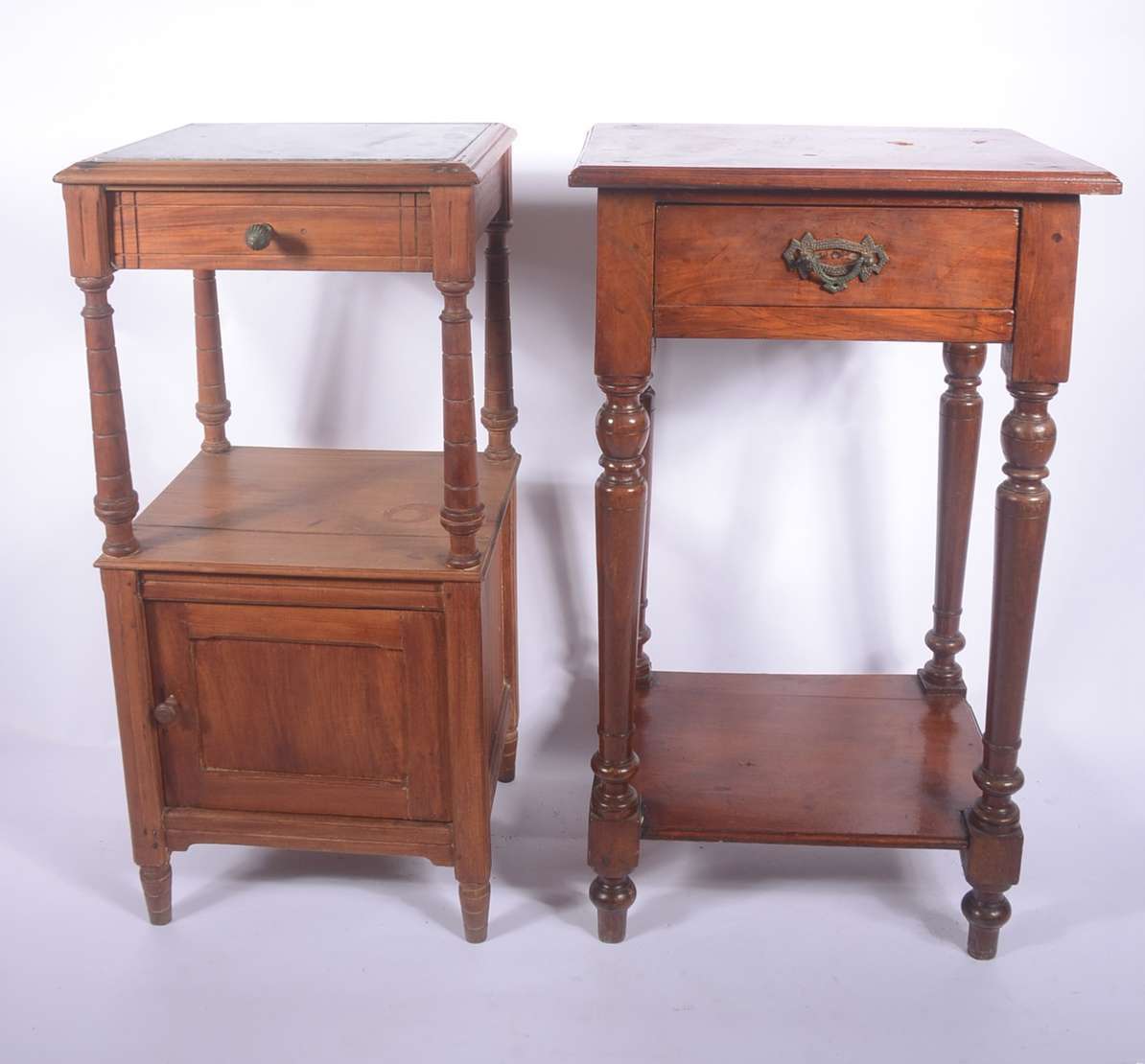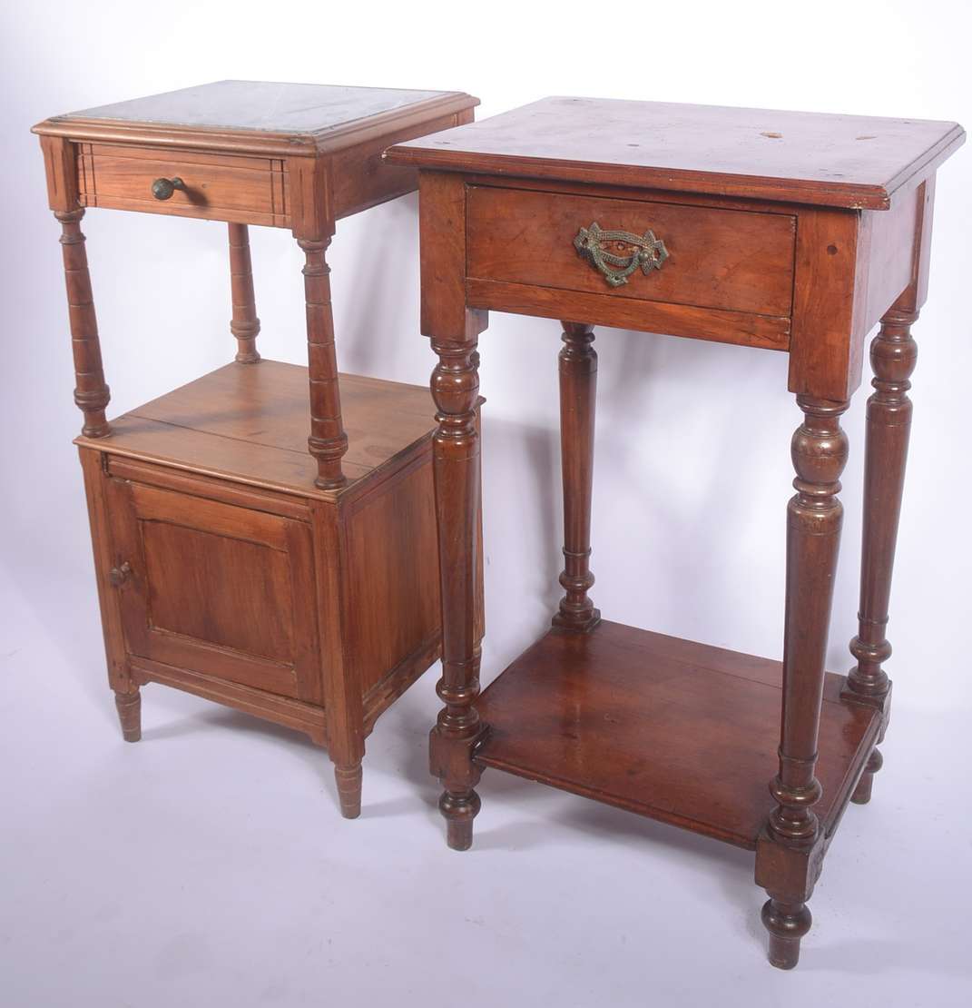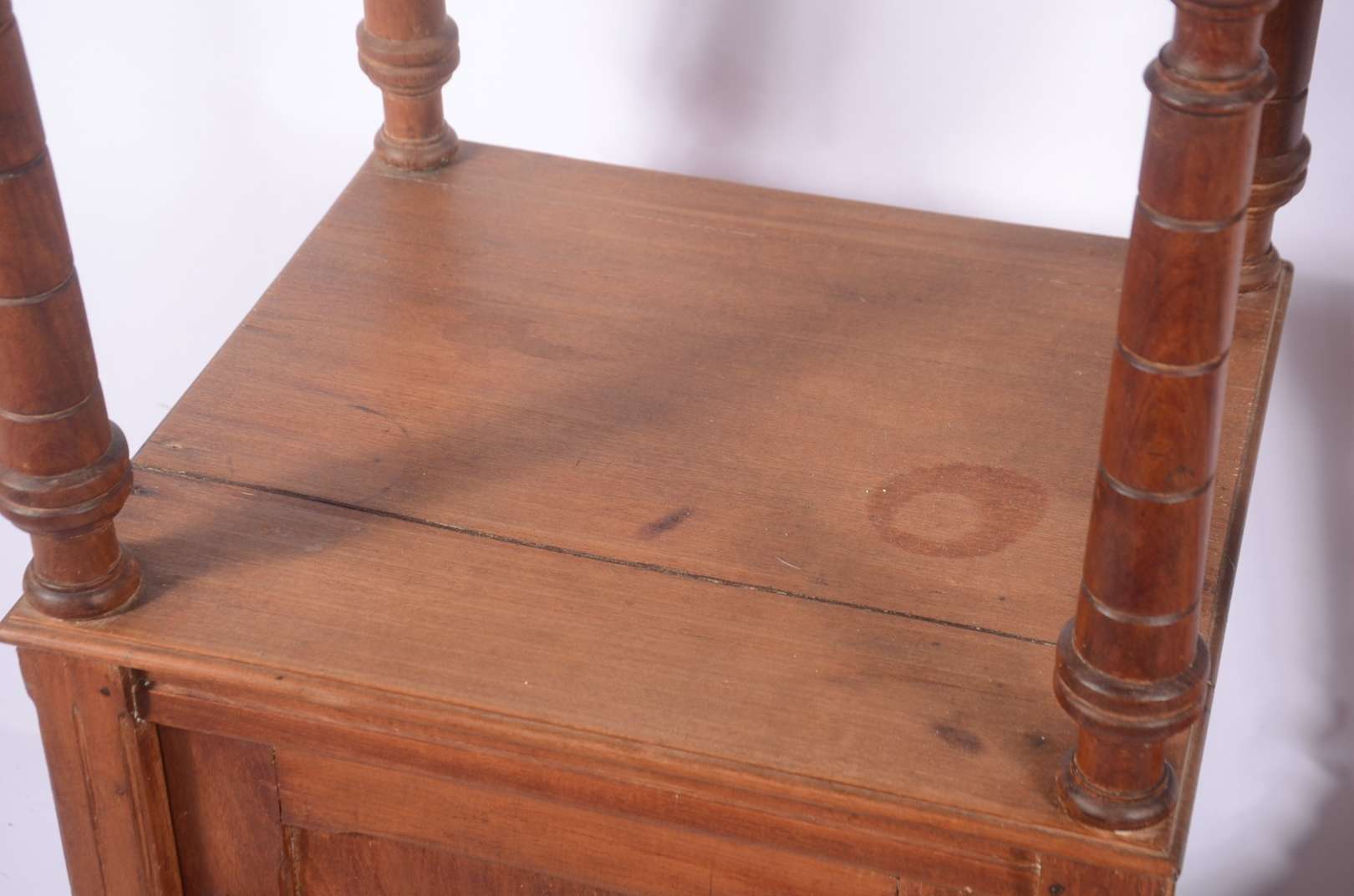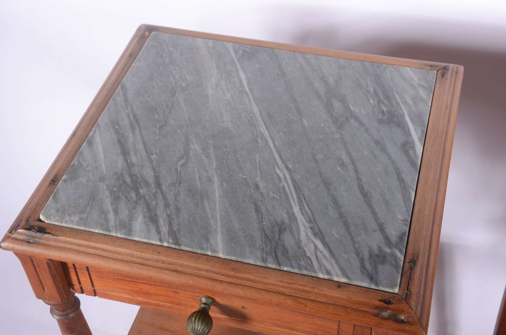 Móvel etager de madeira nobre, parte inferior com duas portas e duas gavetas, tampo de mármore (fios de cabelo). Alça...