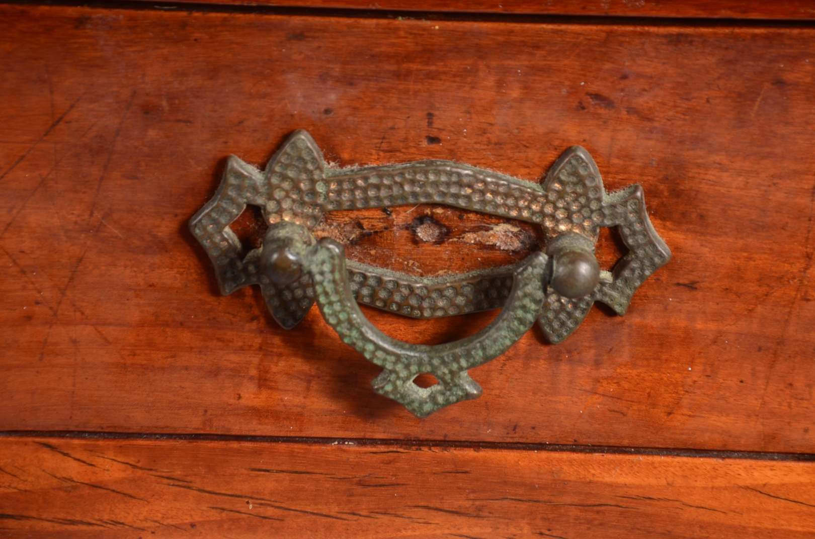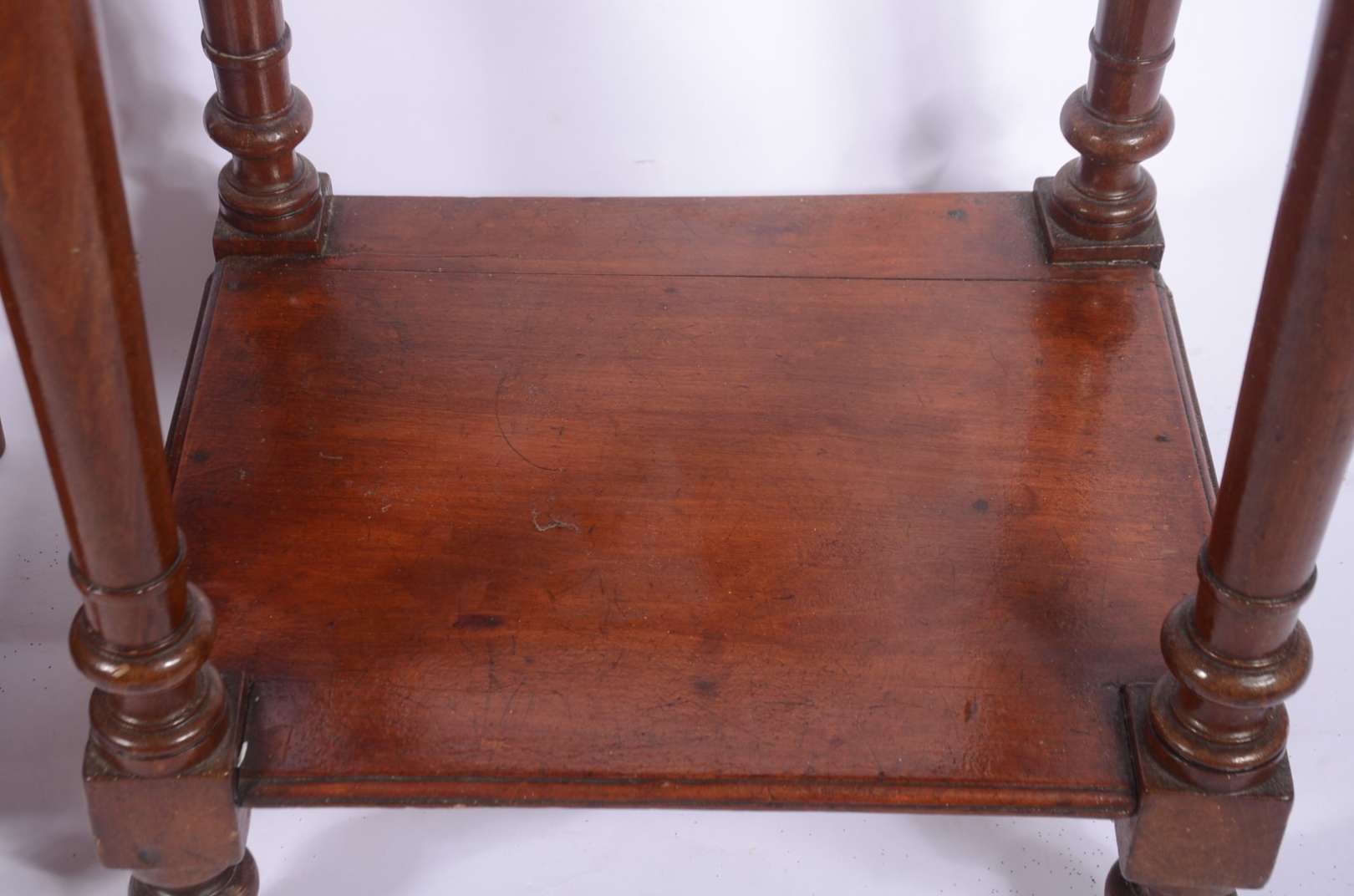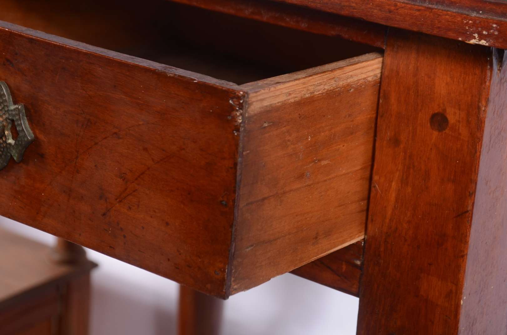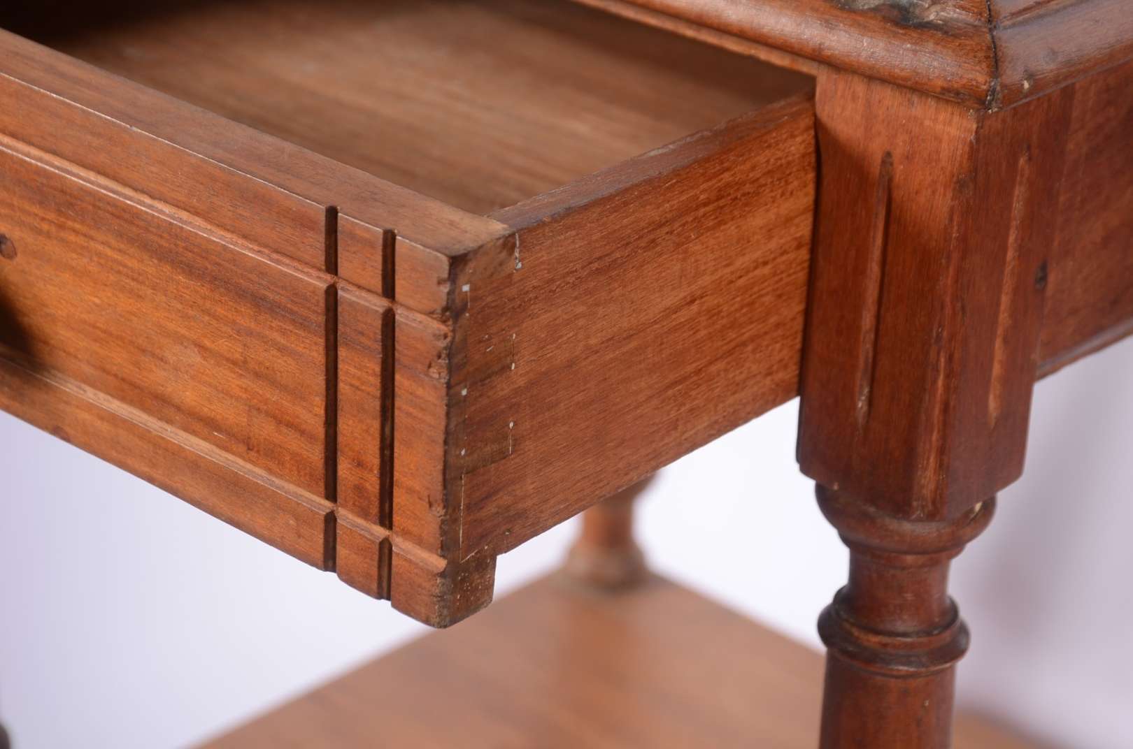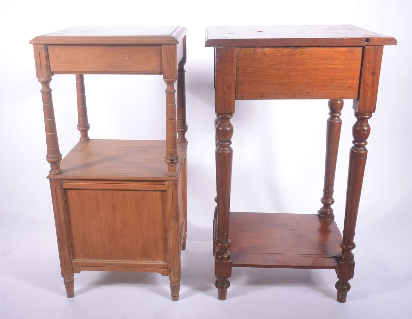Móvel etager de madeira nobre, parte inferior com duas portas e duas gavetas, tampo de mármore (fios de cabelo). Alça...