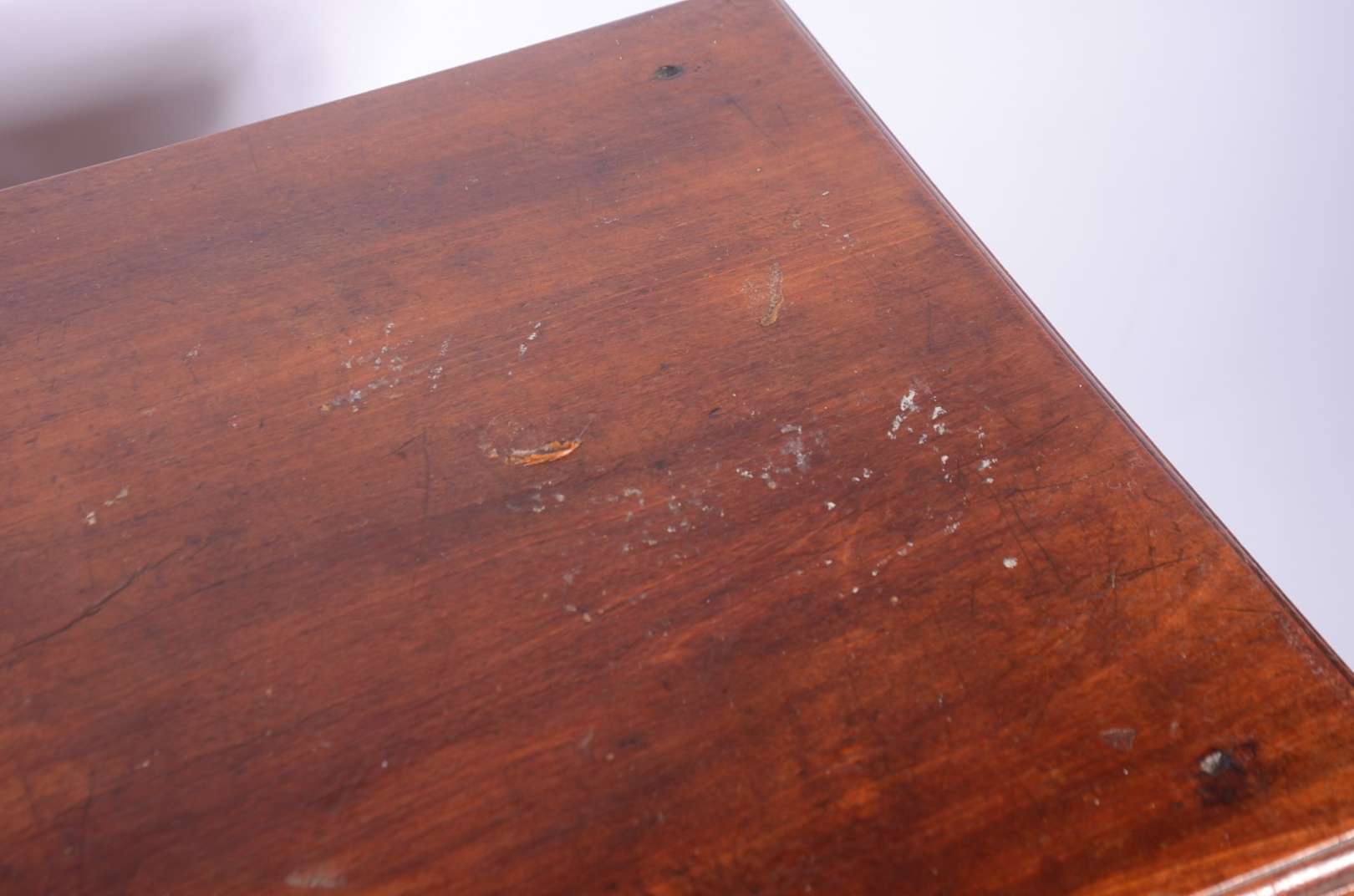 Mesa retangular de madeira nobre filetada, gaveta central e pernas retas. Entrada da chave faltando pequenas partes. ...
