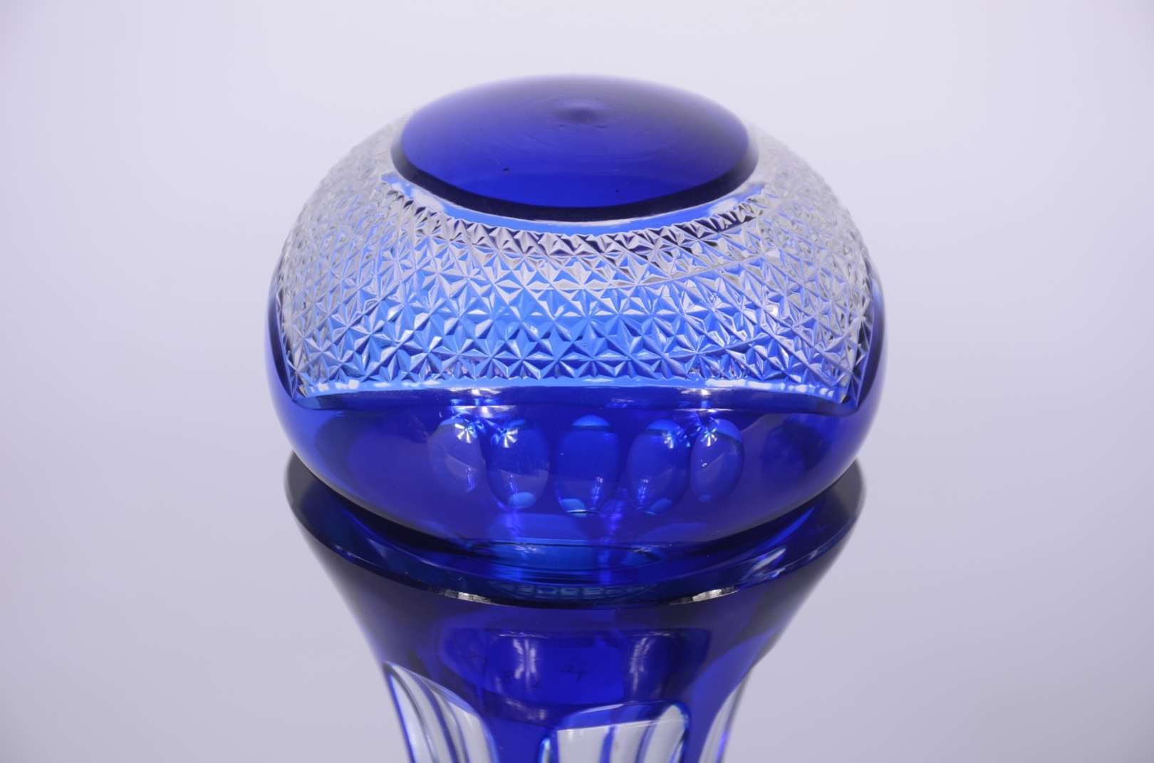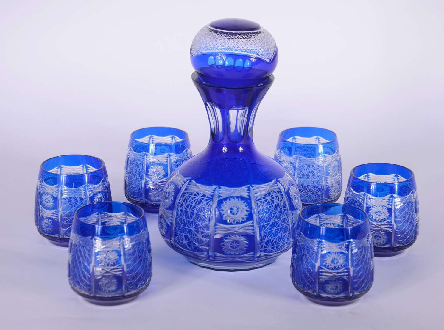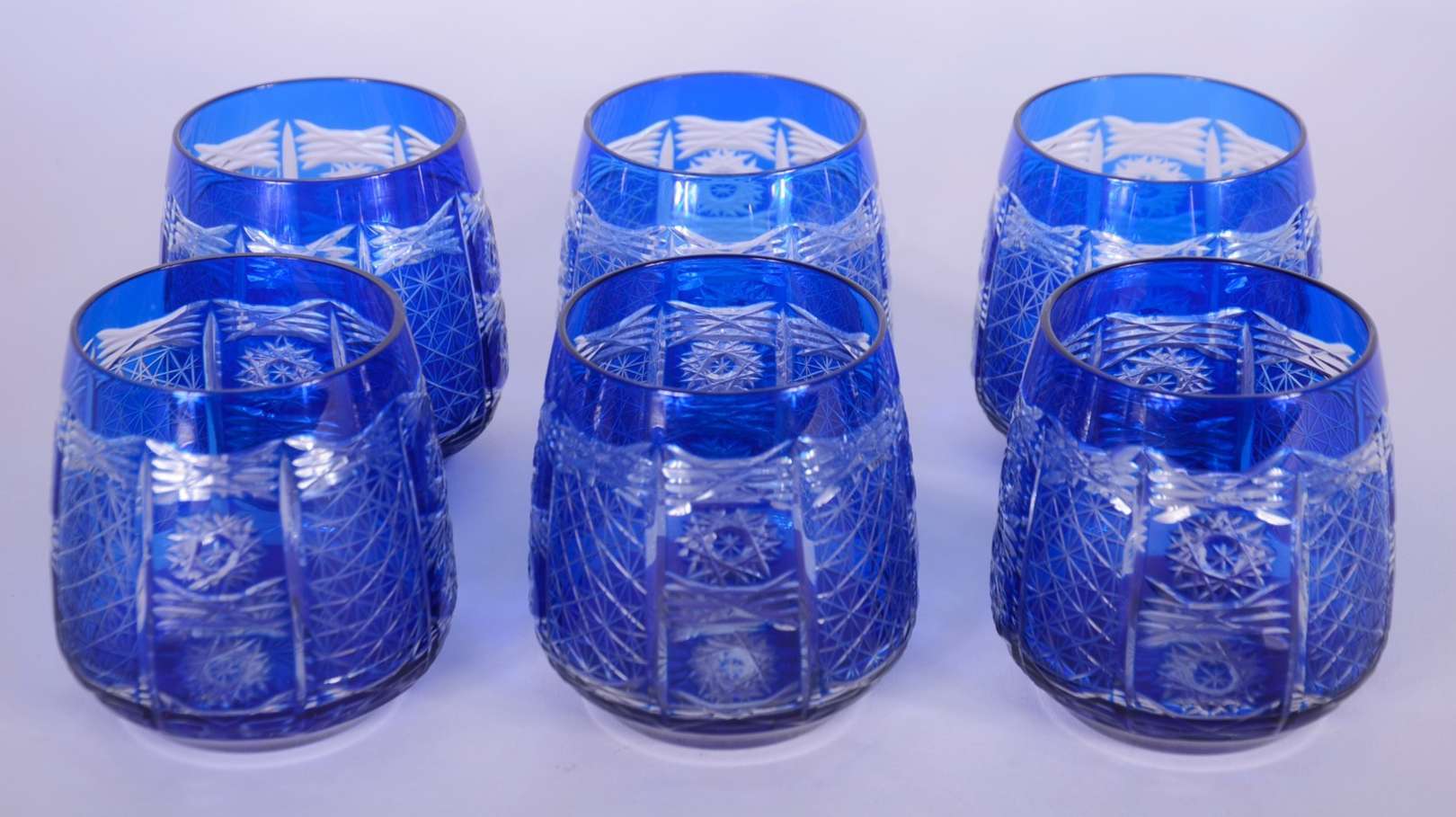 Conjunto com jarra de cristal facetada e 5 cálices para vinho de cristal, assinados Moser. (A jarra não tem marca).