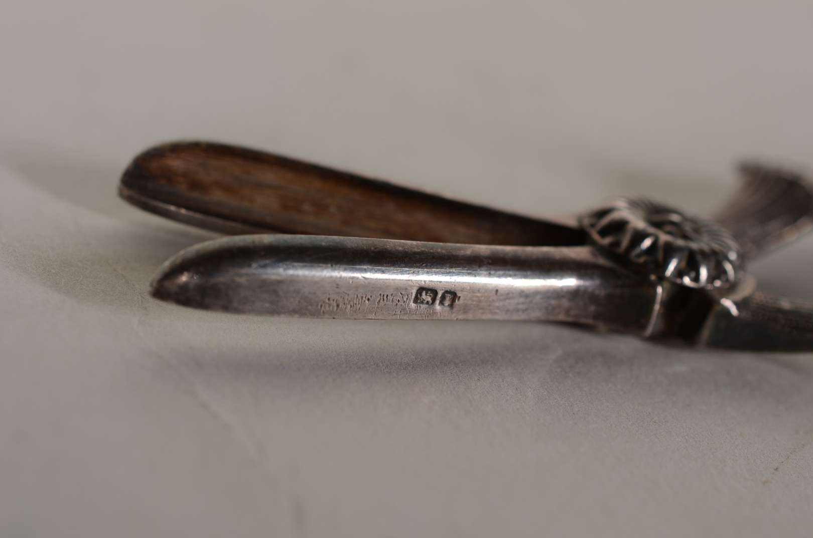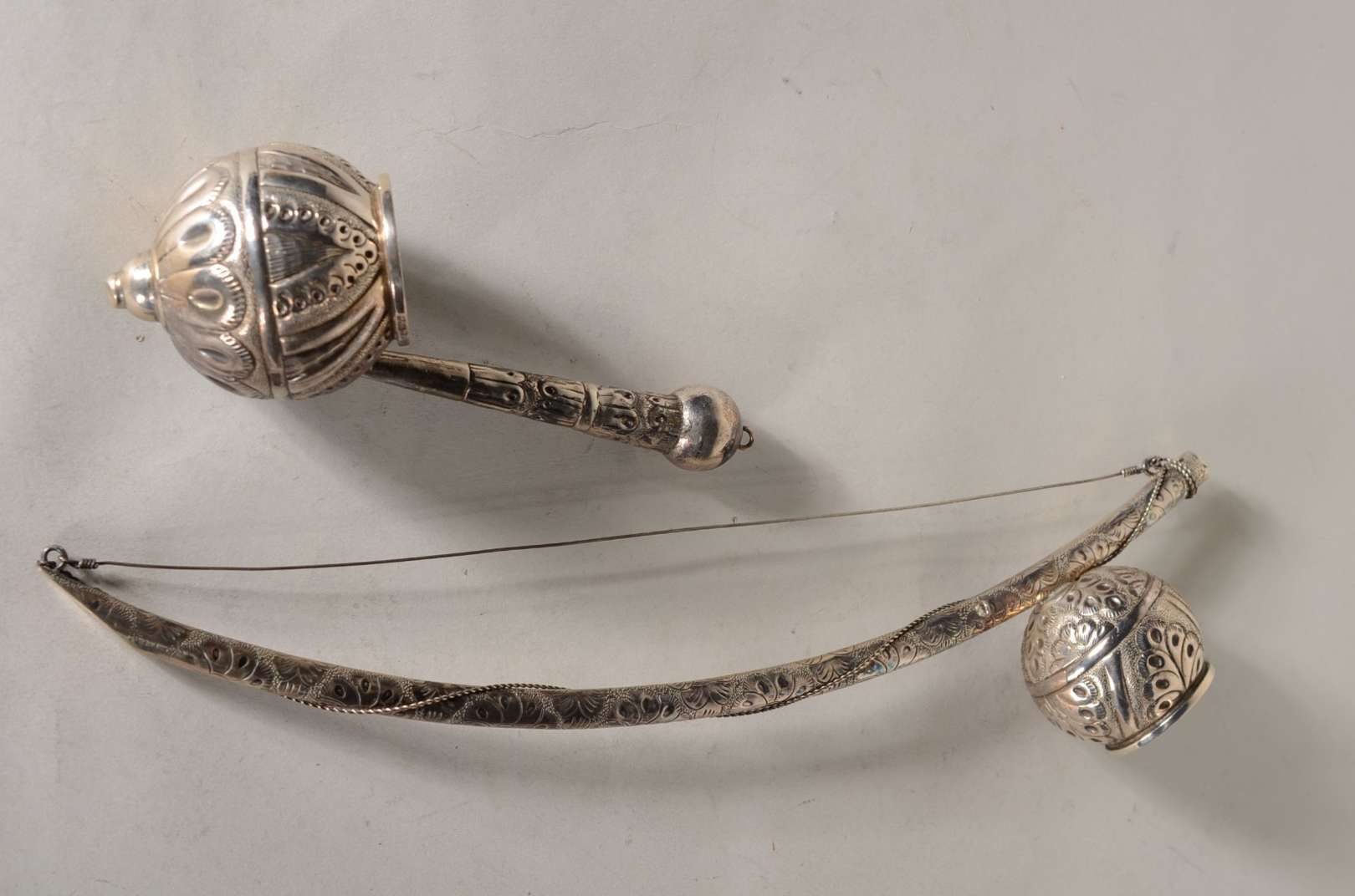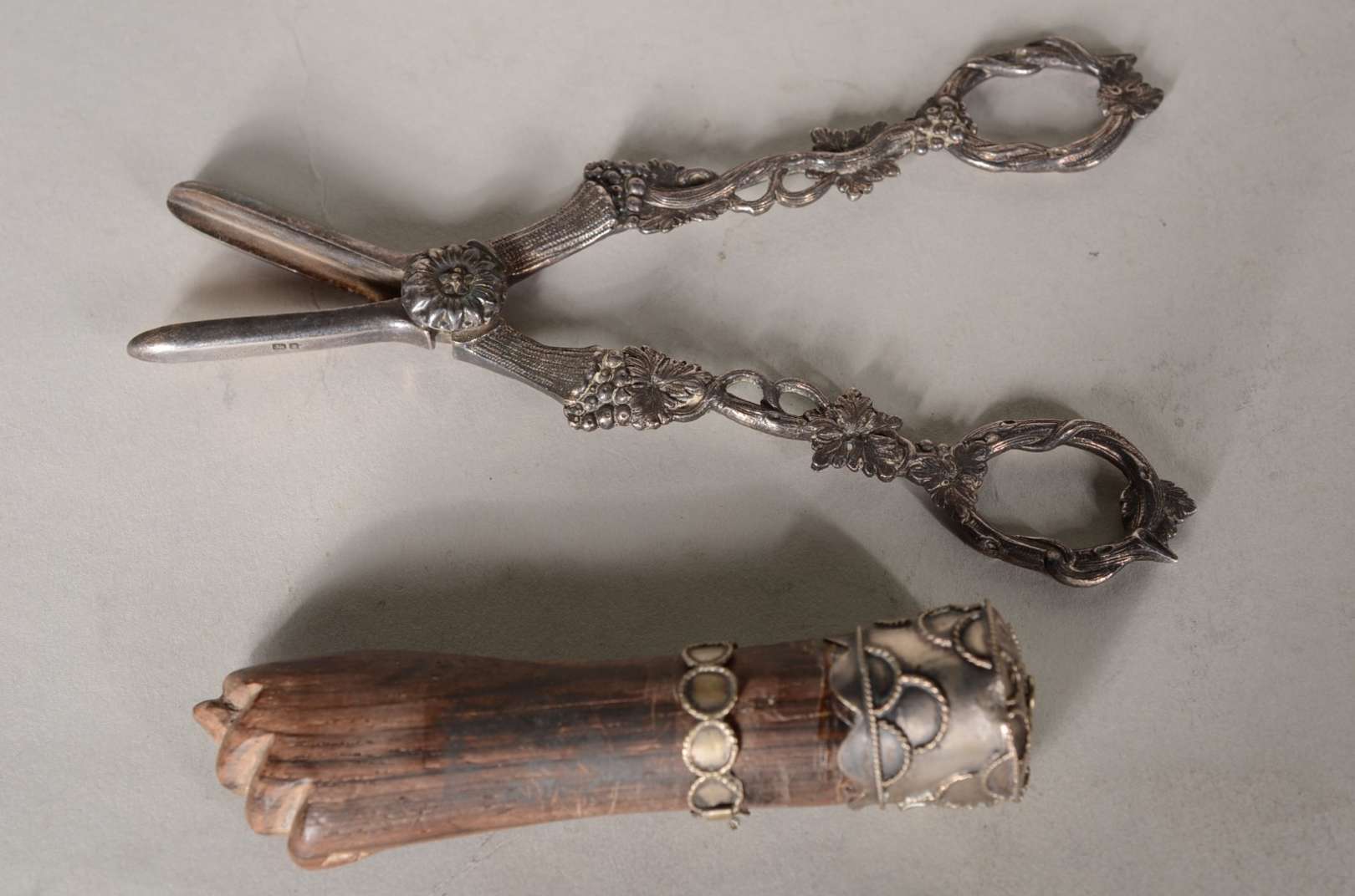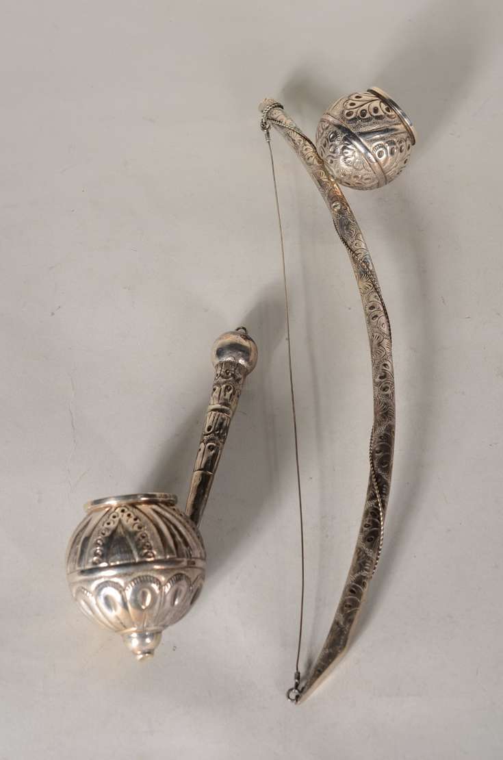 Duas bengalas de madeira com castão de metal na forma de cabeça de cavalo e figura feminina.