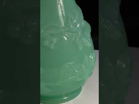 Vaso decorativo de cerâmica na cor esverdeada com pegas laterais na forma de palmeiras.