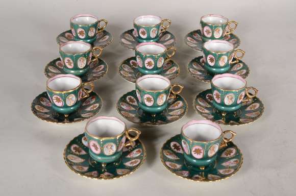 Serviço com 11 xícaras para café com pires de porcelana japonesa verde com reservas de rostos femininos em policromia...