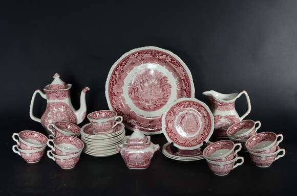 Aparelho de fainça inglesa Mason's rosa e branco para chá, composto de: 13 xícaras com pires, prato grande, 4 pratos ...