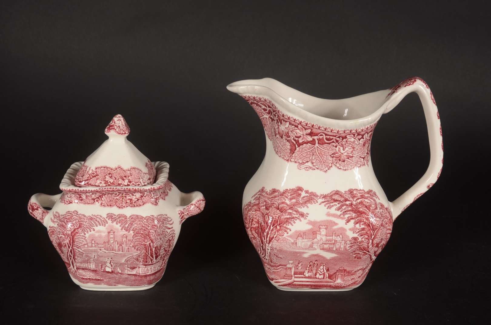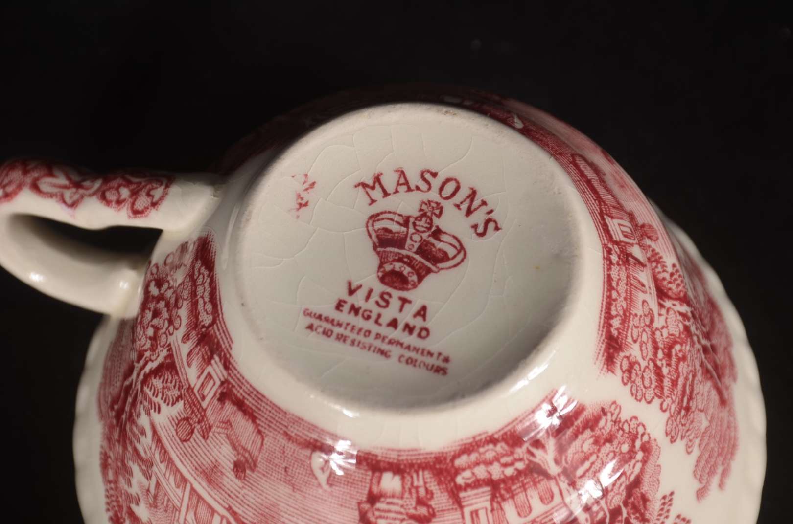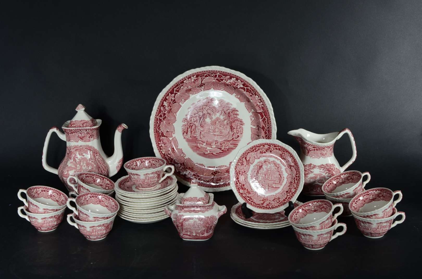 Aparelho de fainça inglesa Mason's rosa e branco para chá, composto de: 13 xícaras com pires, prato grande, 4 pratos para bolo, açucareiro e bule. Total:20 peças.