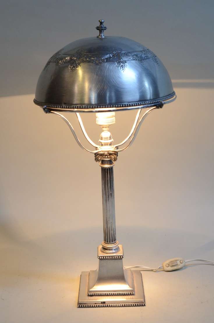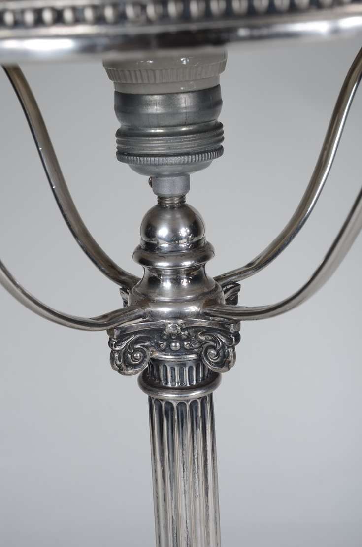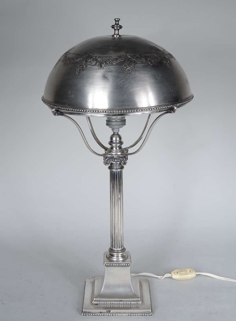 Abatjour na forma de ânfora de bronze e porcelana, decorado com figuras angelicais em policromia sobre fundo azul.