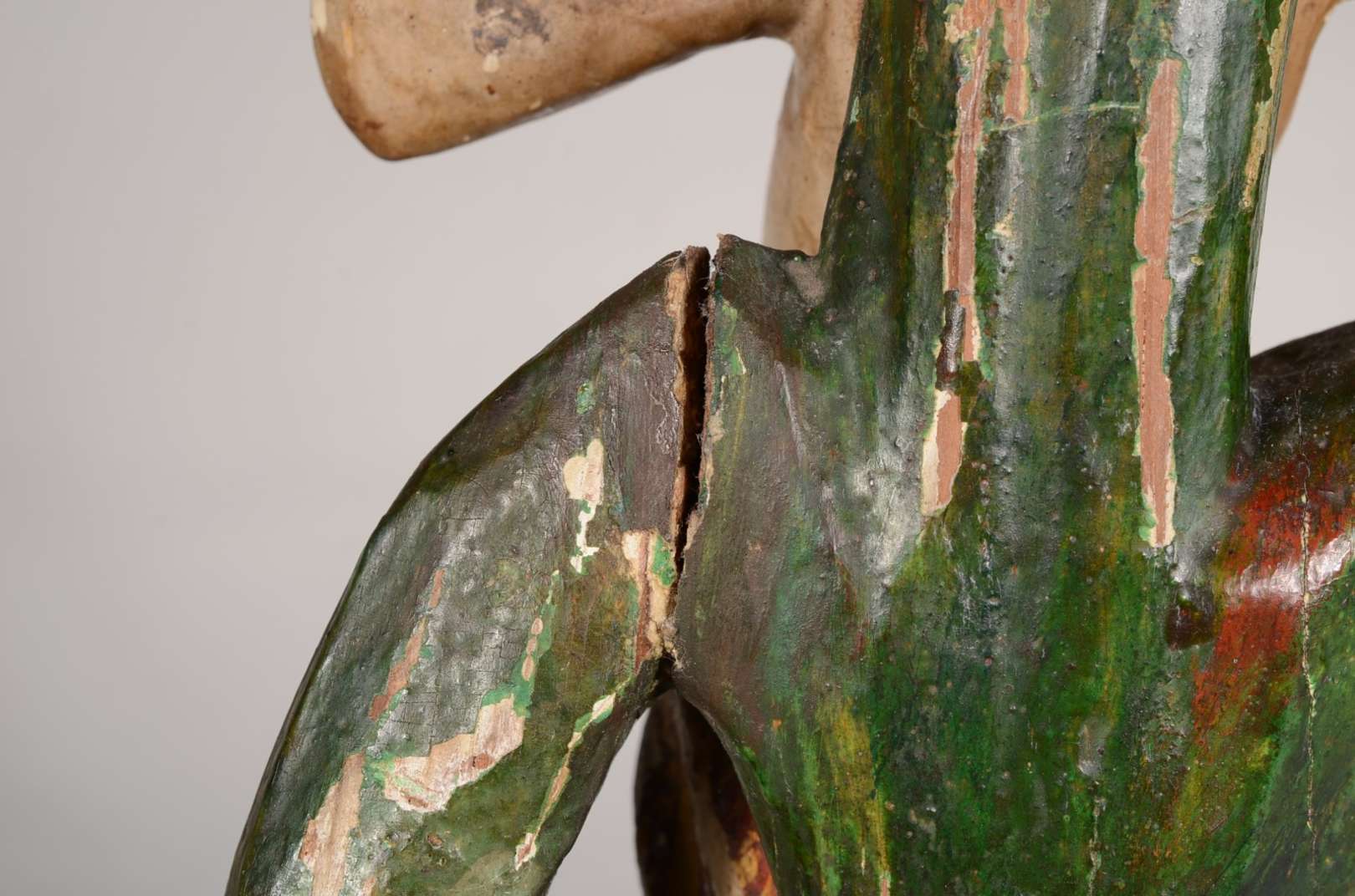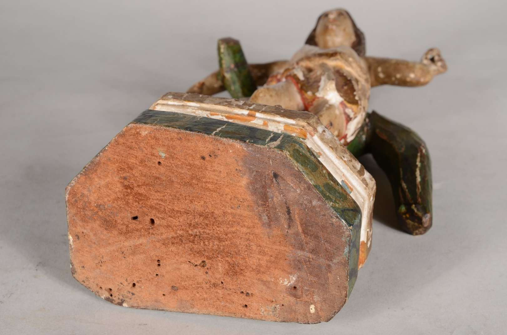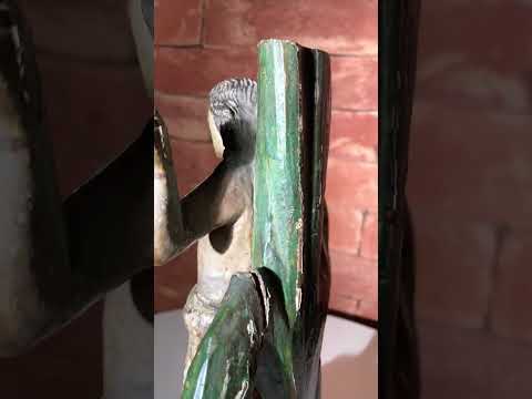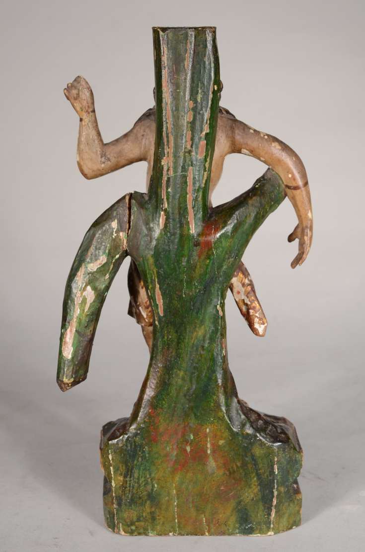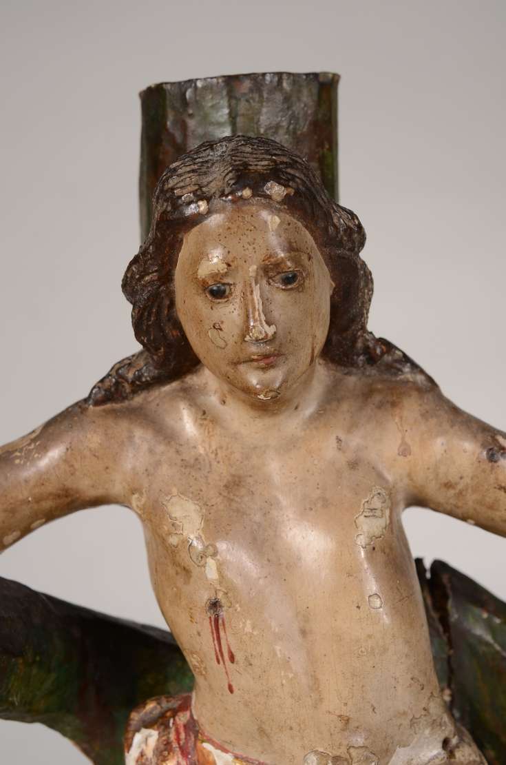 Escultura de madeira representando torso masculino.