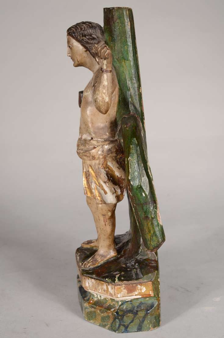 Crucifixo com figura de Cristo de madeira policromada rústica.