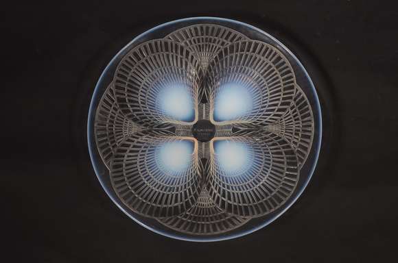 Prato de cristal francês Art Déco do início do século XX, superfície fosca com padrão geométrico gravado e conchas de...