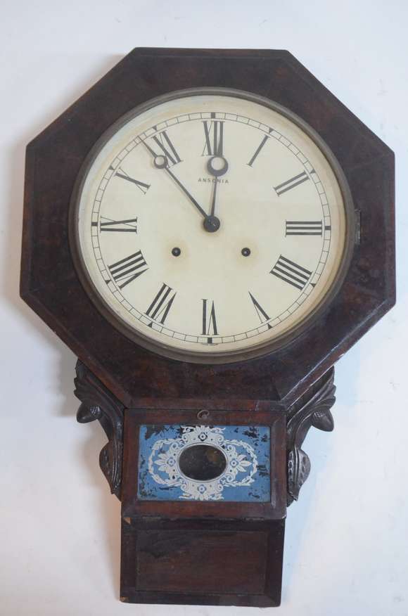 Relógio de parede, marca Ansonia com caixa de madeira feitio oitavado. Desgastes. Máquina parada.