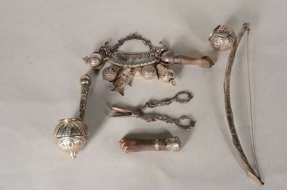 Diversas peças de prata, sendo: Penca baiana, tesoura para espivitar, figa de madeira, coco e berimbau. Peso total: 6...