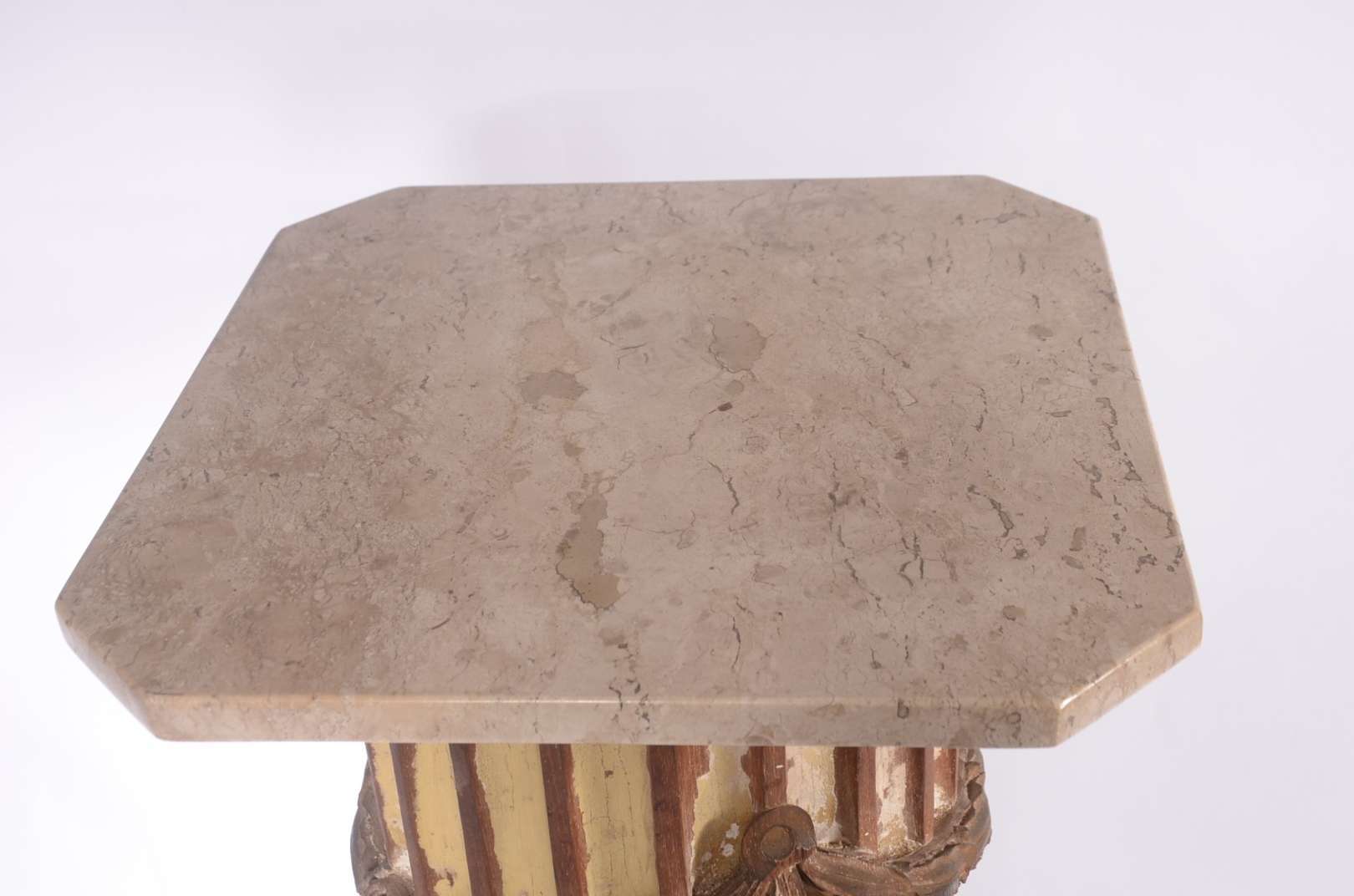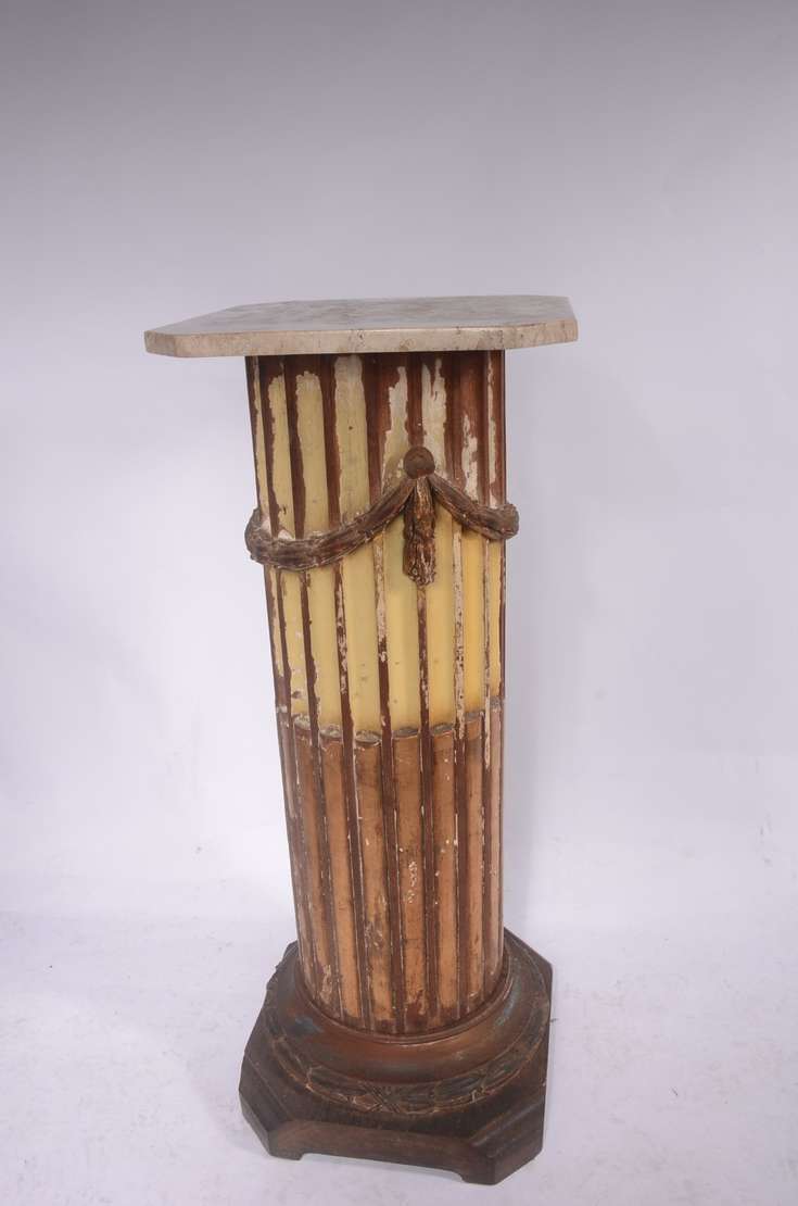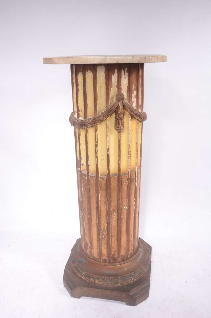 Coluna de alabastro, corpo cilíndrico trabalhado em gomos, base oitavada e tampo circular.
