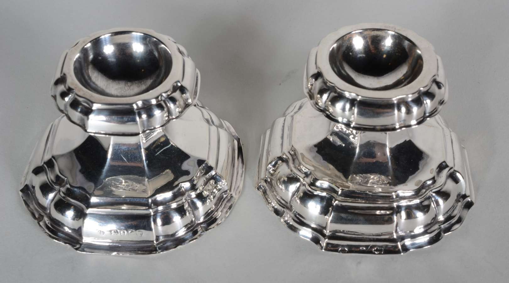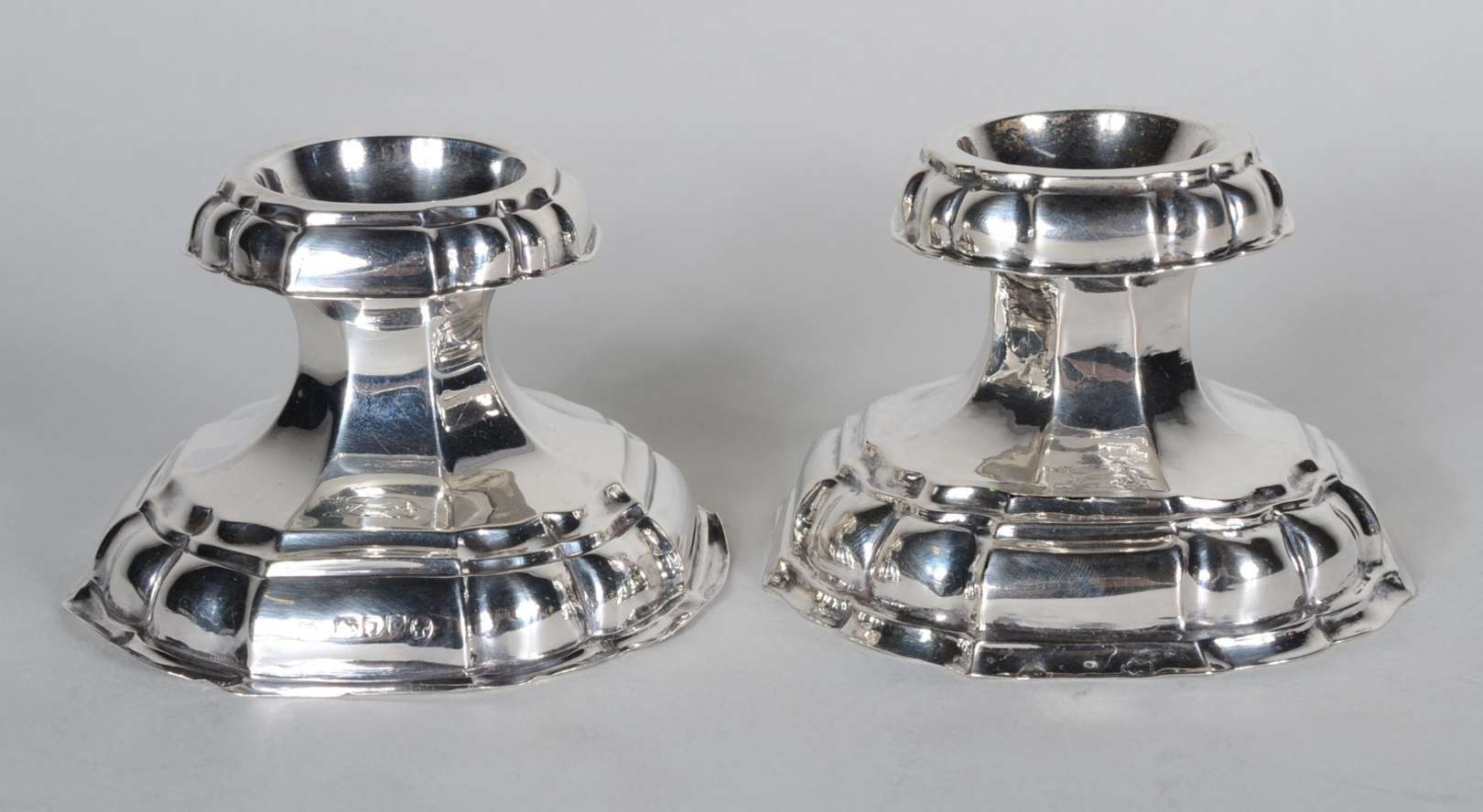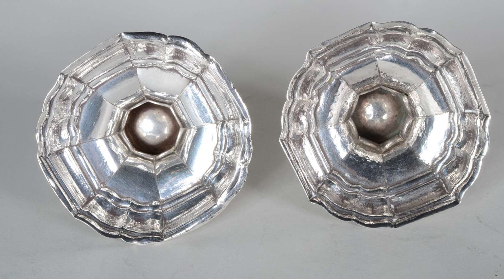 Par de candelabros de prata contrastada para 3 velas cada, pés em forma de concheados. Peso da prata: 1280 g. (Por mo...