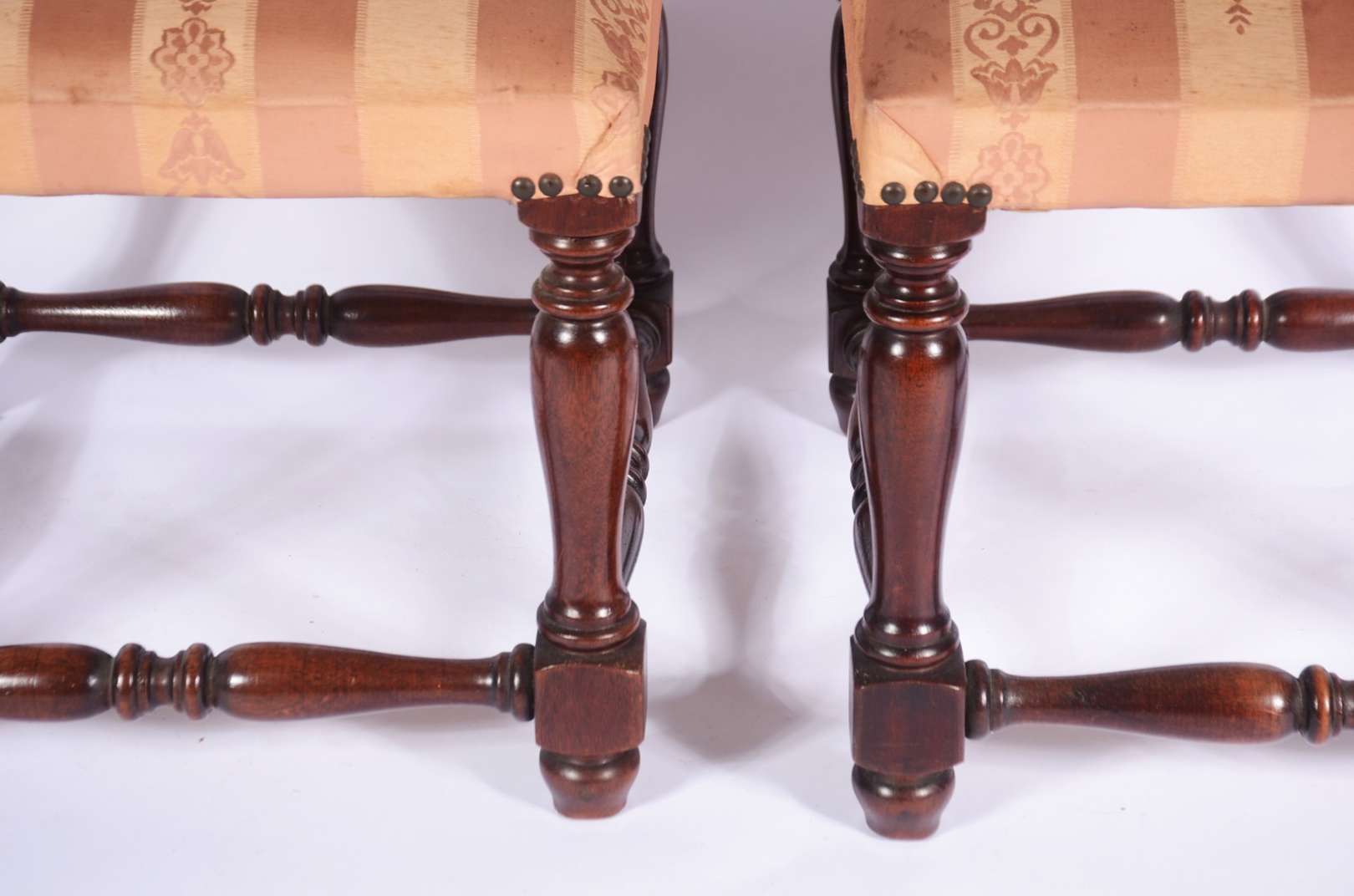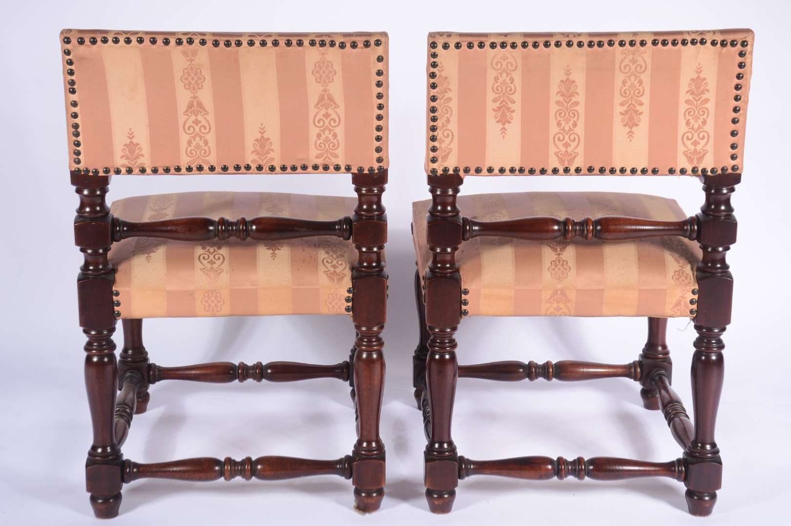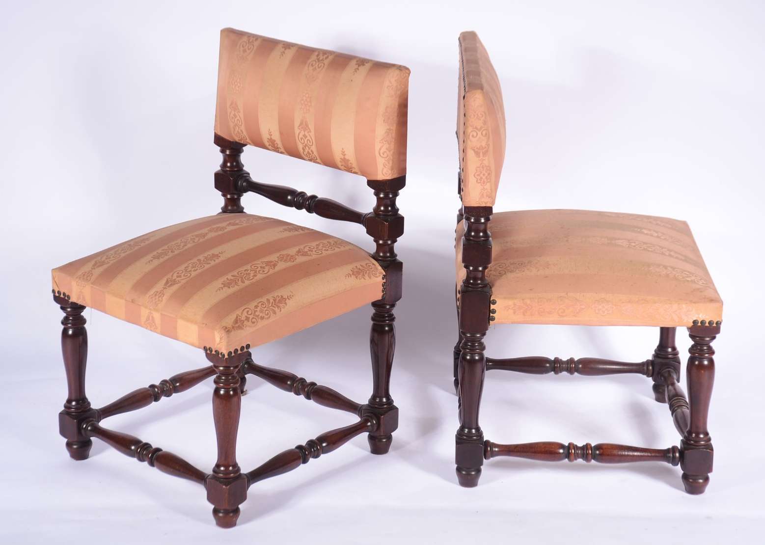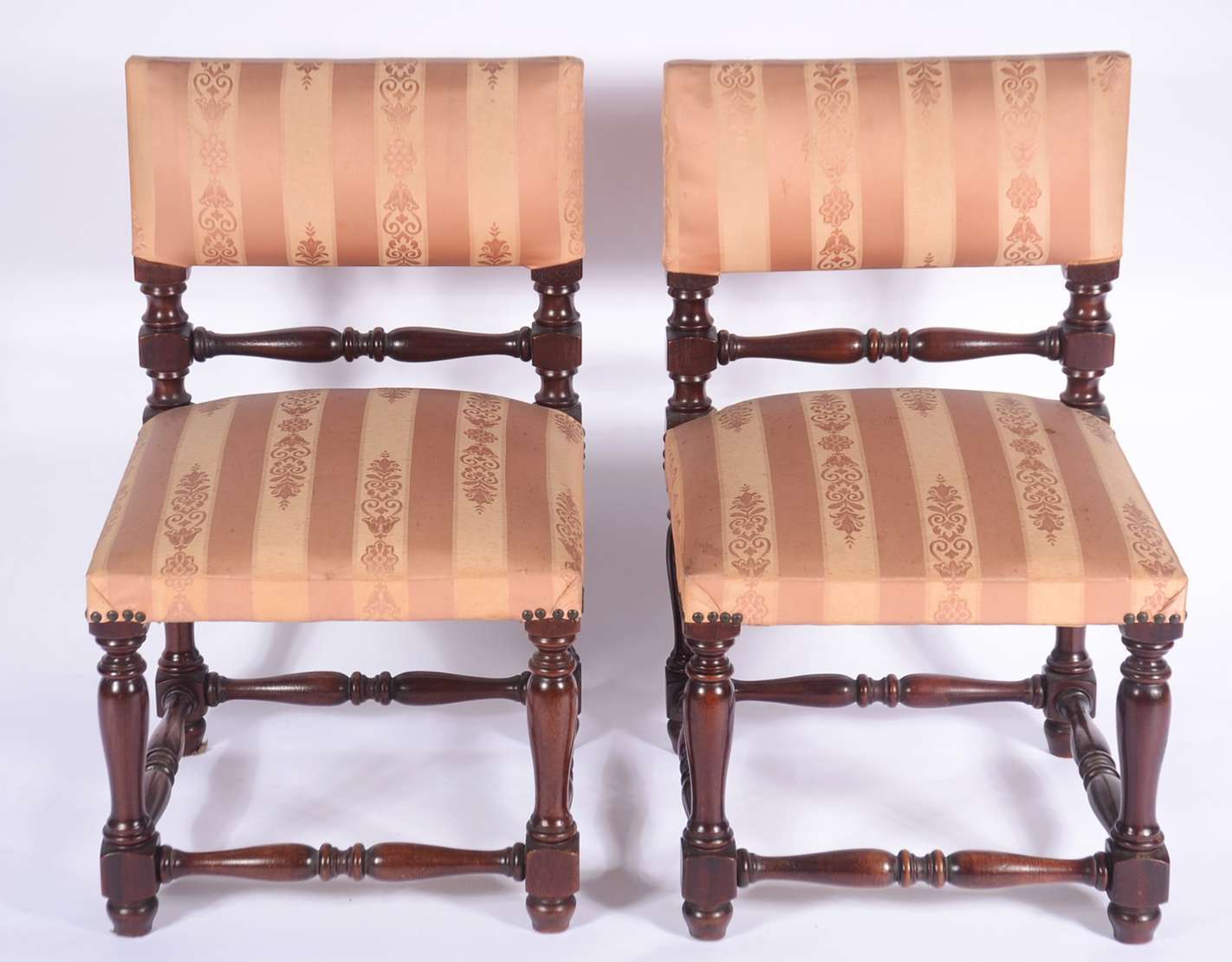Par de cadeiras de madeira nobre, assentos e encostos forrados em tecido bege com tacheados, detalhes entalhados.