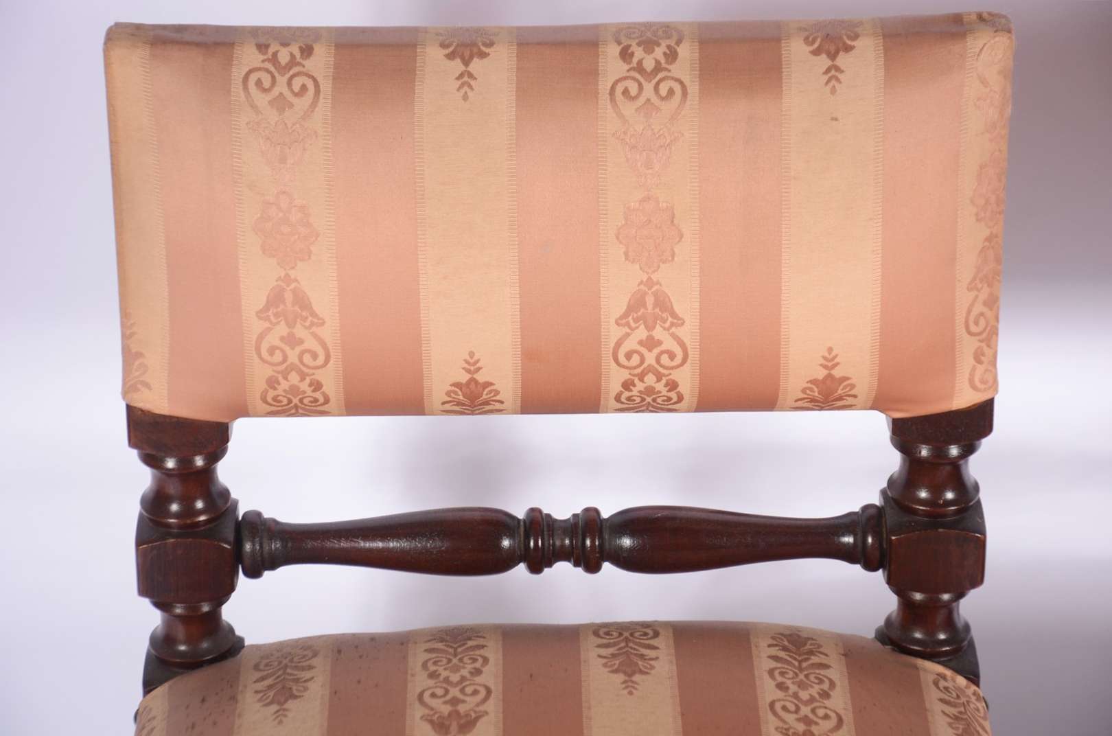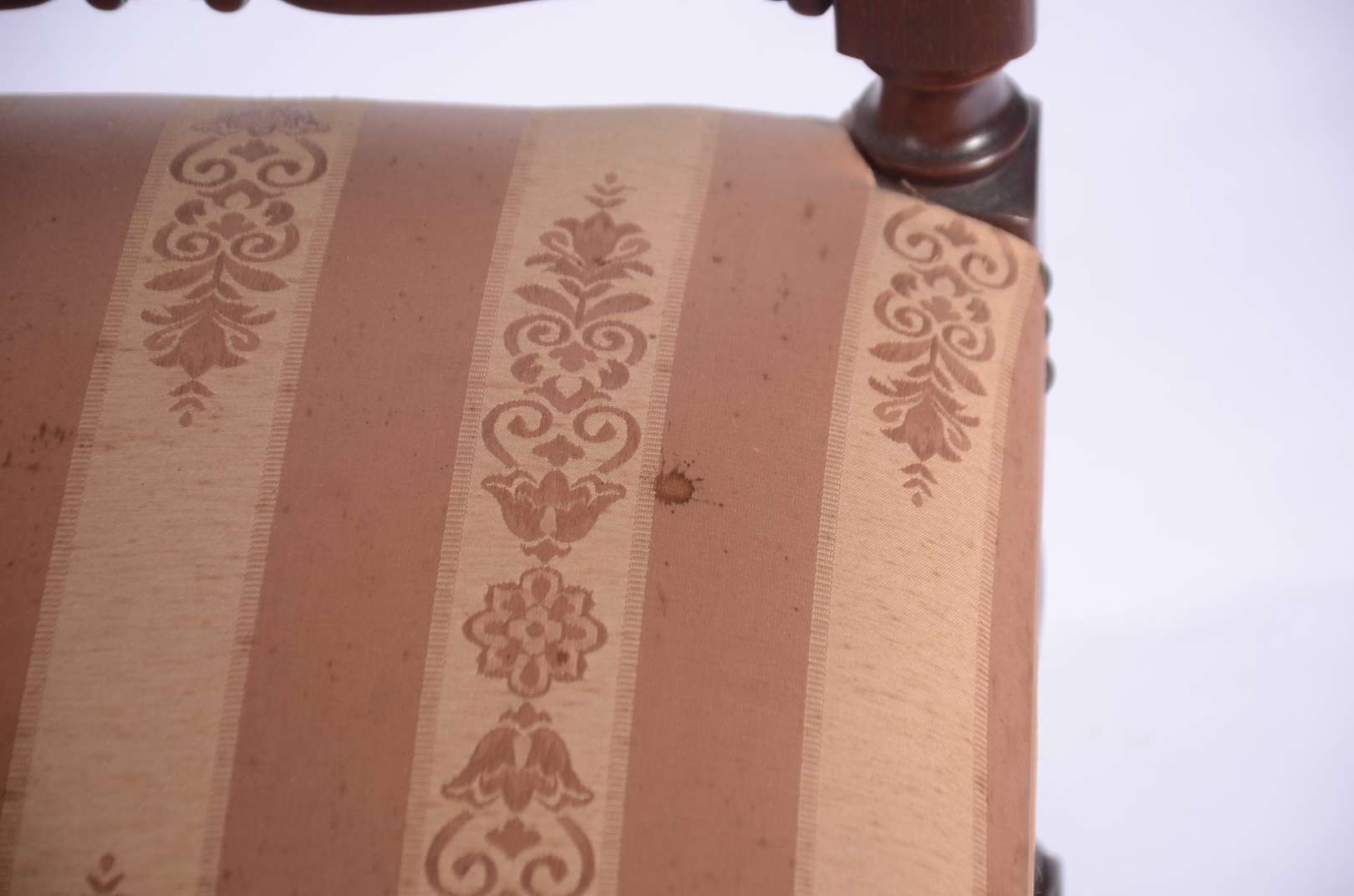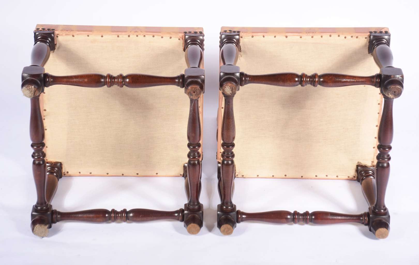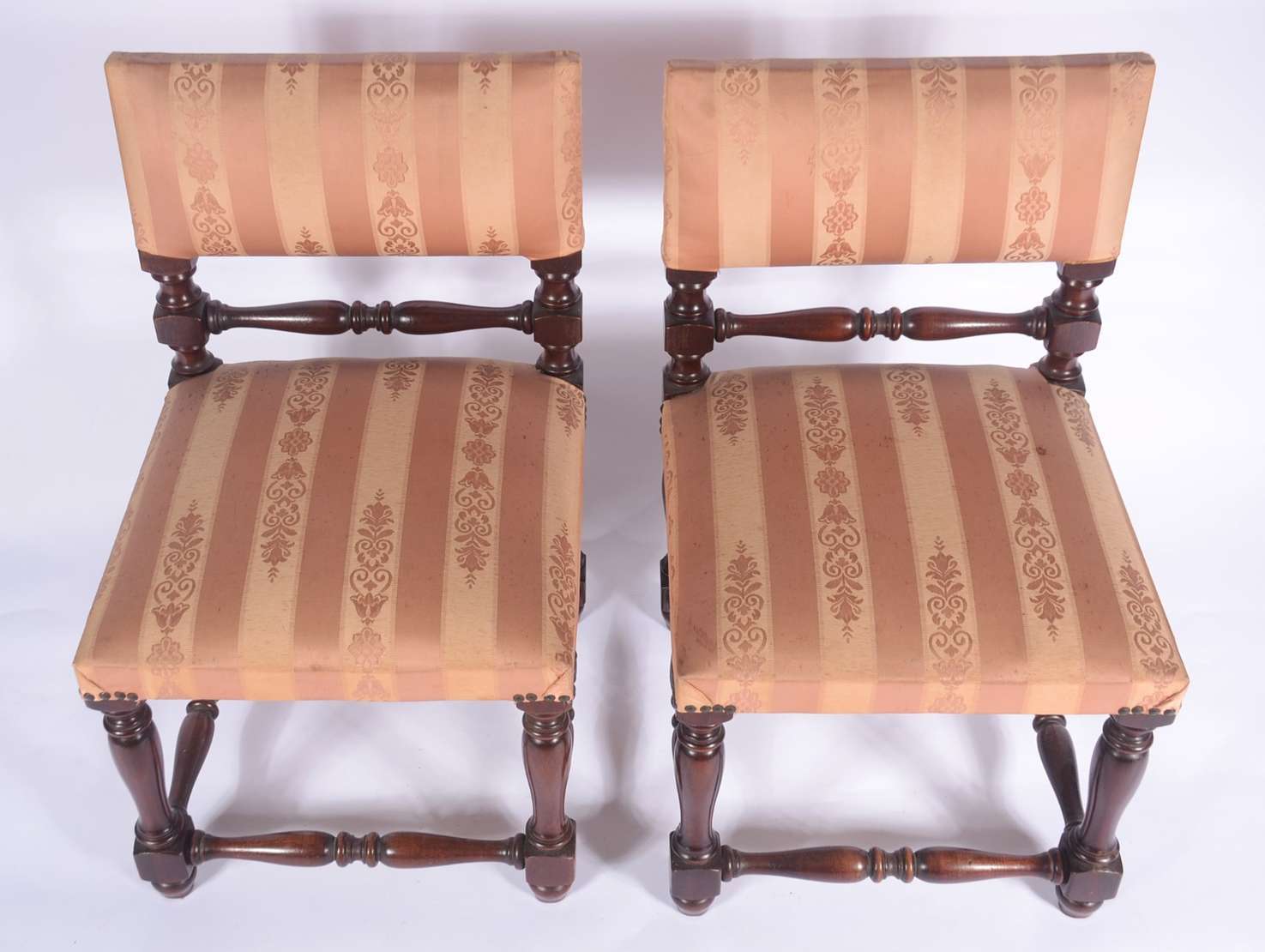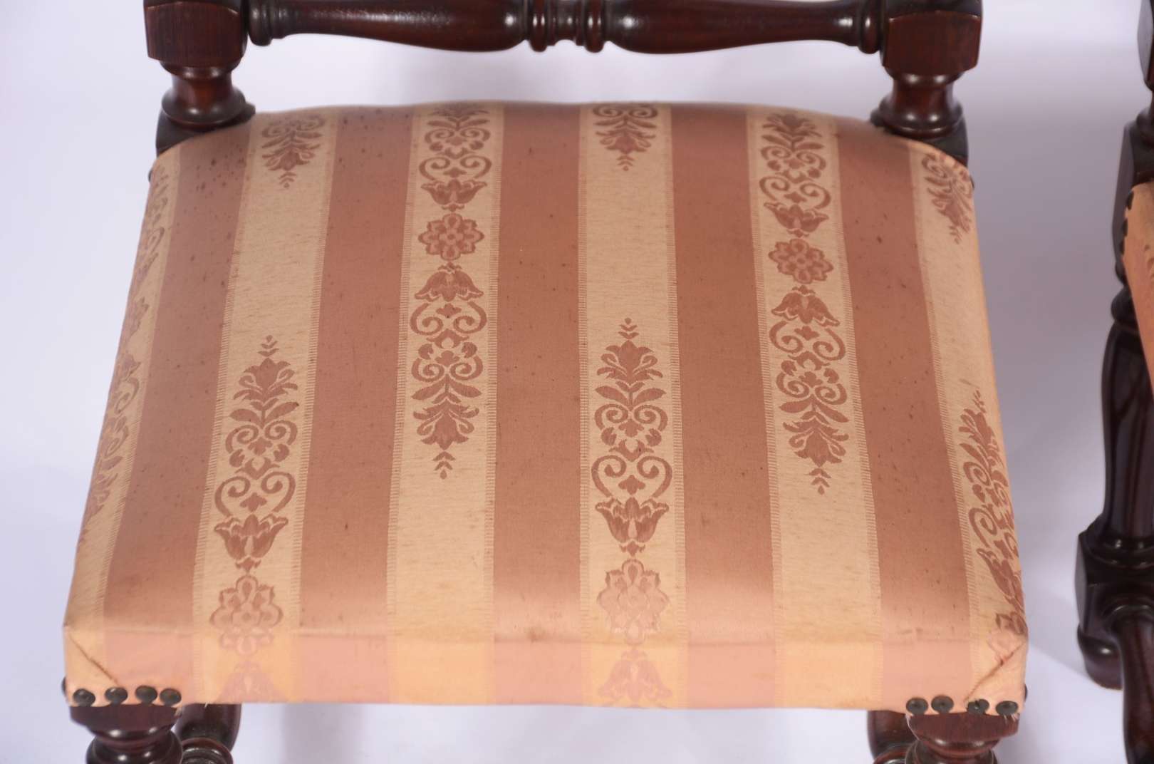 Par de cadeiras de madeira nobre, assentos e encostos forrados em tecido bege com tacheados, detalhes entalhados.