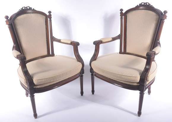Par de cadeiras de madeira nobre, assentos e encostos forrados em tecido bege com tacheados, detalhes entalhados.
