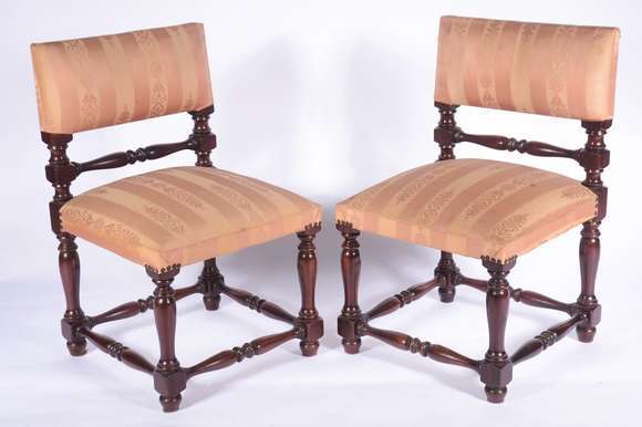 Par de cadeiras baixas de madeira nobre torneada, assentos e encostos forrados e estofados em tecido bege adamascado ...