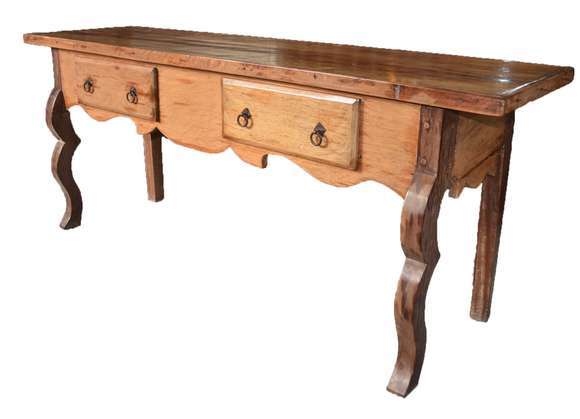 Aparador de madeira clara, 2 gavetas, puxadores de metal, saia recortada.