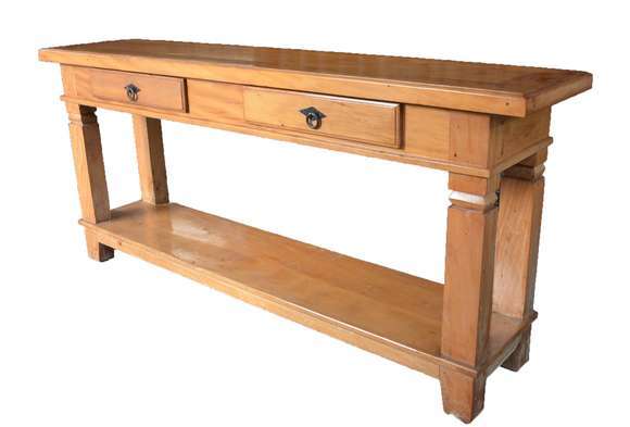 Aparador de madeira clara, platô inferior, 2 gavetas com puxadores de metal.