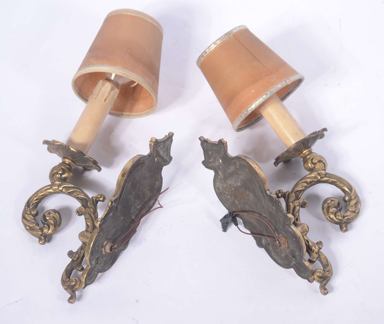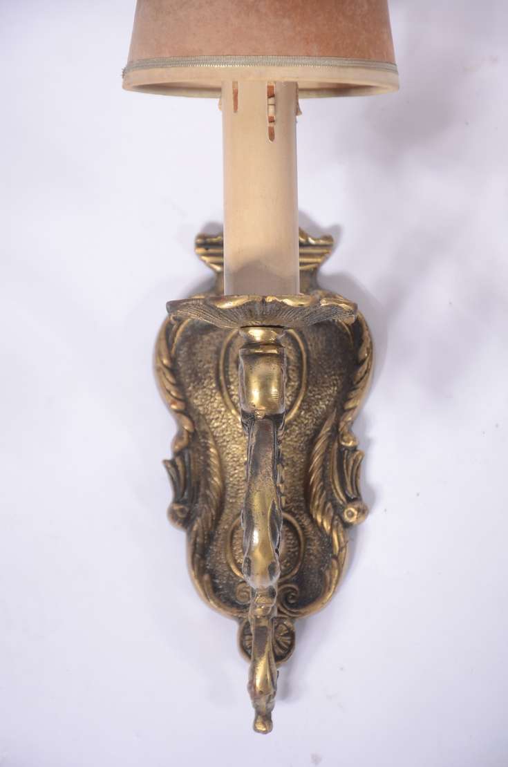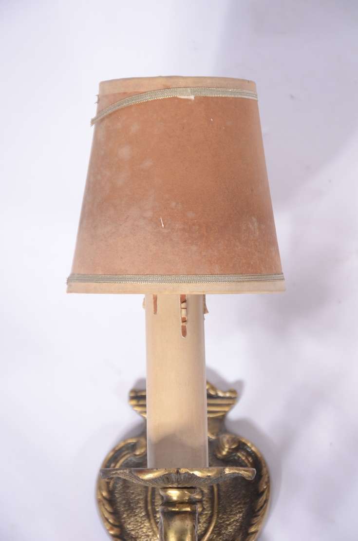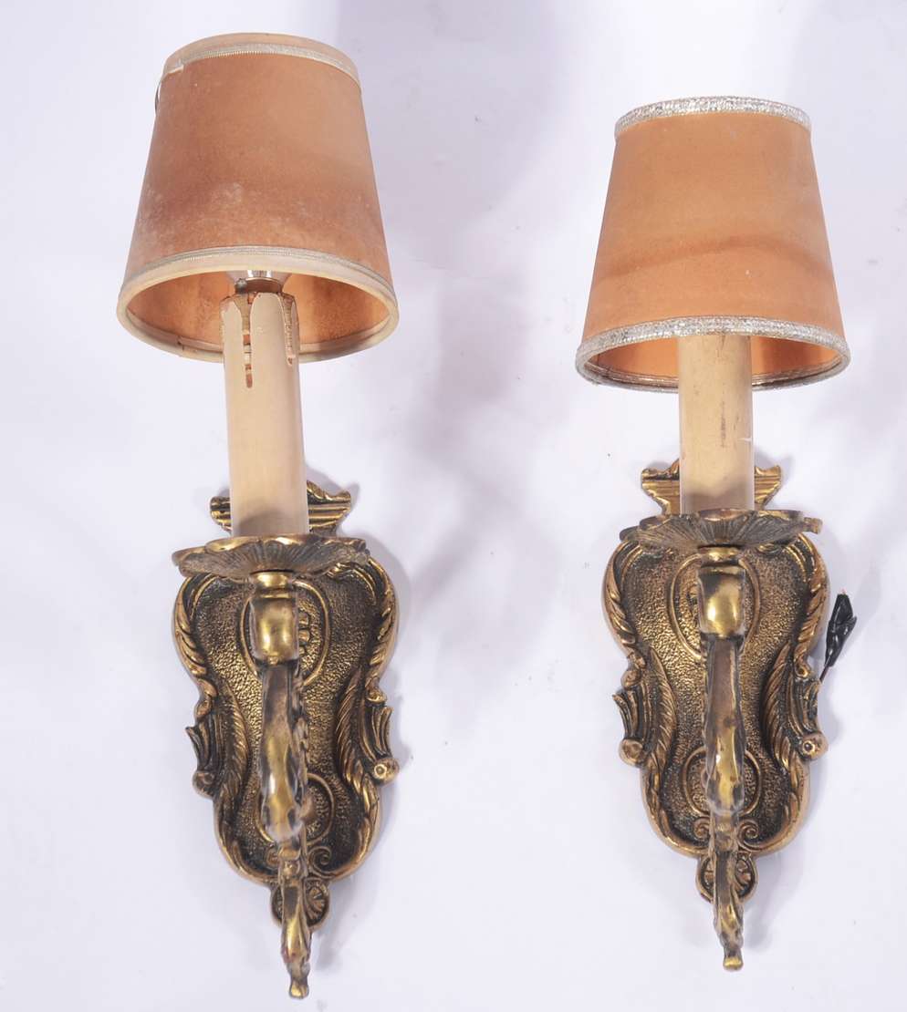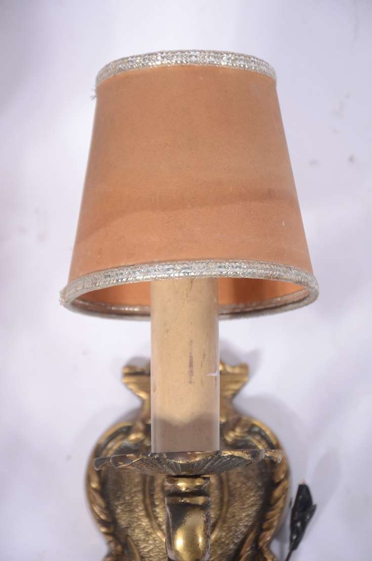 Par de apliques de madeira entalhada e dourada para 2 luzes cada, mangas de pergaminho (pequenos desgastes).