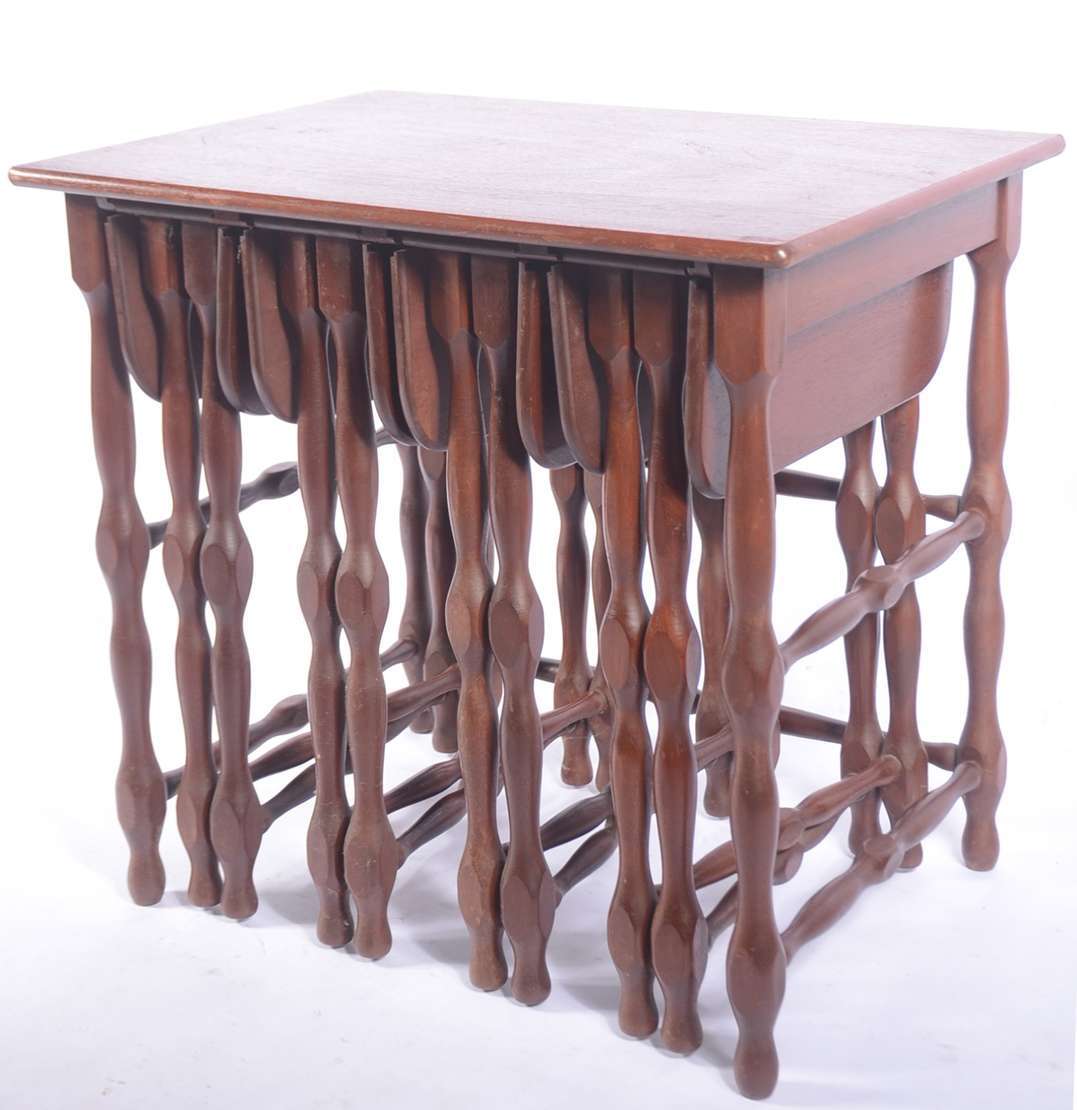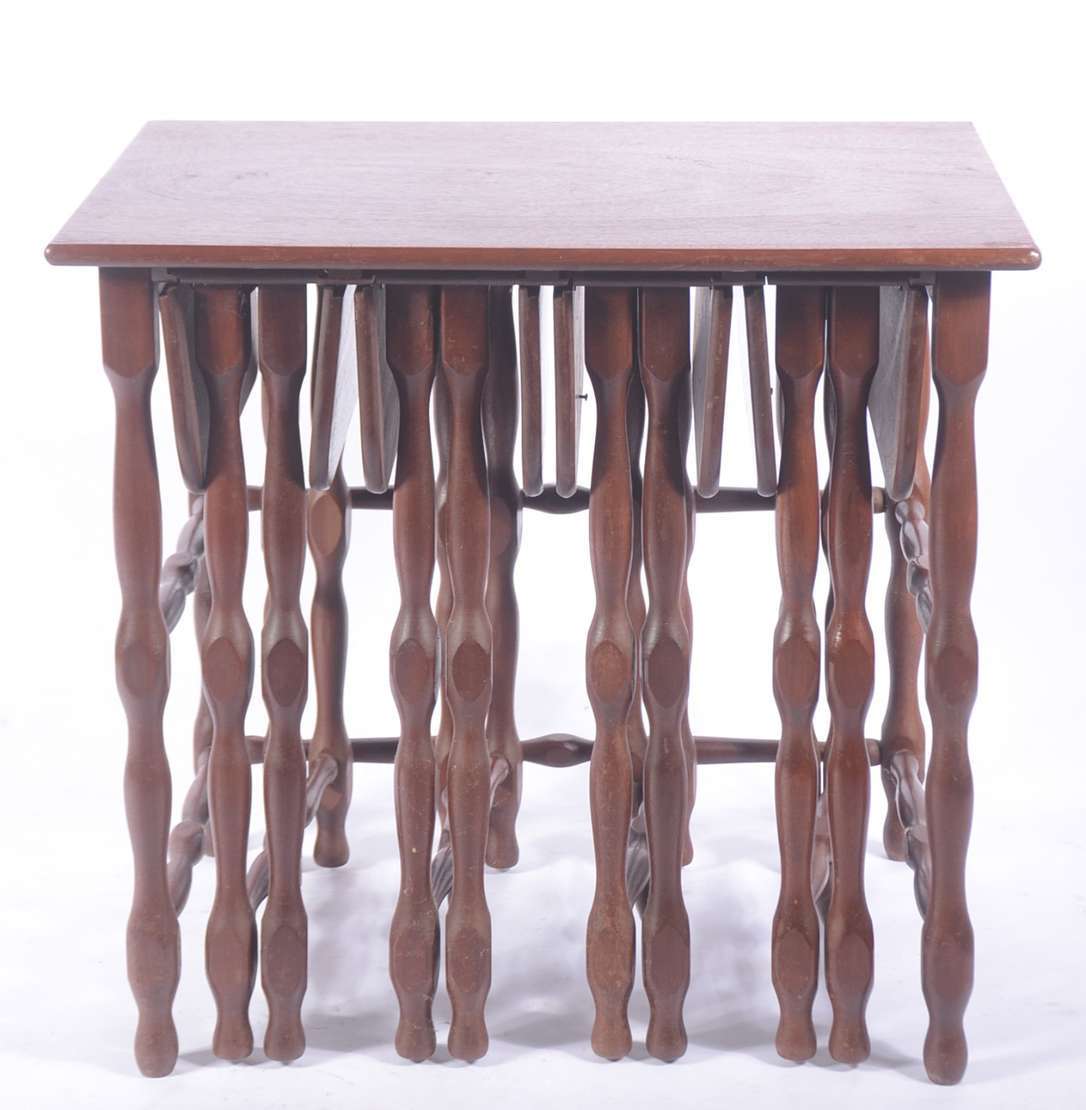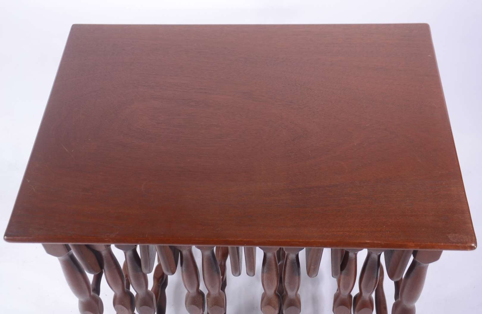 Mesa ninho de madeira nobre com 3 peças de encaixar, tampos de fórmica. Anos 60. Pequenos desgastes nos pés.