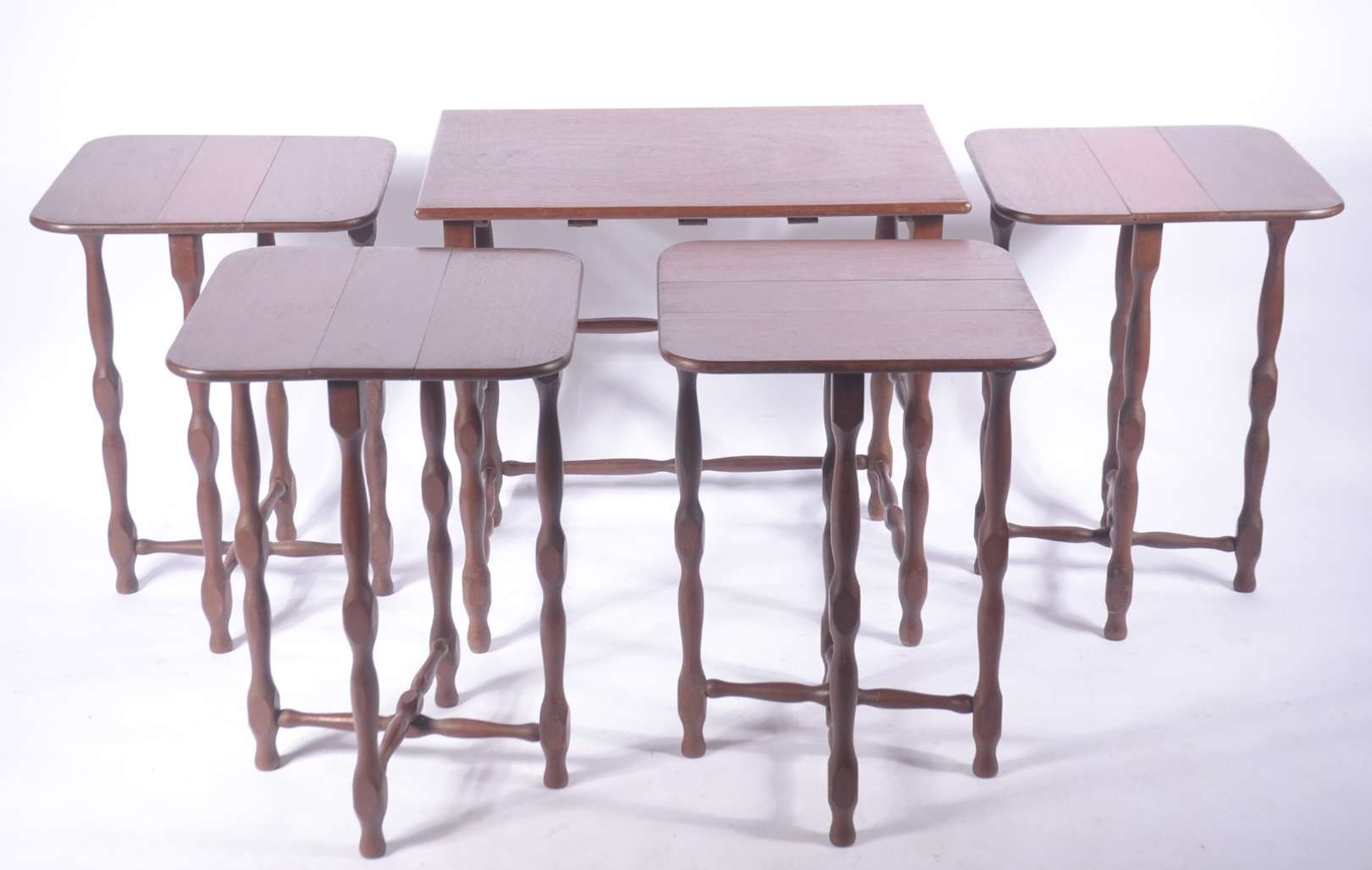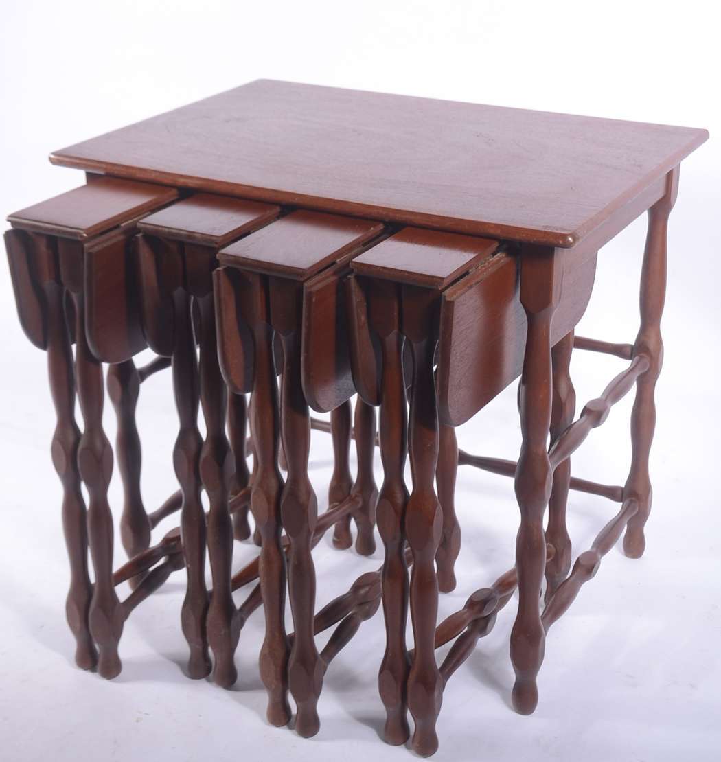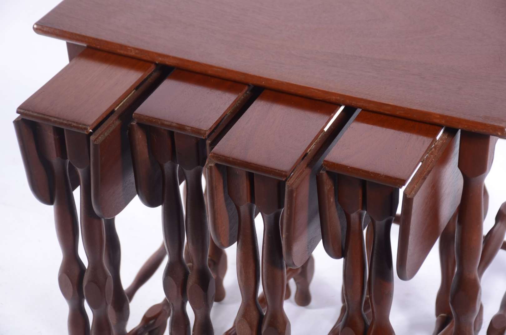 Mesa ninho de madeira nobre com 3 peças de encaixar, tampos de fórmica. Anos 60. Pequenos desgastes nos pés.