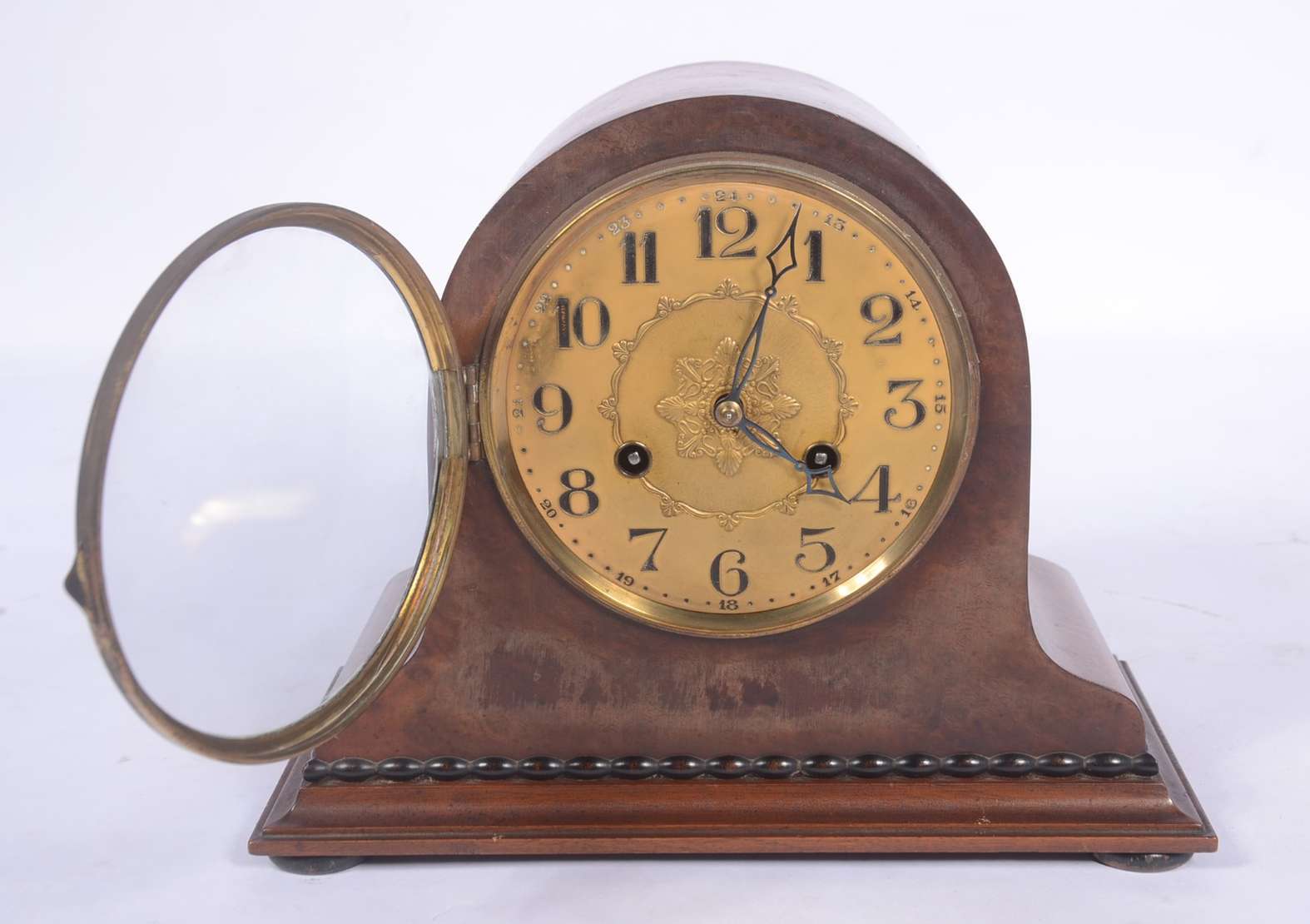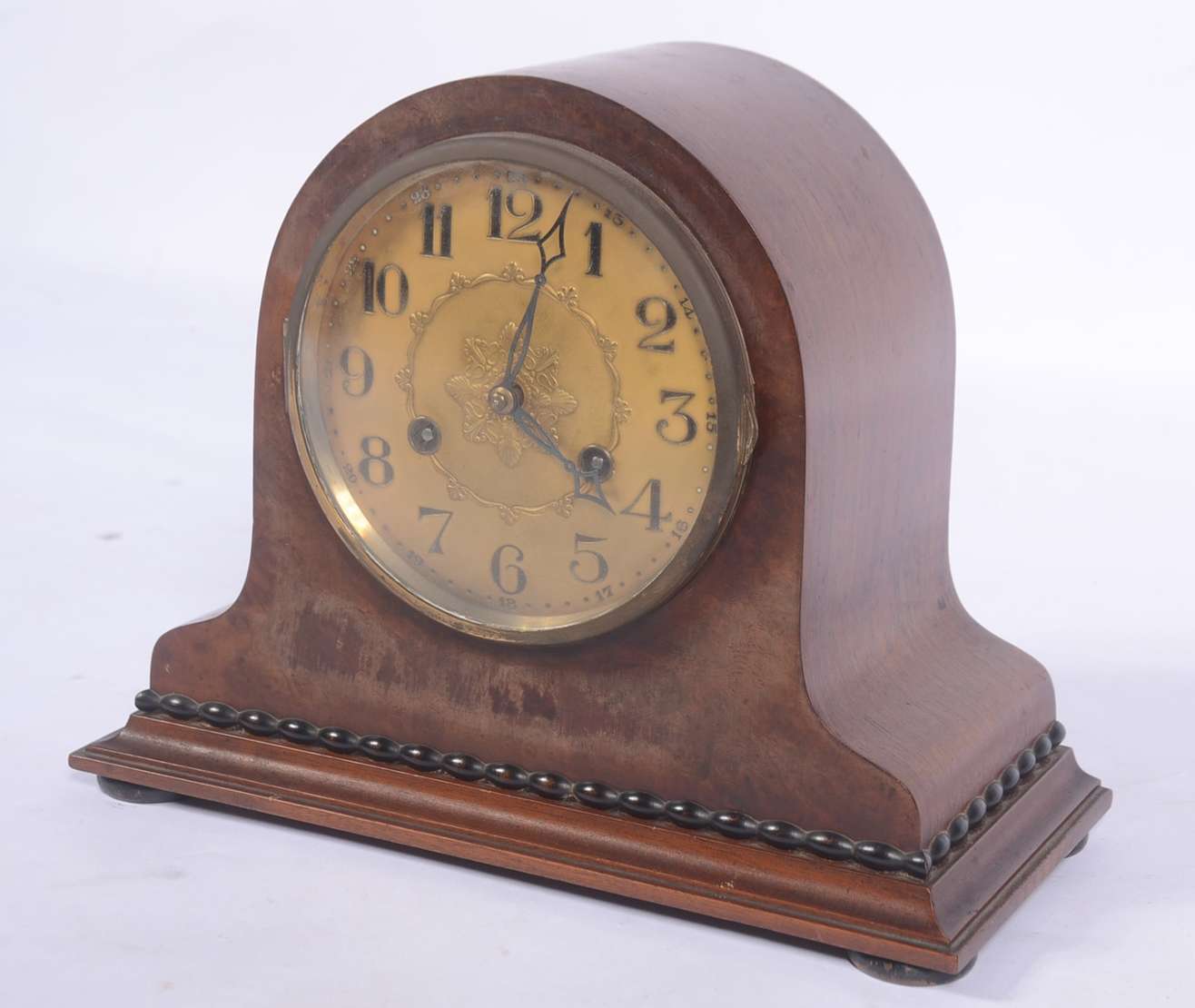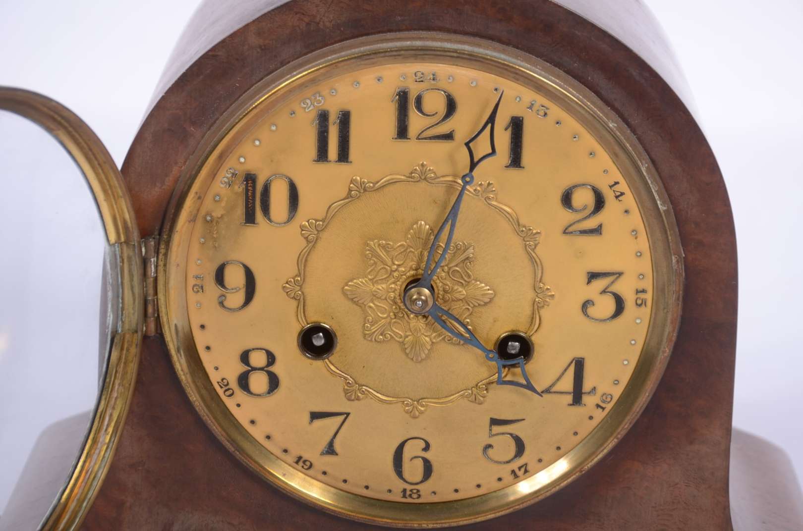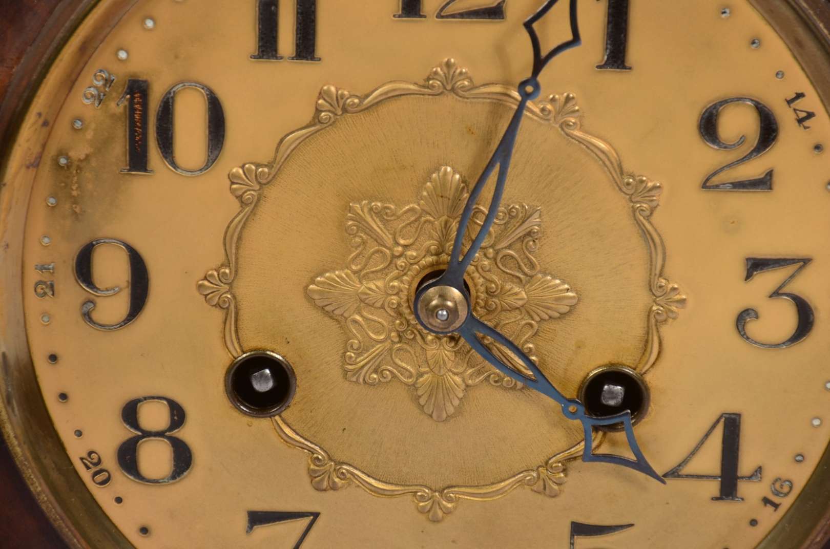 Relógio de mesa com caixa de madeira trabalhada em marqueterie. Funcionando. Desgastes e caixa com pequenos pontos de...