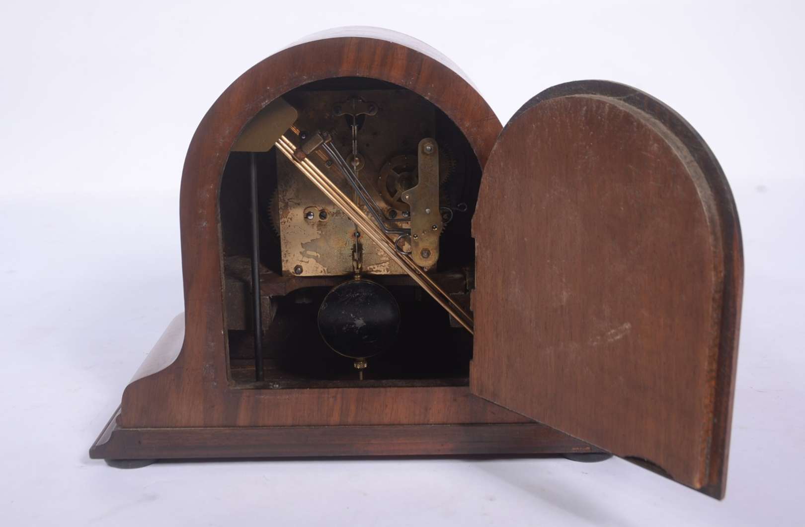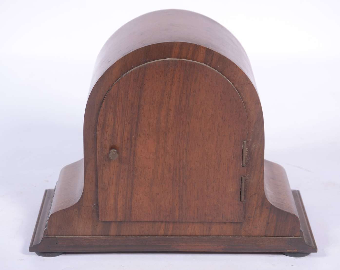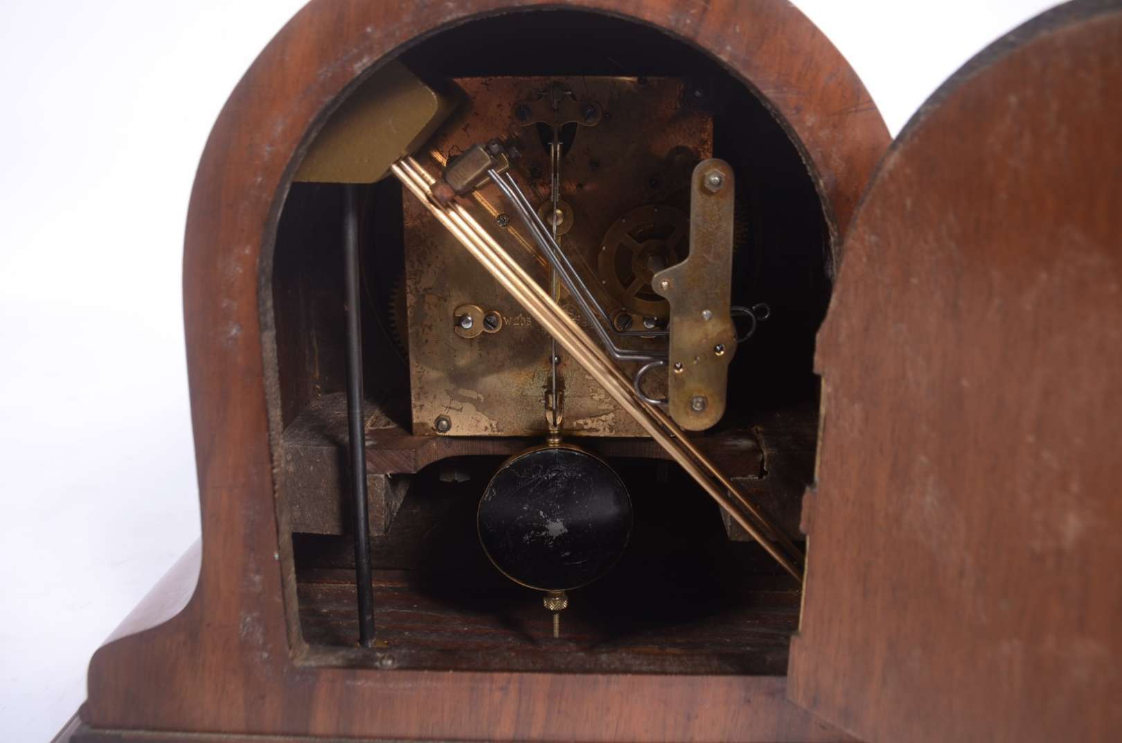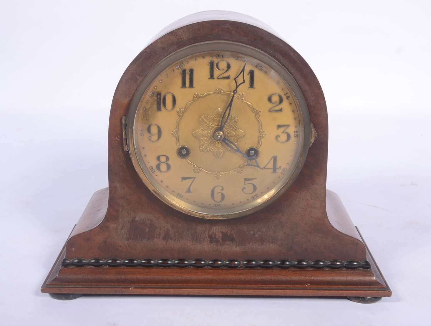 Relógio de mesa com caixa de madeira trabalhada em marqueterie. Funcionando. Desgastes e caixa com pequenos pontos de...